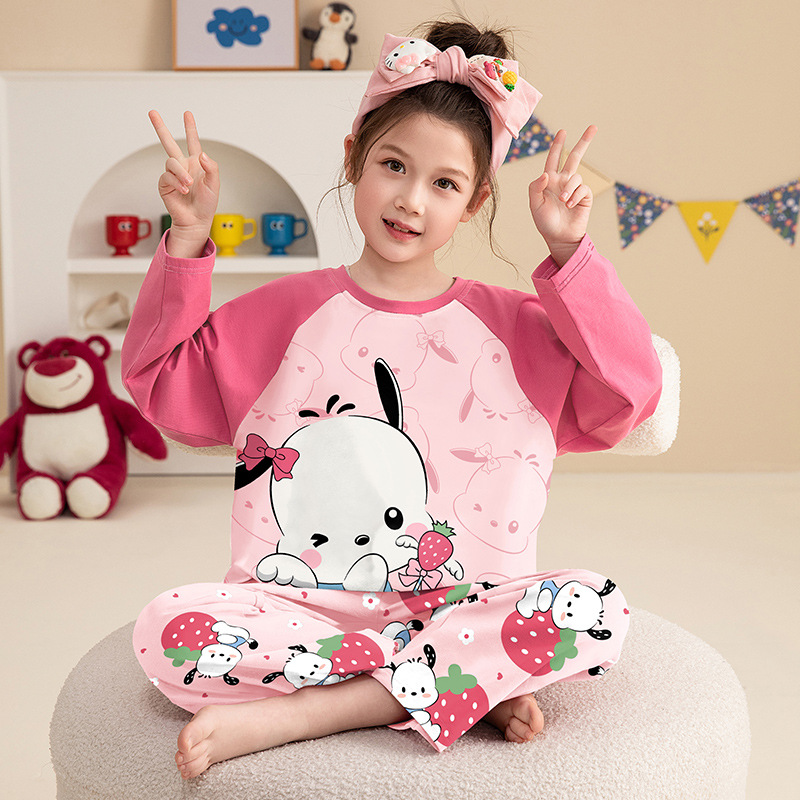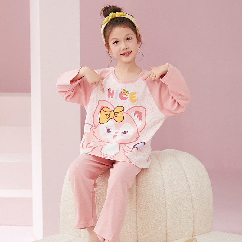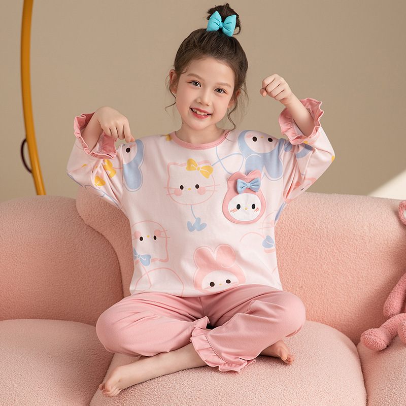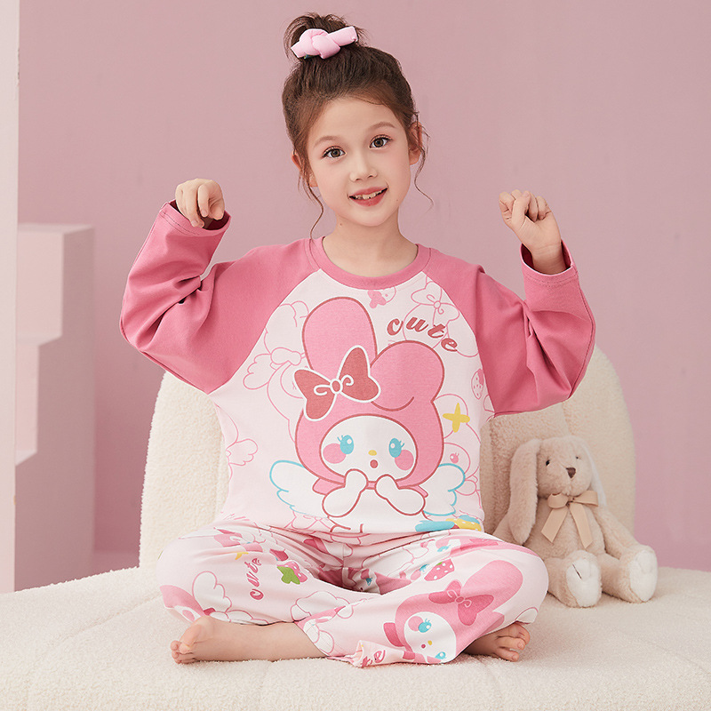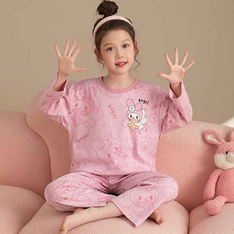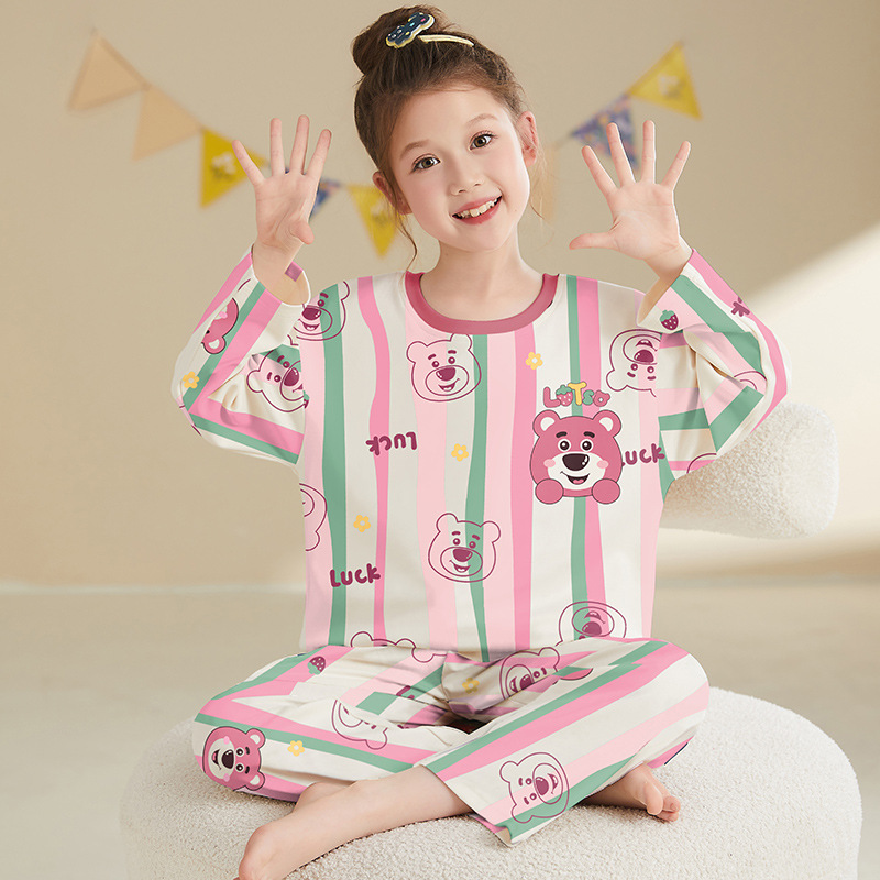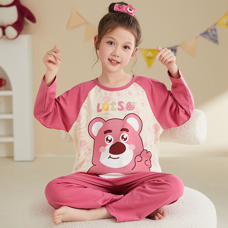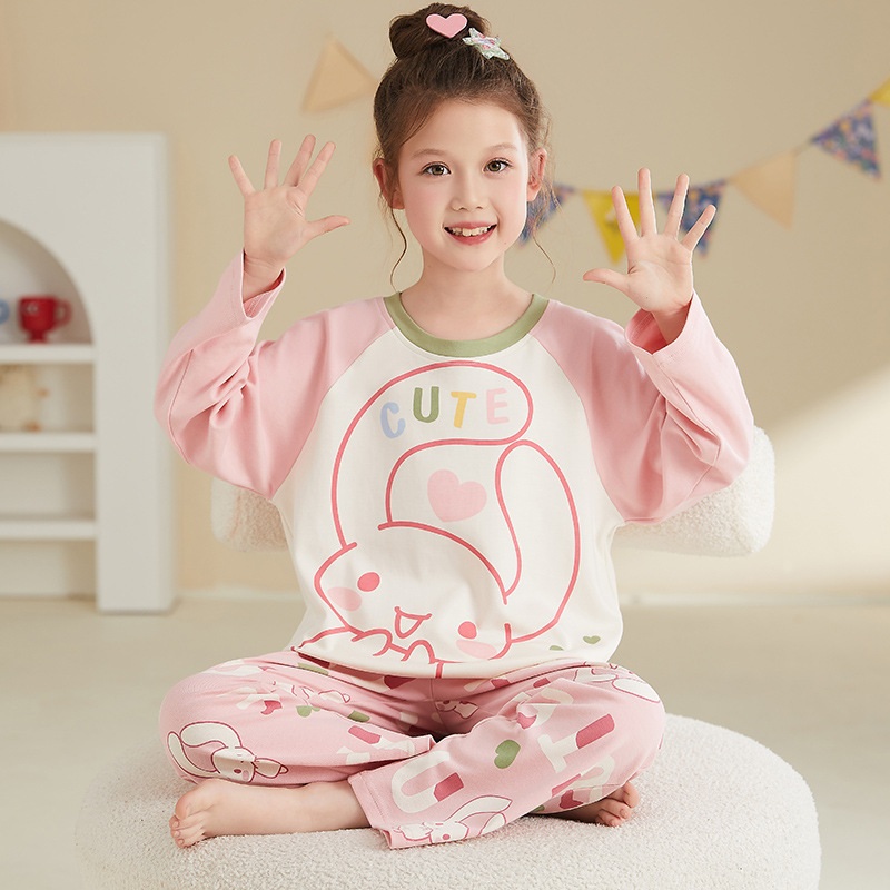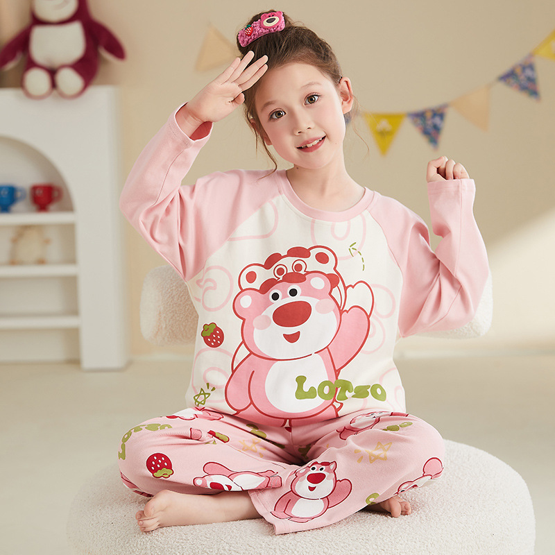 소녀 잠옷 2024 봄과 가을면 긴 소매 아기 소녀 귀여운 인터넷 축하 만화 세트 어린이 홈 옷스토어 가기