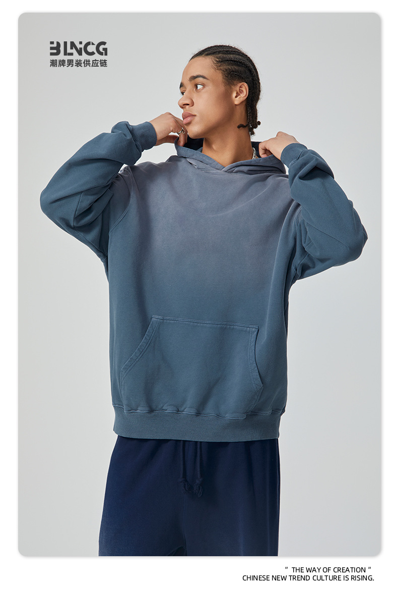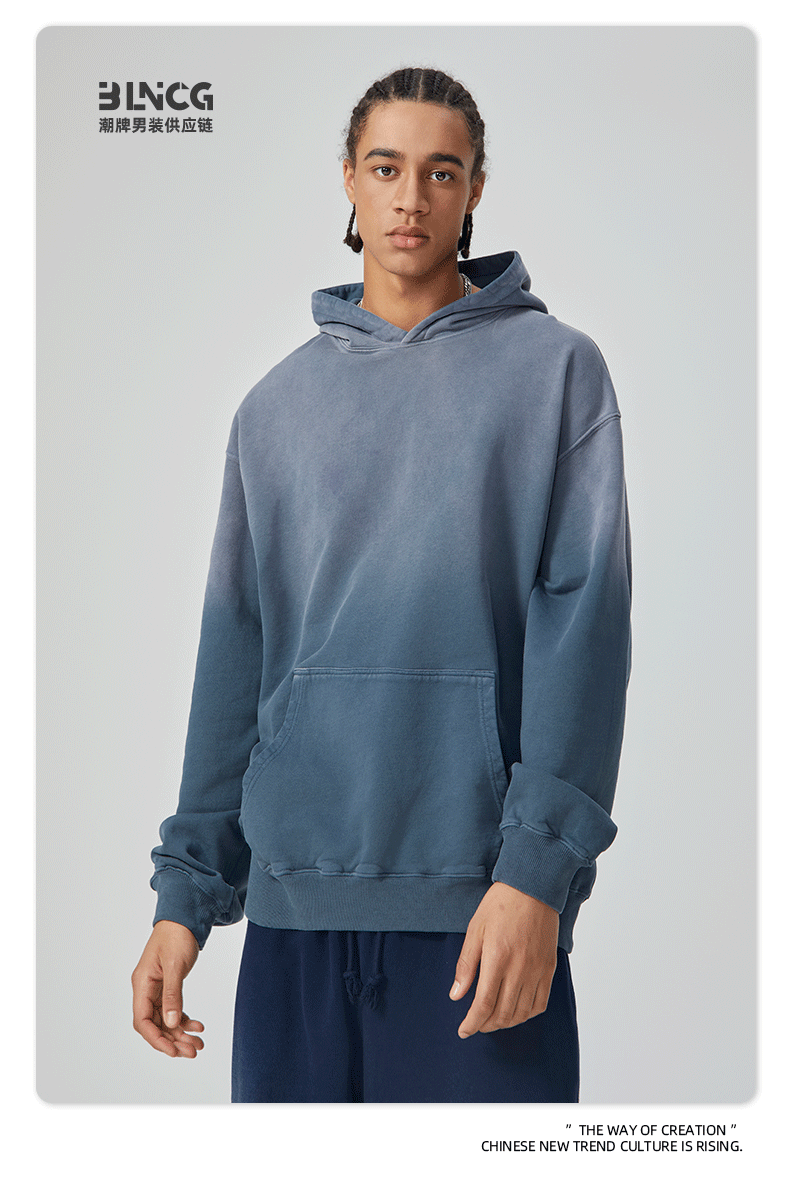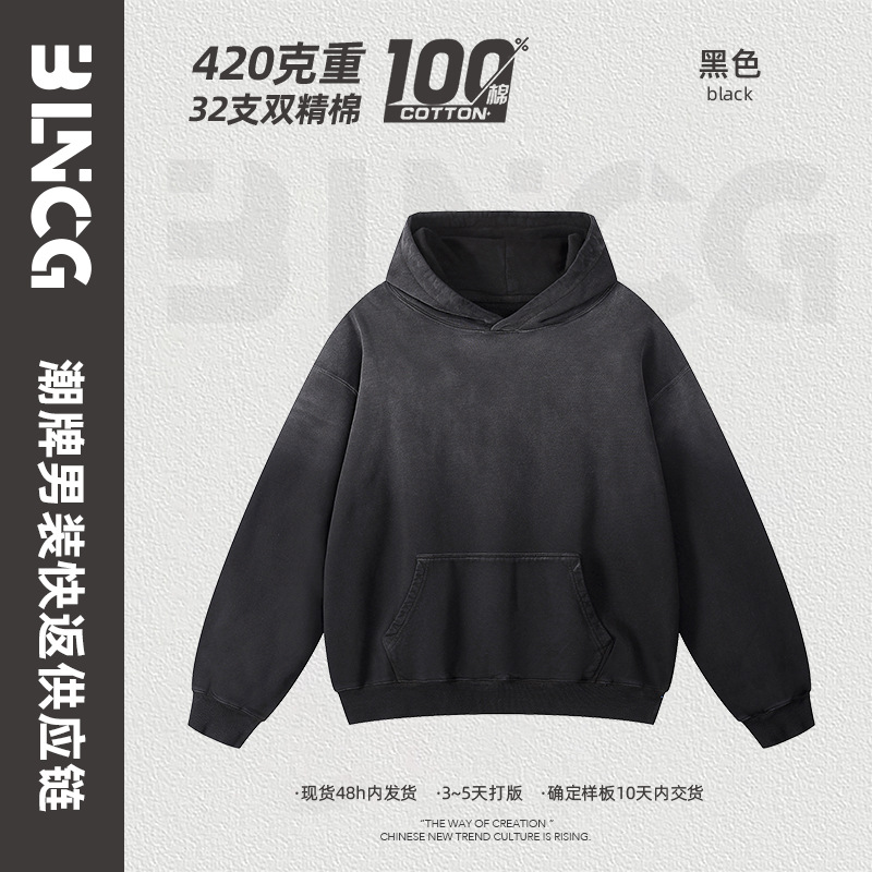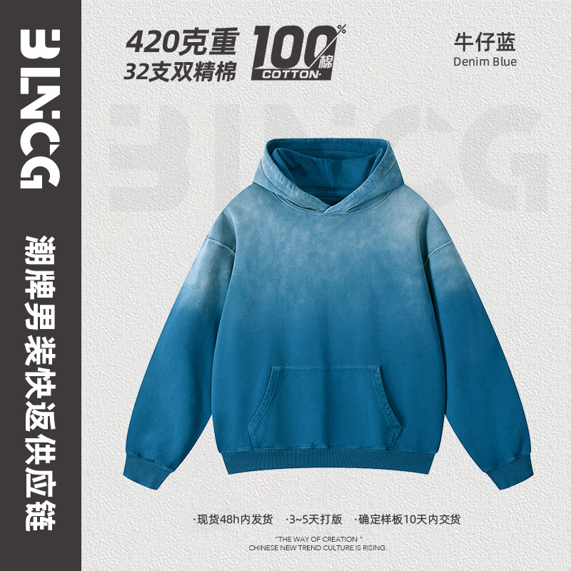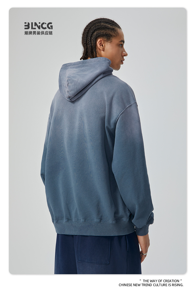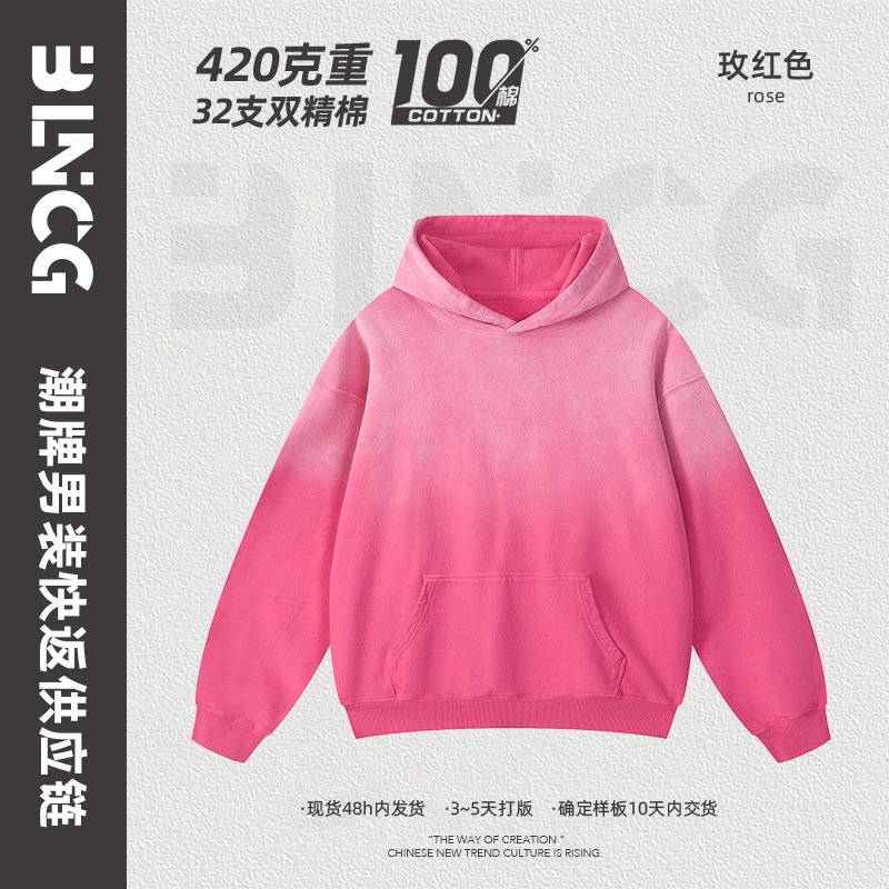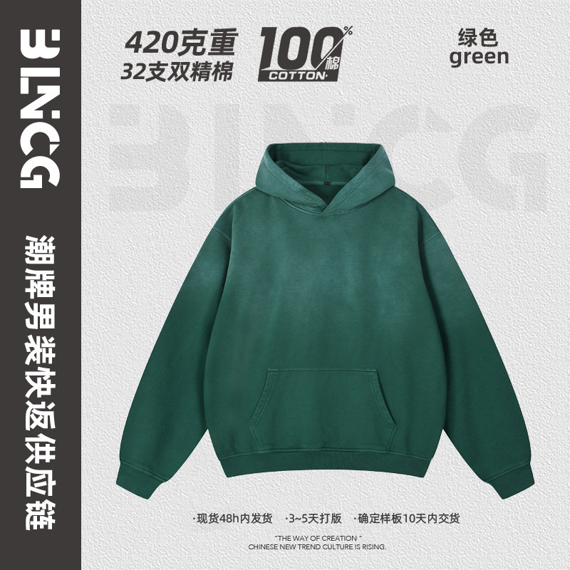 BG 트렌디 브랜드 아메리칸 스타일 420g 순면 헤비 워시 후드 티셔츠 레트로 그라데이션 스프레이 말 조각 염색 재킷