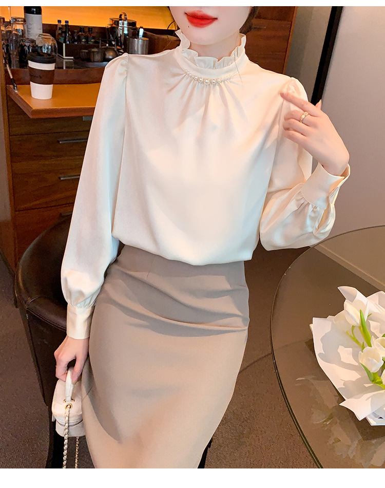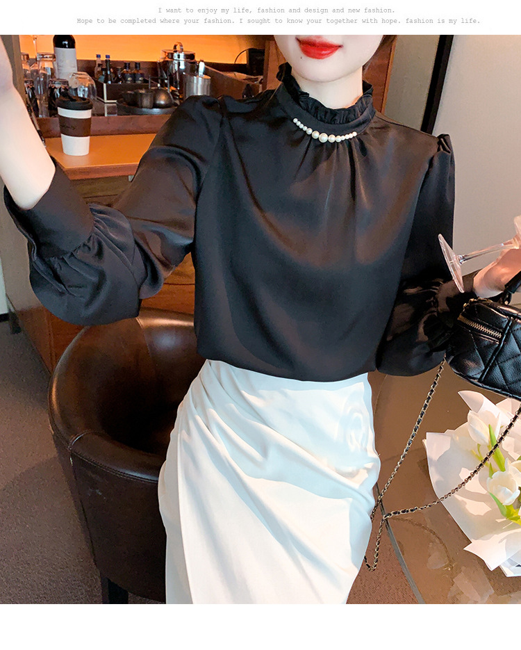 프렌치 스탠드 칼라 비즈 쉬폰 탑 2025 봄, 가을 새로운 스타일 서양식 셔츠 여성을위한 슈퍼 요정 달콤한 곰팡이 셔츠