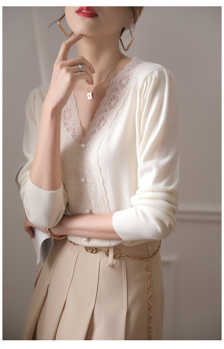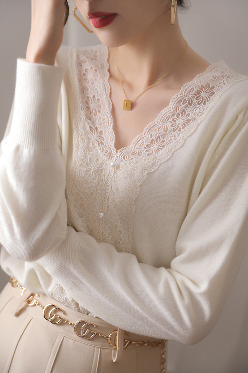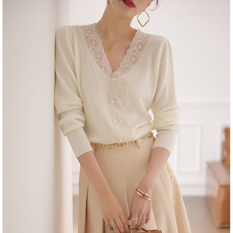 여성 도매 새로운 2025 가을, 겨울 패션 프랑스 슬림 탑 v 넥 레이스 스플 라이스 스웨터 여성 긴 소매스토어 가기
