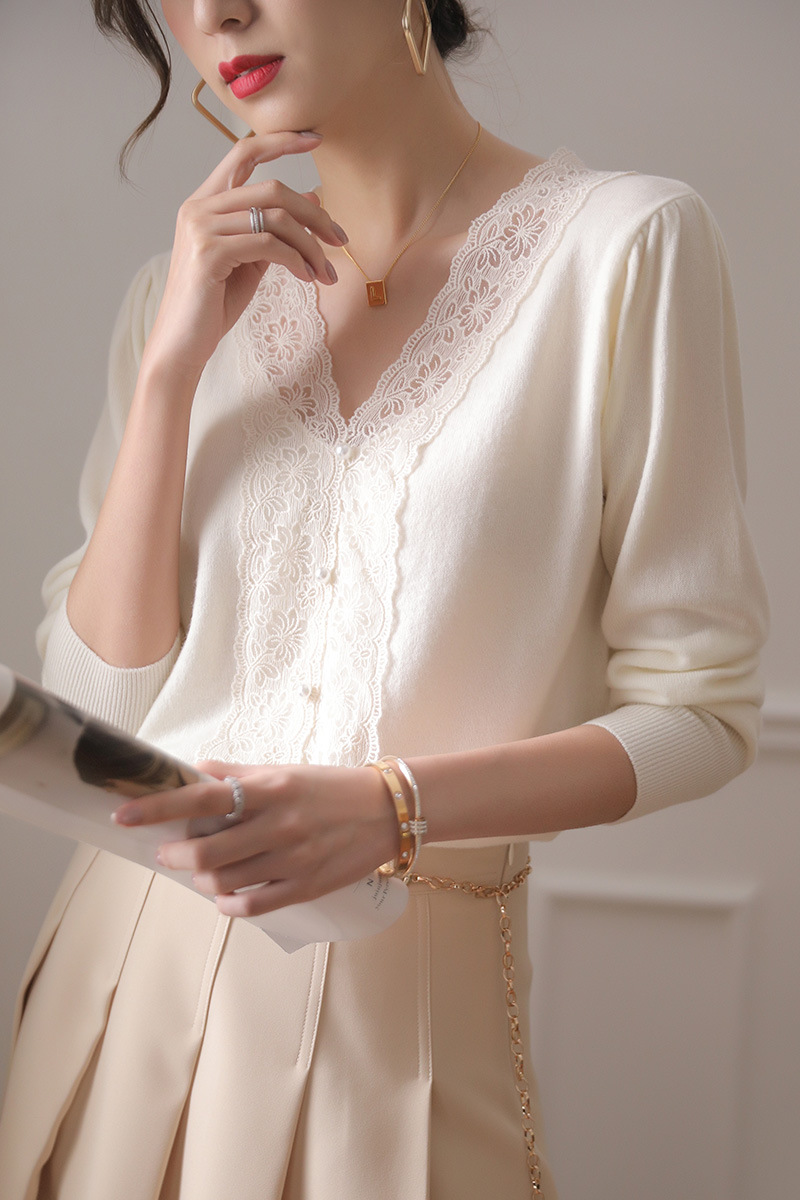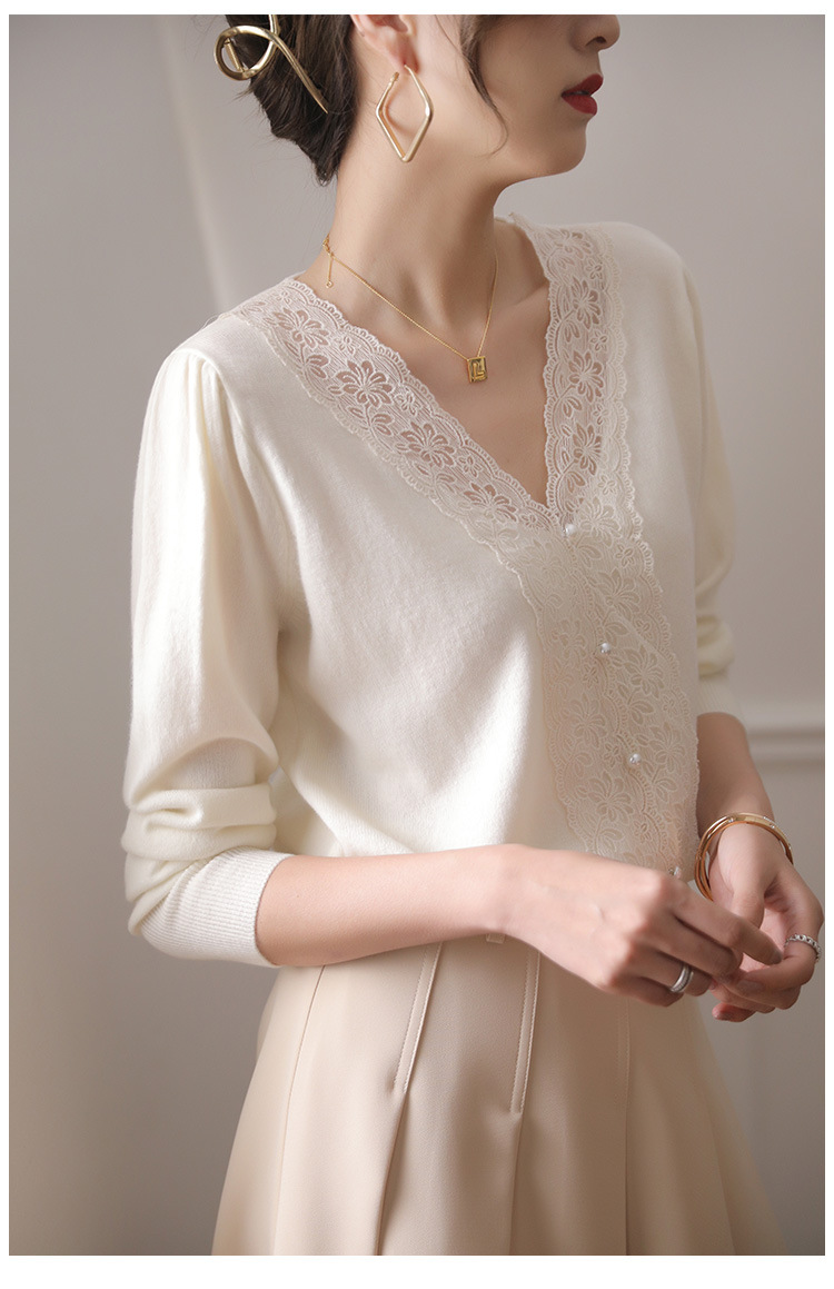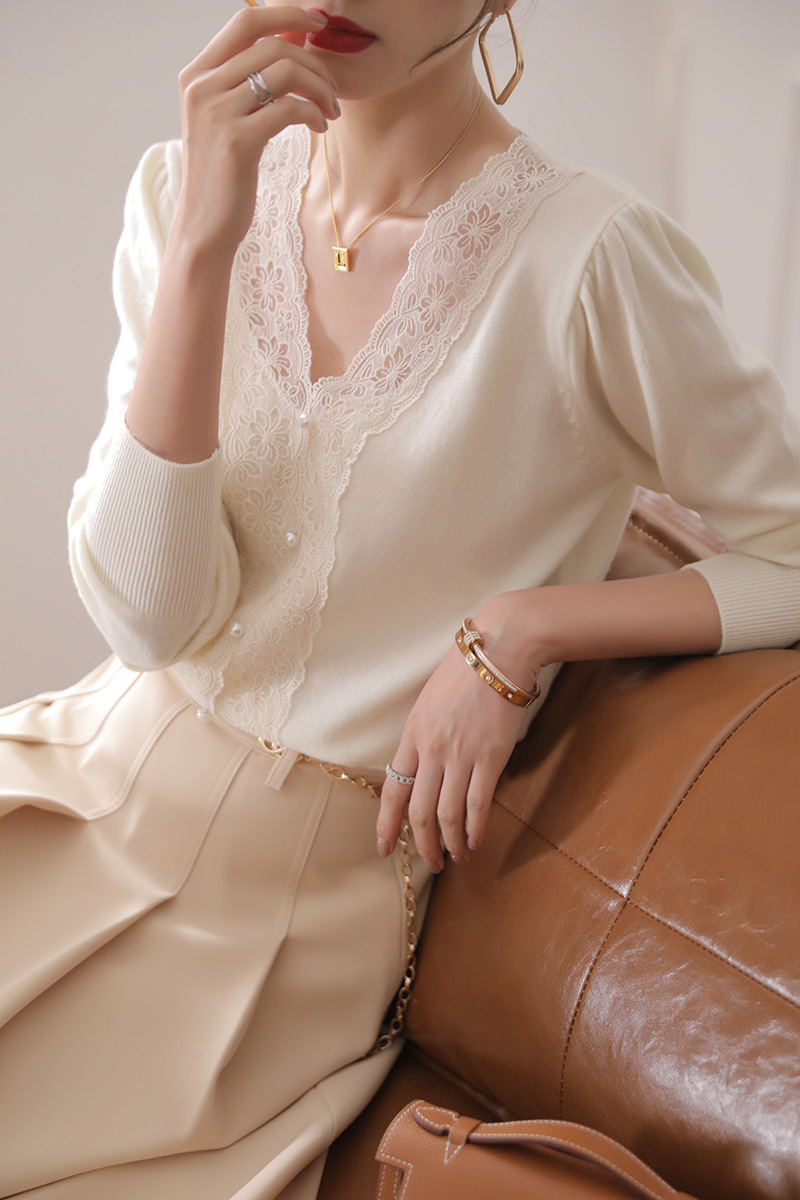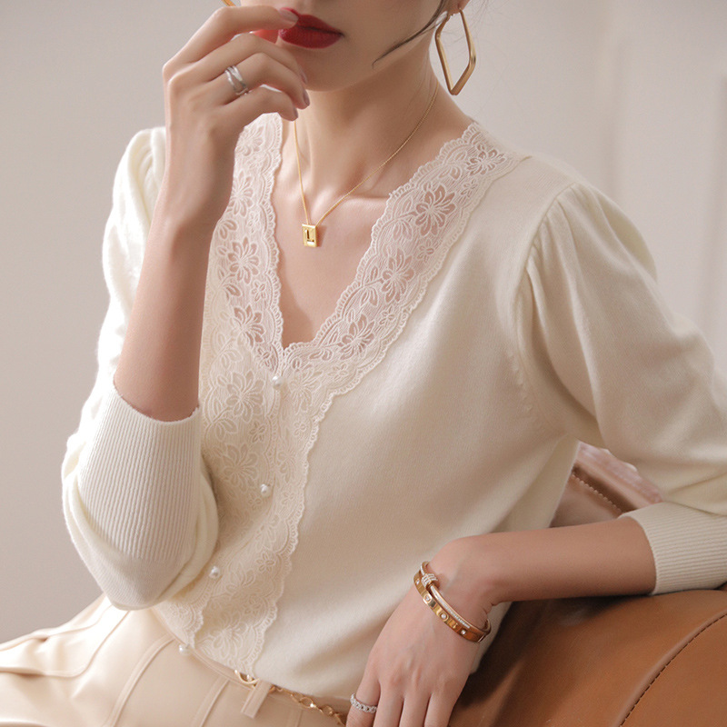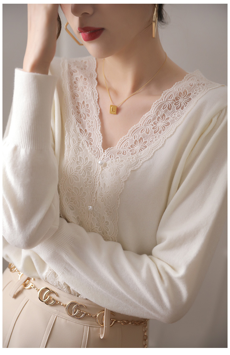 여성 도매 새로운 2025 가을, 겨울 패션 프랑스 슬림 탑 v 넥 레이스 스플 라이스 스웨터 여성 긴 소매
