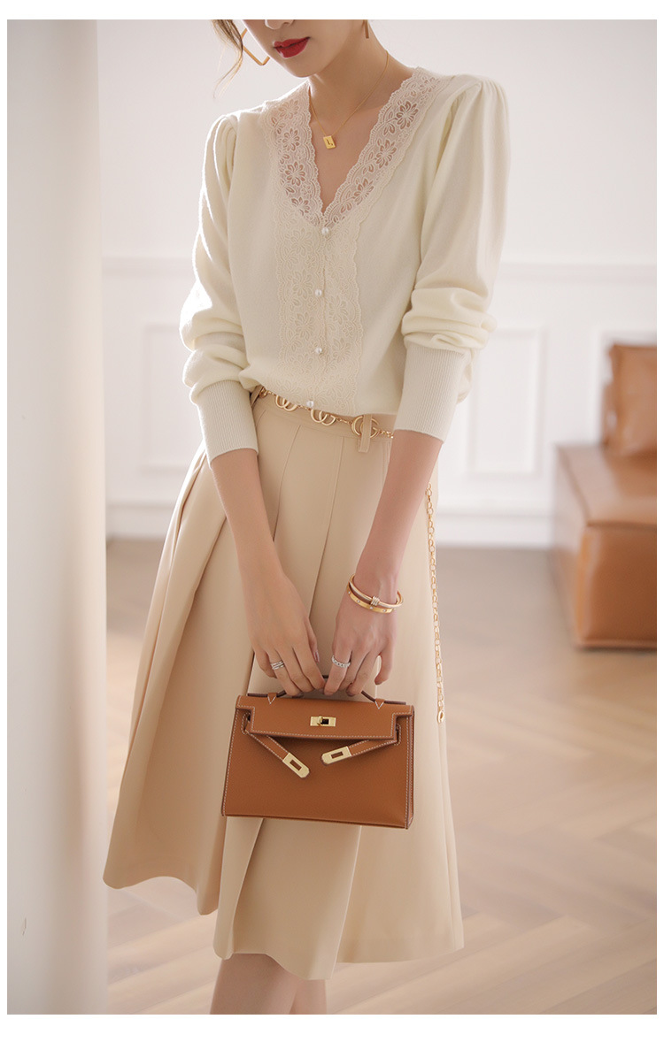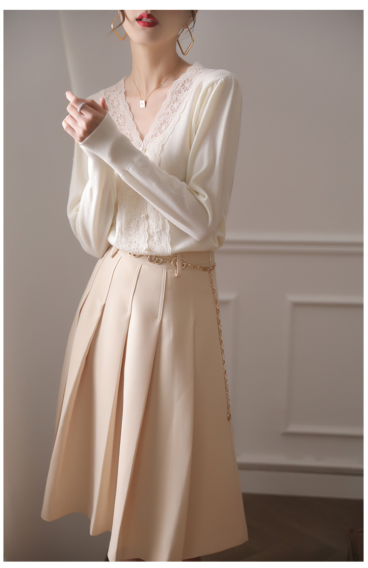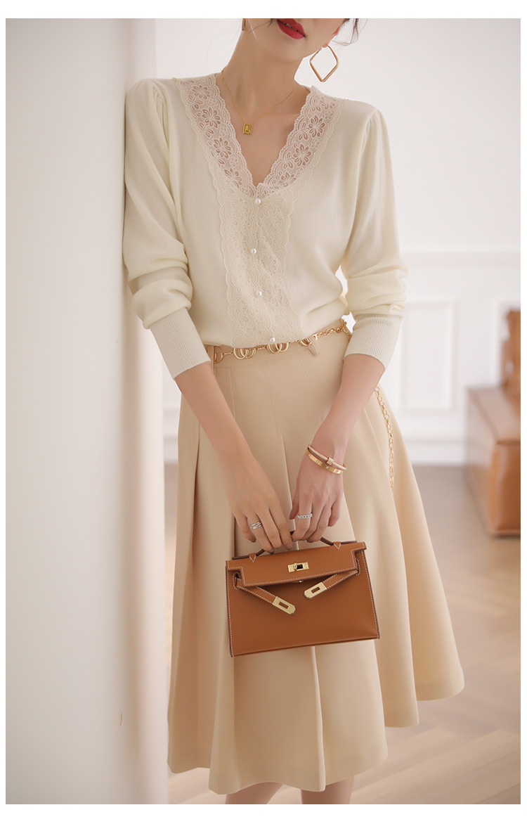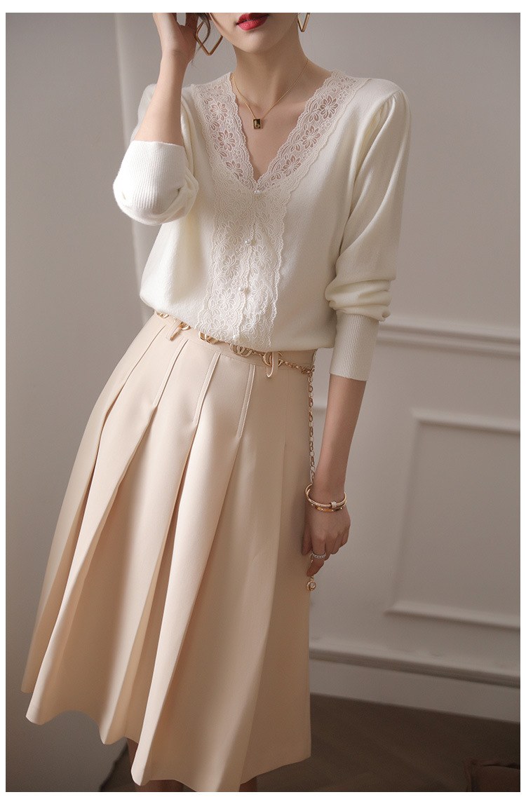 여성 도매 새로운 2025 가을, 겨울 패션 프랑스 슬림 탑 v 넥 레이스 스플 라이스 스웨터 여성 긴 소매