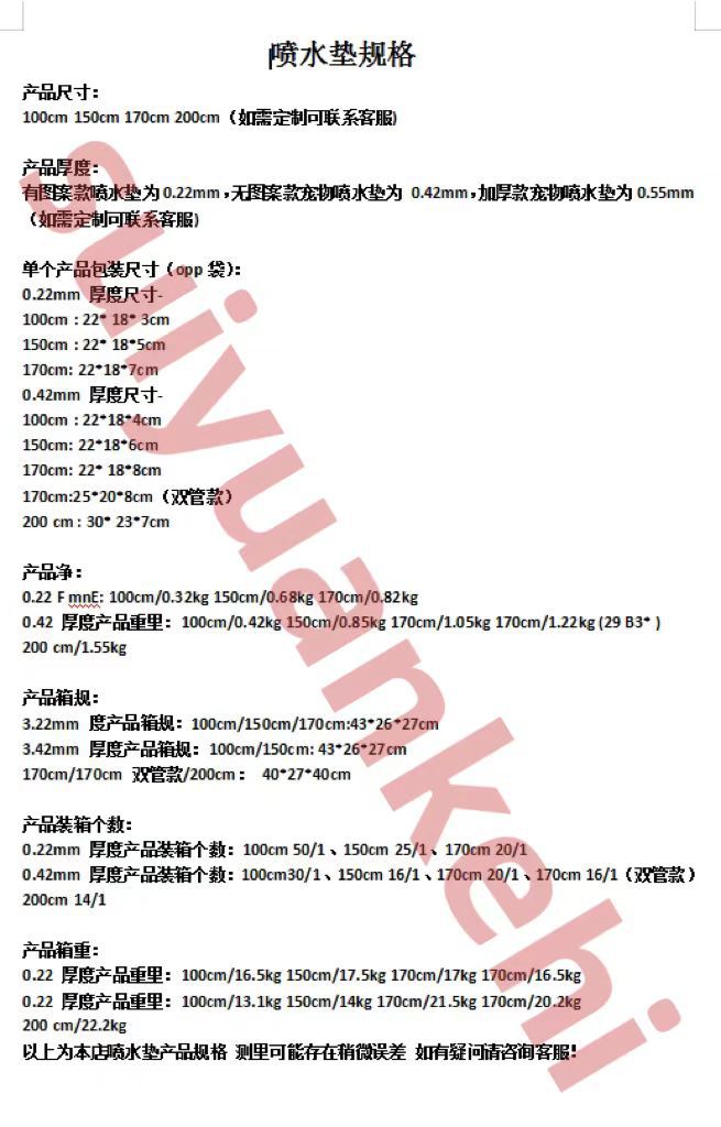 产品厚度:有图案款喷水垫为0.22mm,无图案款宠物喷水垫为0.42mm,加厚款宠物喷水垫为0.55mm,如需定制可联系客服