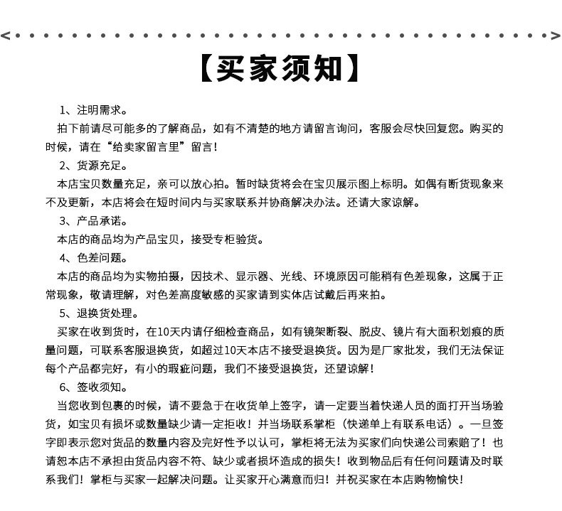 拍下前请尽可能多的了解商品,如有不清楚的地方请留言询问,客服会尽快回复您。有特殊要求的请在订单上留言。
