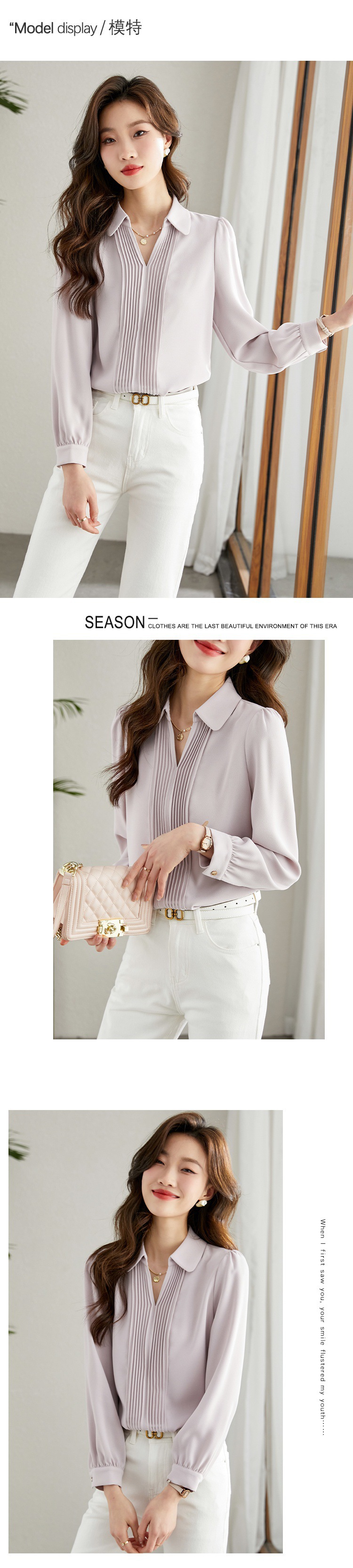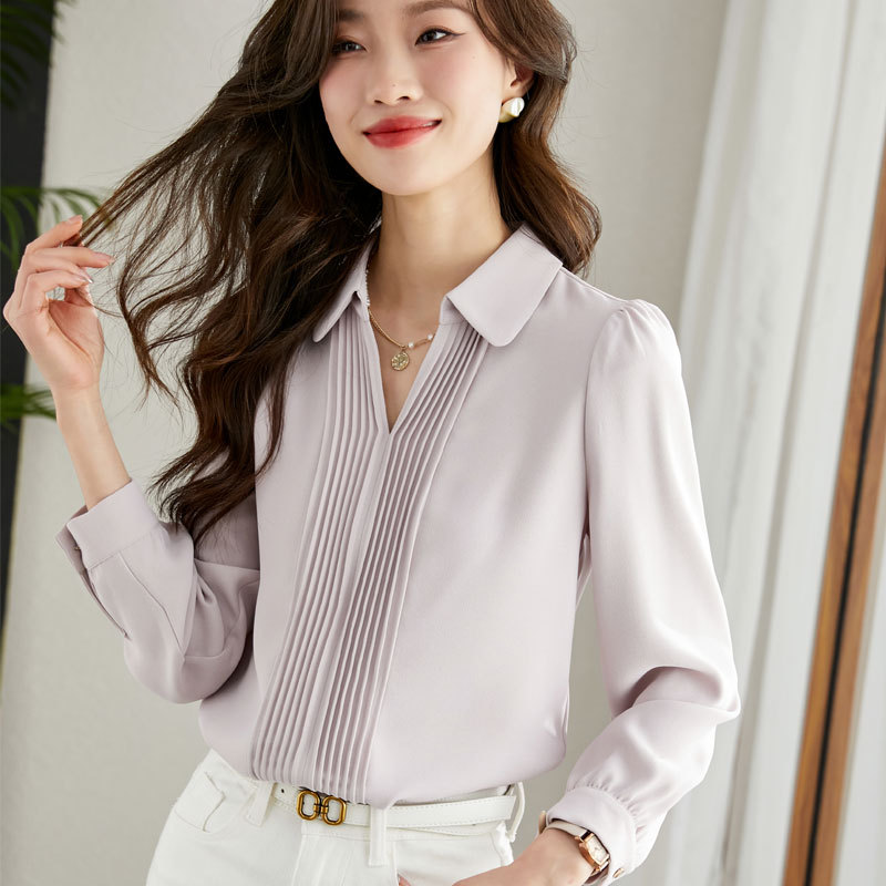 진짜 샷 한국 기질 긴 소매 쉬폰 셔츠 여성의 2024 가을 새로운 패션 시대-느슨한 단색 셔츠 감소