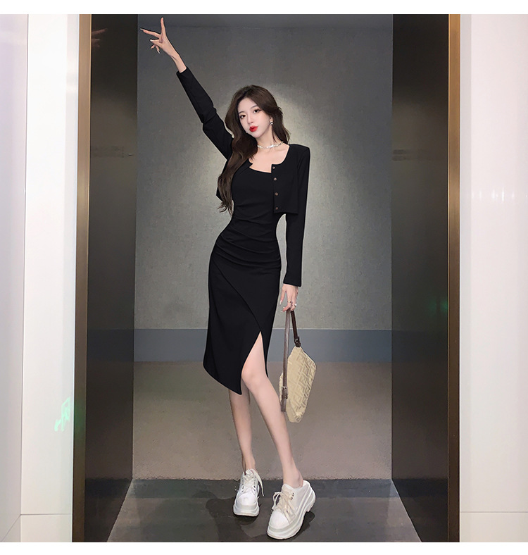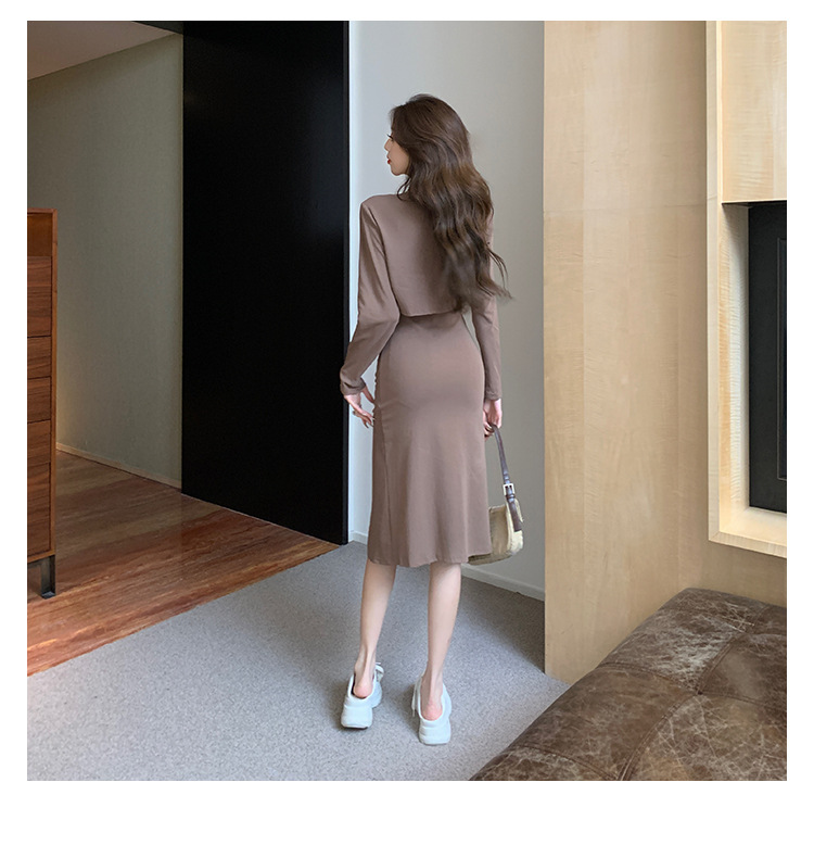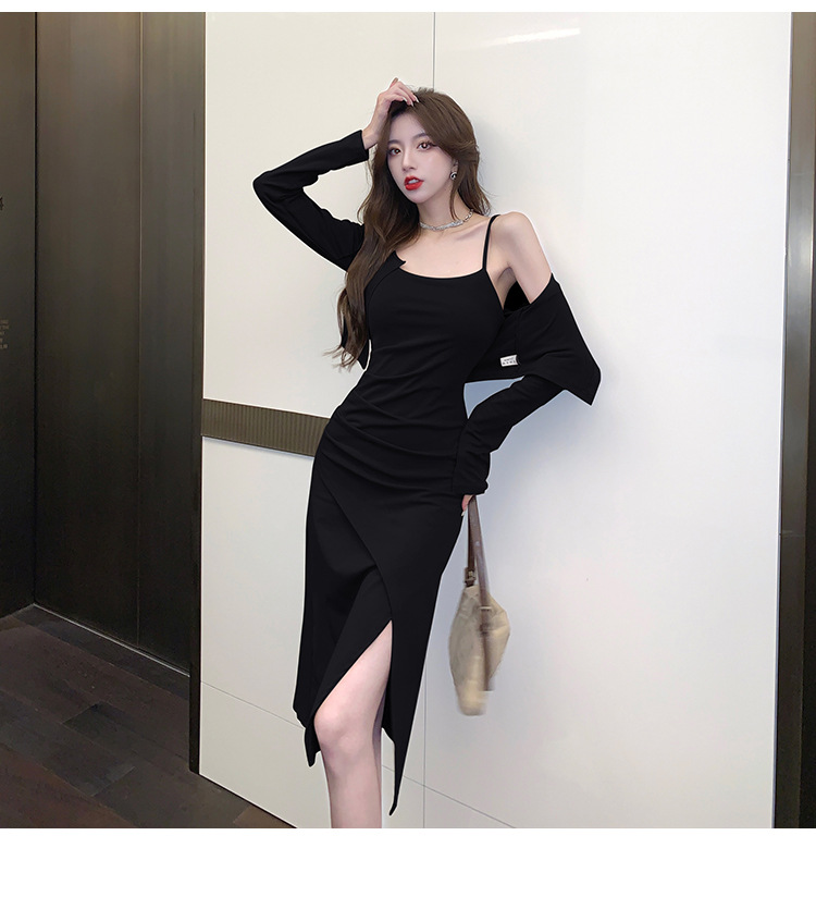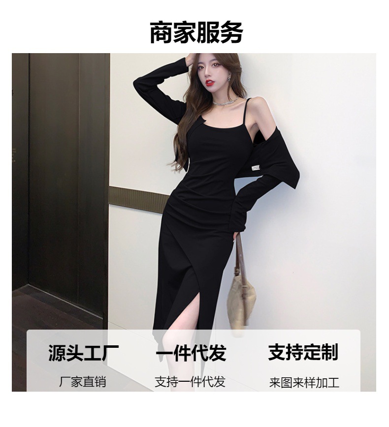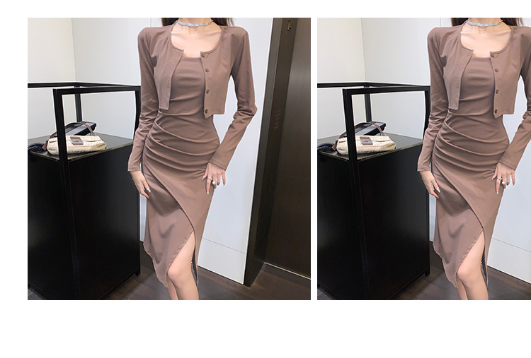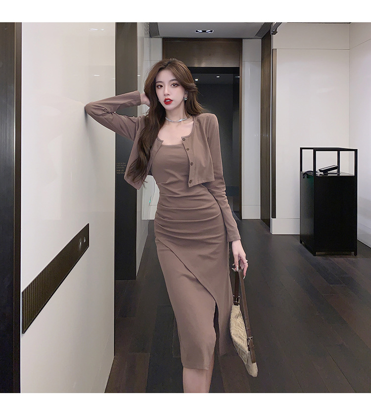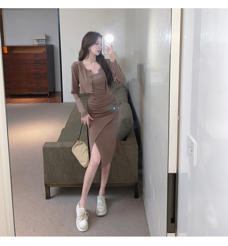 가벼운 성숙한 바람 유지 투피스 세트 봄과 가을 여성 디자인 센스 카디건 탑 불규칙한 분할 슬링 원피스