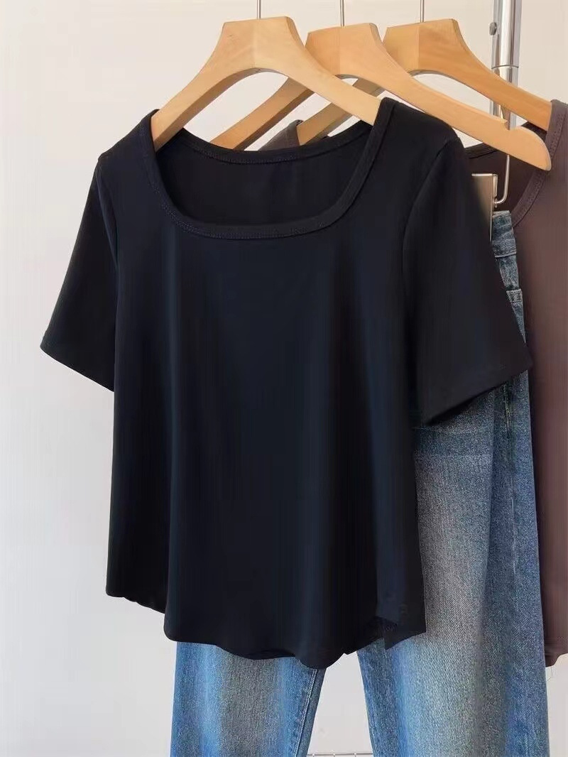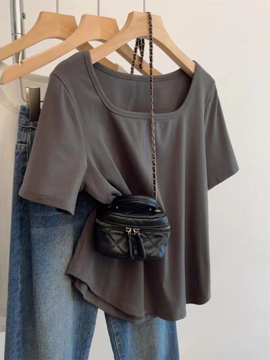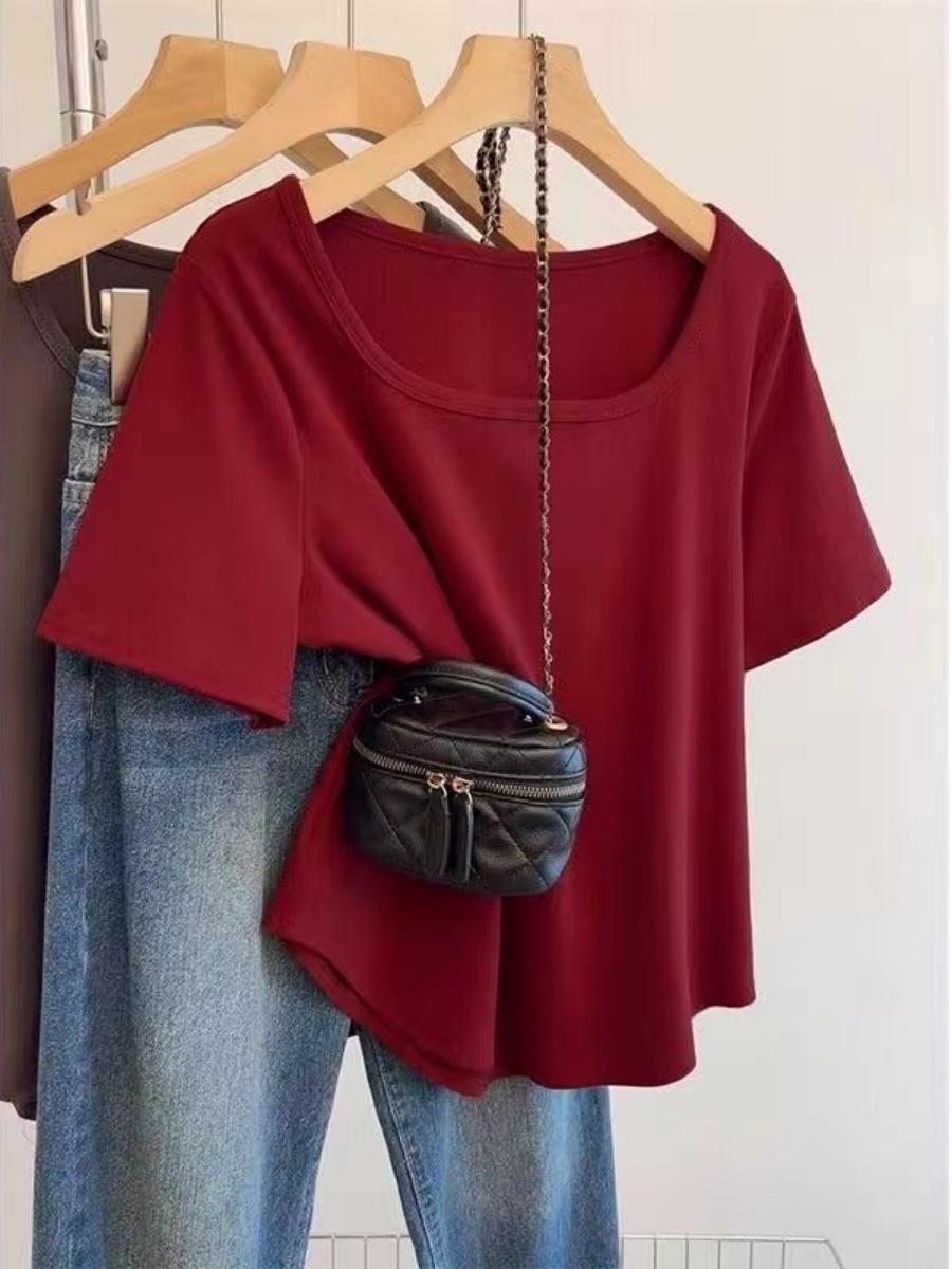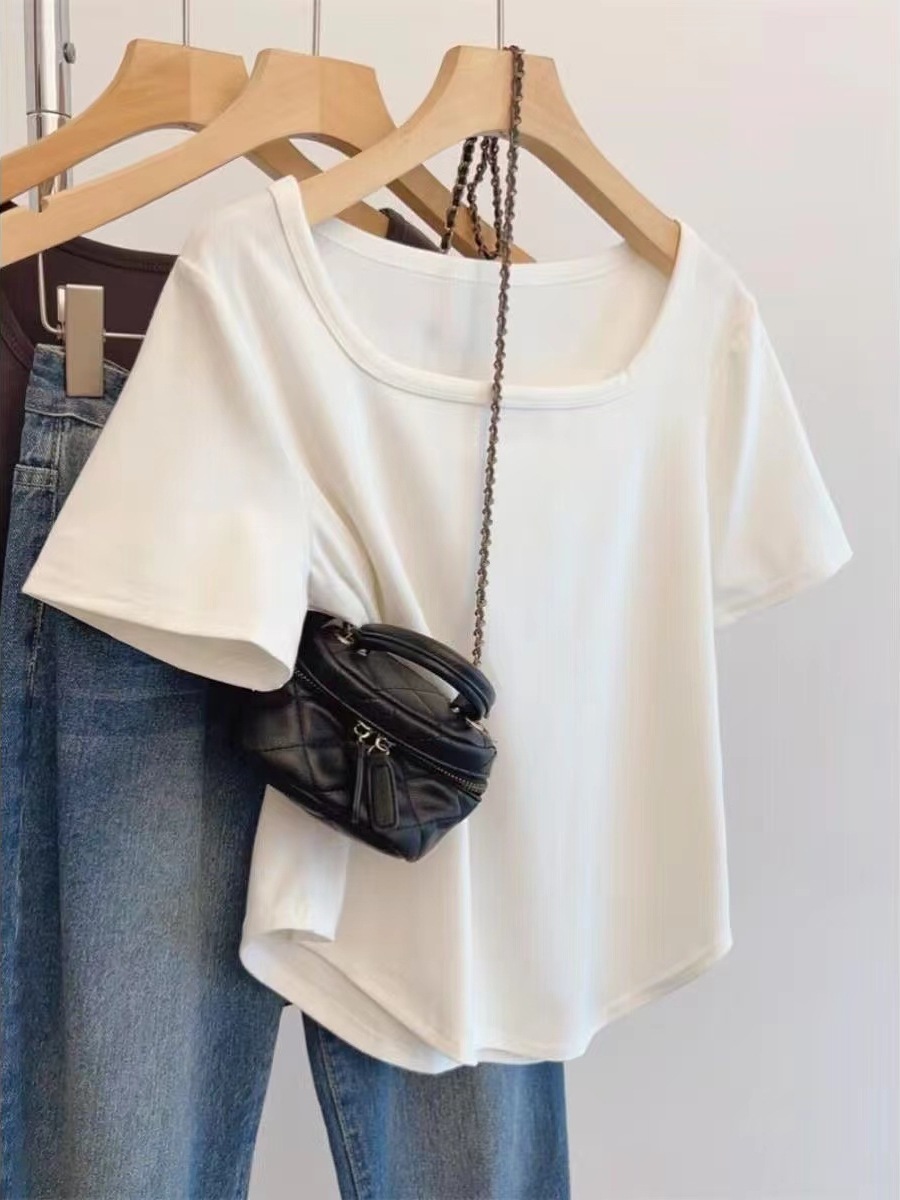 순수 코튼 여름 플러스 사이즈 여성 오른쪽 어깨 새로운 반팔 티셔츠 슬리밍 배꼽 느슨한 스퀘어 넥 탑스토어 가기