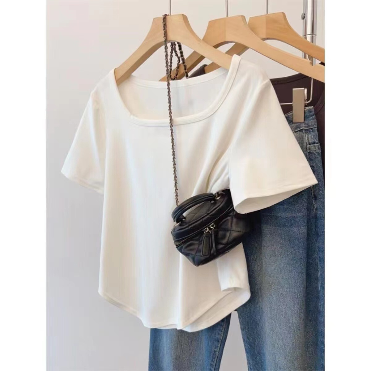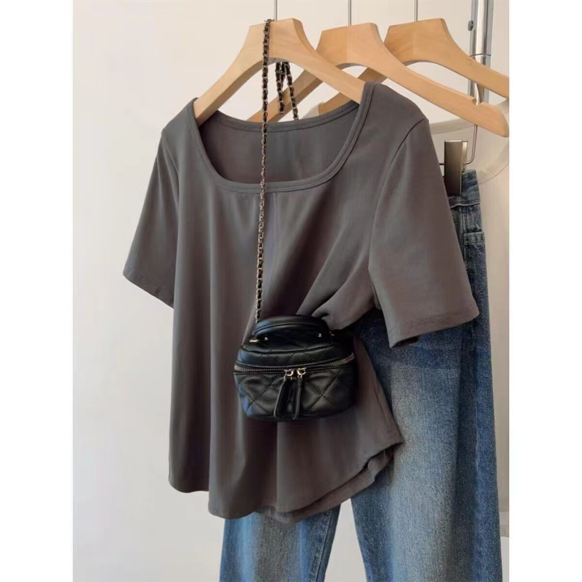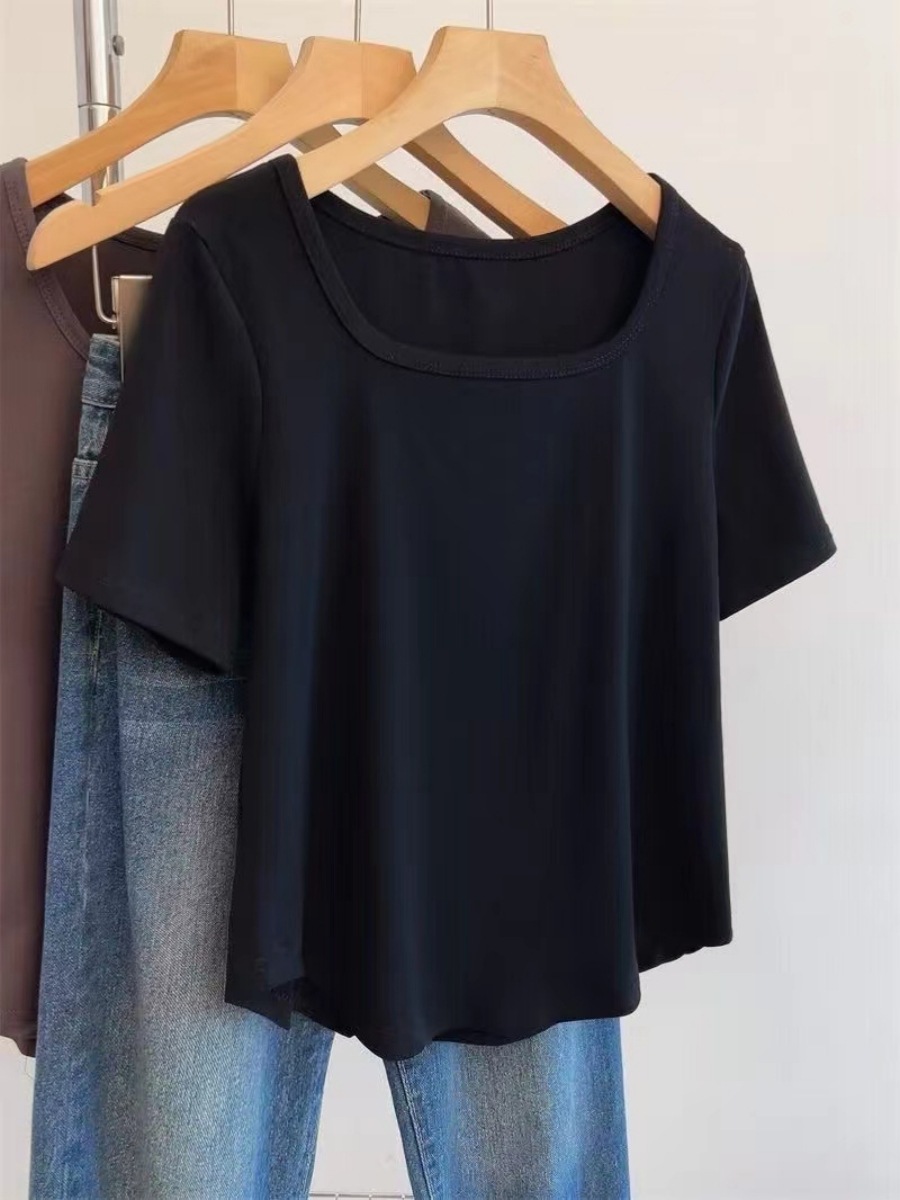 순수 코튼 여름 플러스 사이즈 여성 오른쪽 어깨 새로운 반팔 티셔츠 슬리밍 배꼽 느슨한 스퀘어 넥 탑스토어 가기