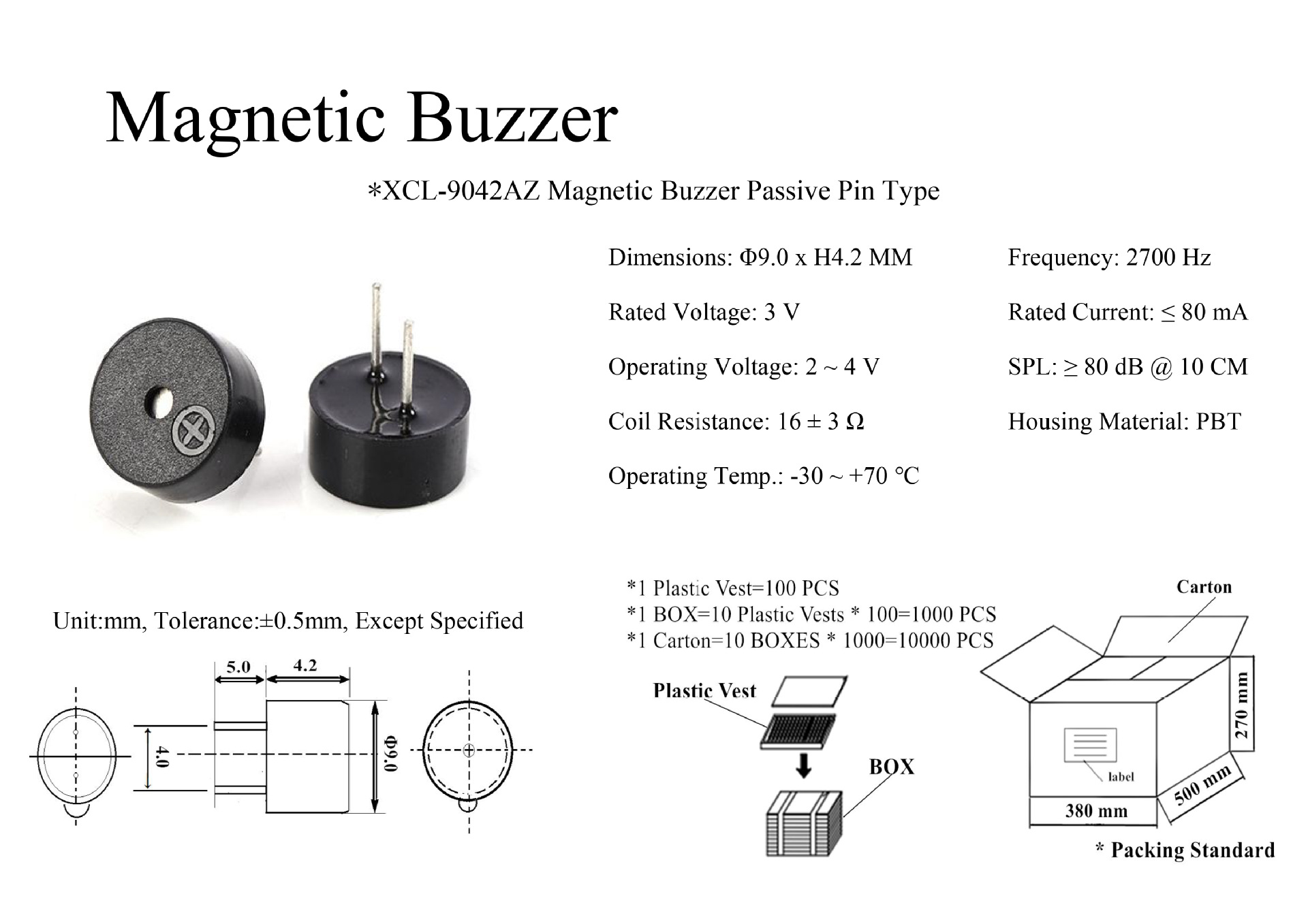XCL-9042AZ 전자기 패시브 버저 5V42 ohm/3V16 ohm 핀 소량 높이 4.2mm