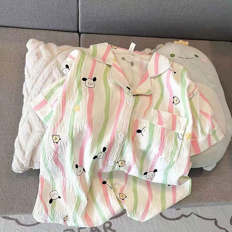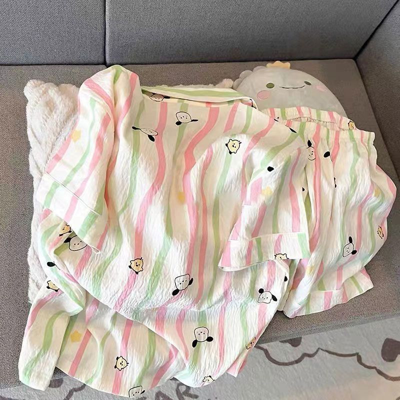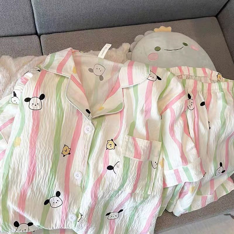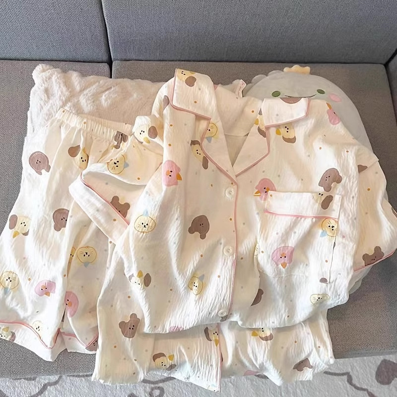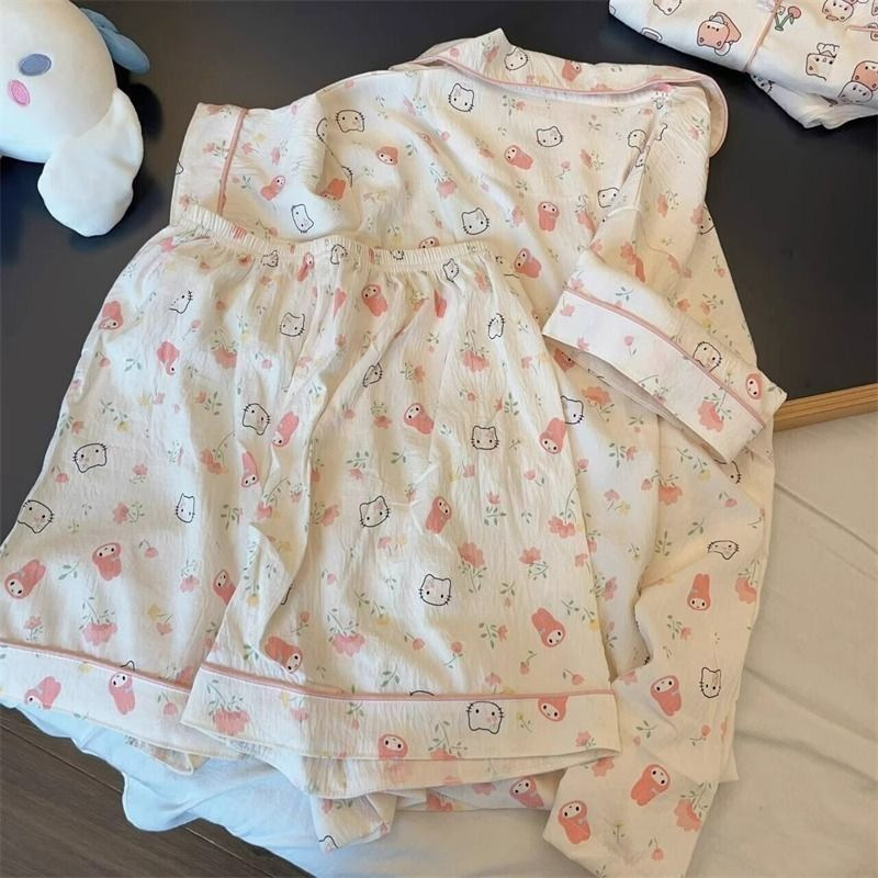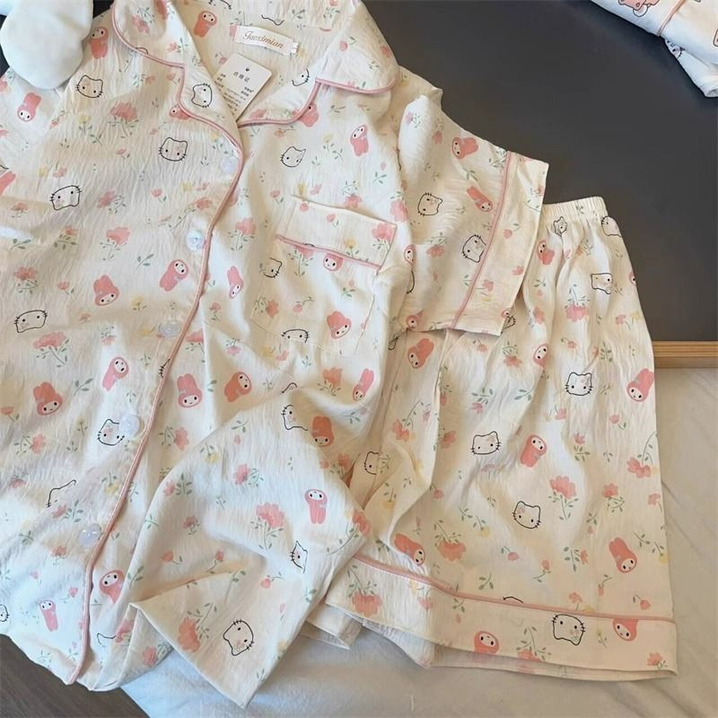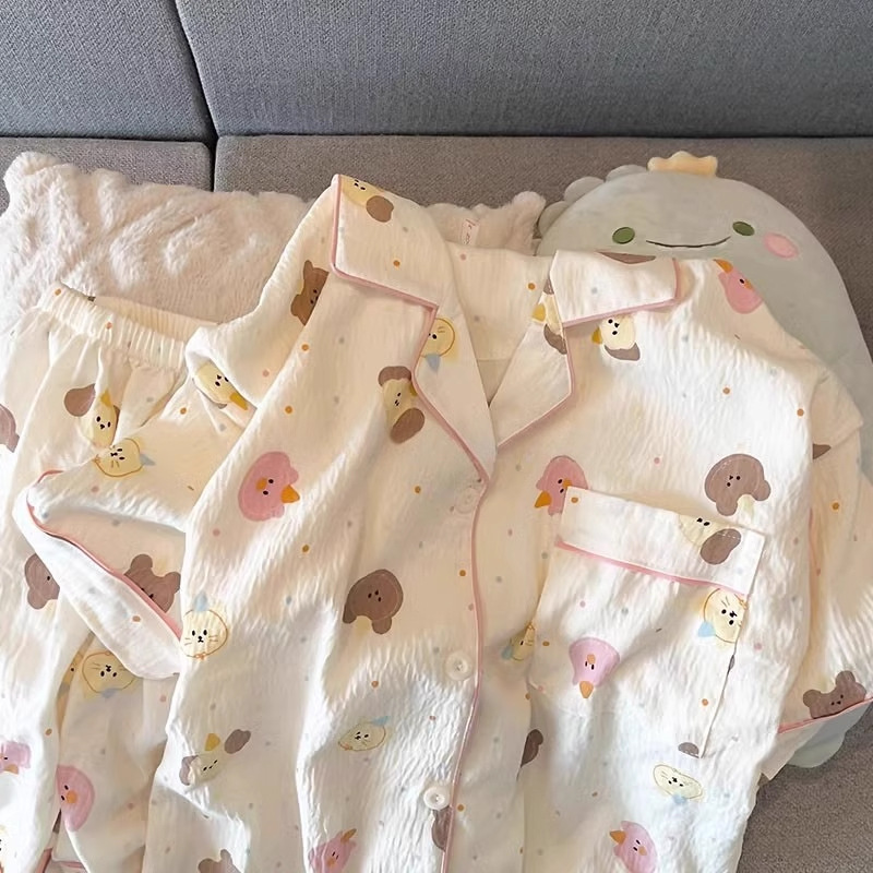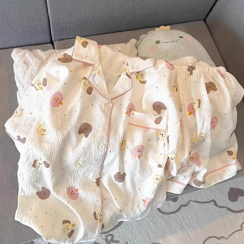 2024 새로운 도착 잠옷 여성의 여름 구름 면 달콤한 귀여운 카디건 캐주얼 짧은 소매 반바지 홈 의류 세트