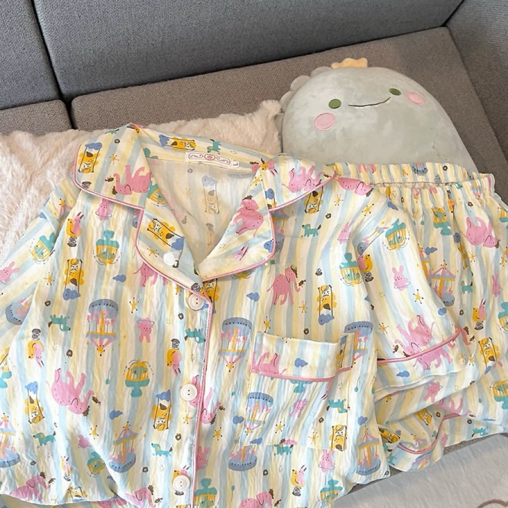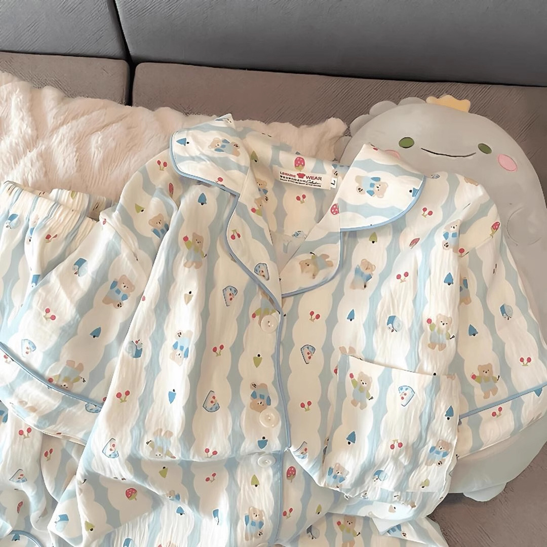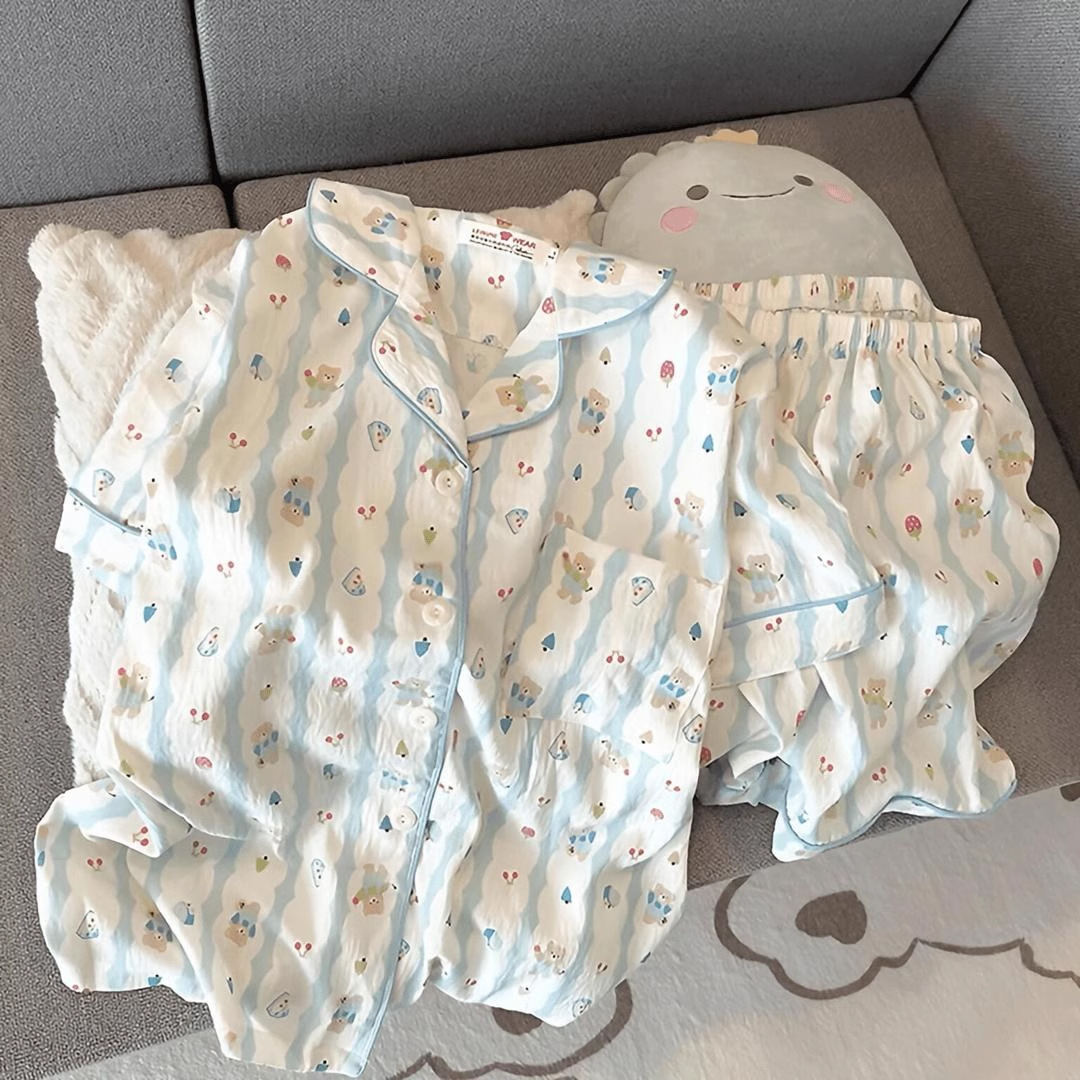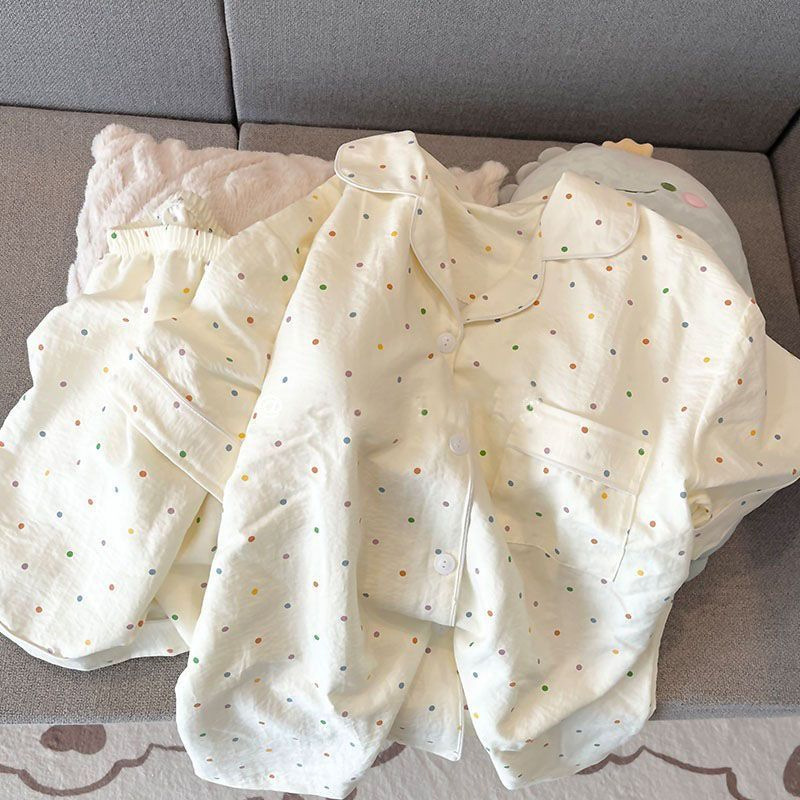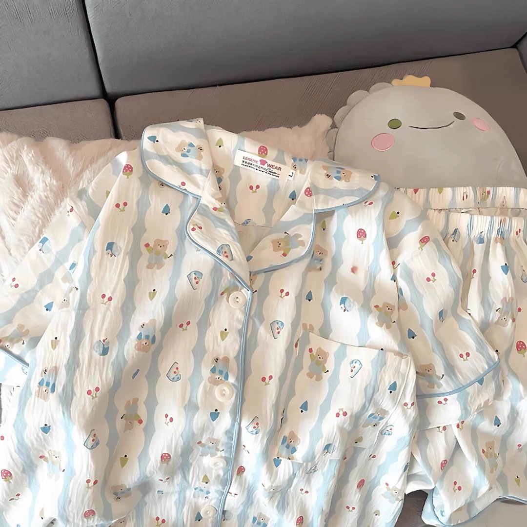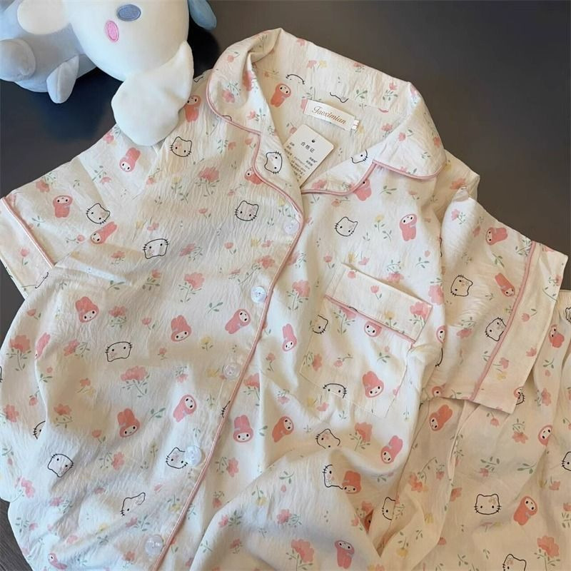2024 새로운 도착 잠옷 여성의 여름 구름 면 달콤한 귀여운 카디건 캐주얼 짧은 소매 반바지 홈 의류 세트