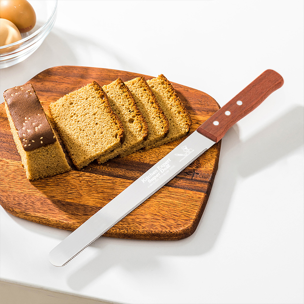 공장 직접 나무 손잡이 스테인레스 스틸 케이크 칼 내구성 톱니 토스트 나이프 굵은 치아 평평한 12 인치 빵