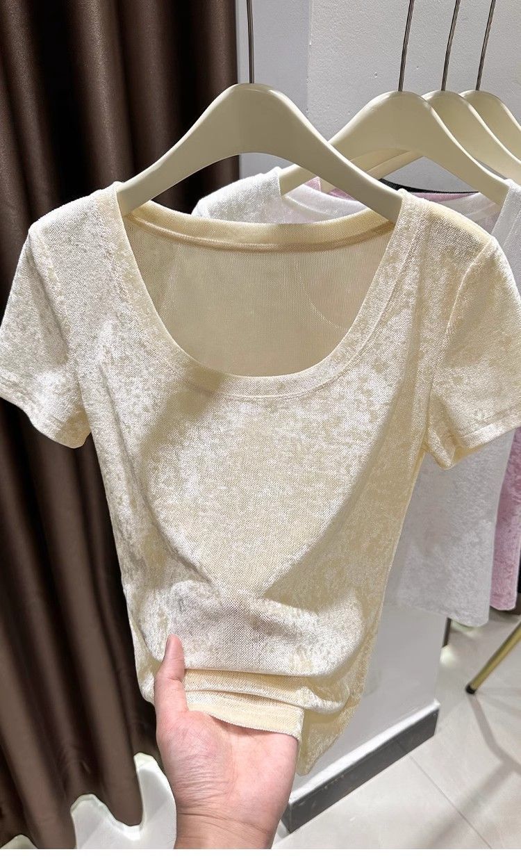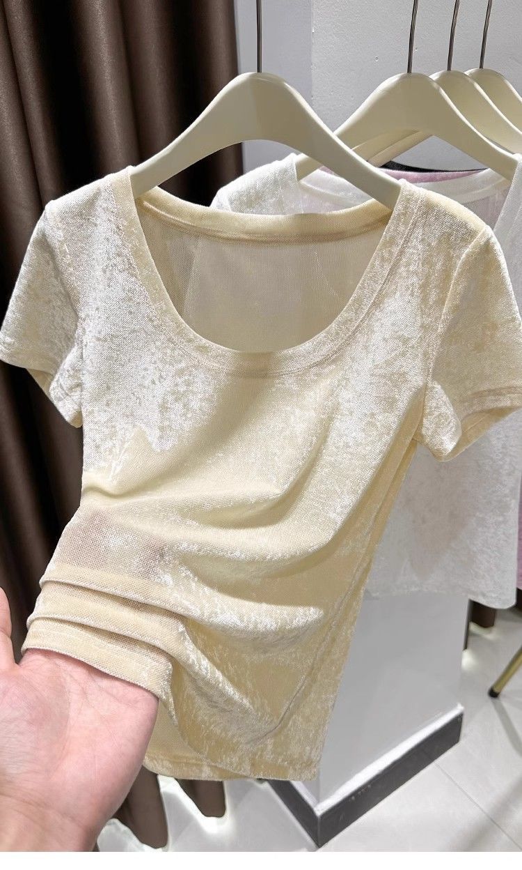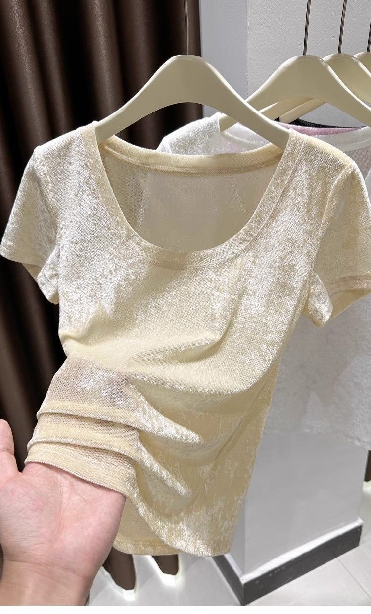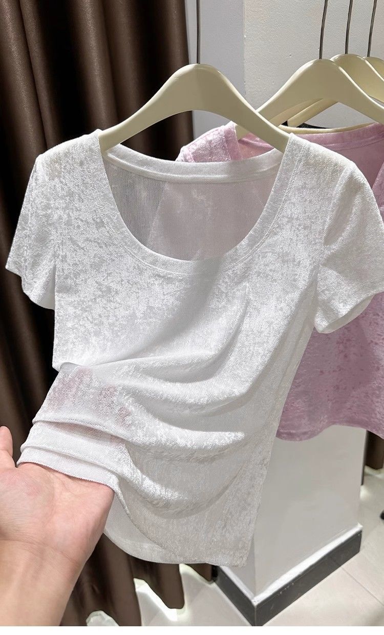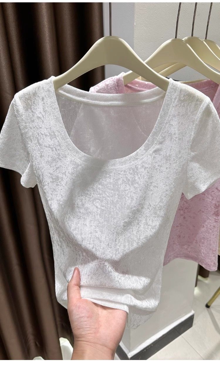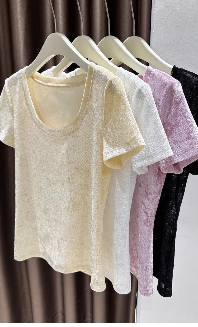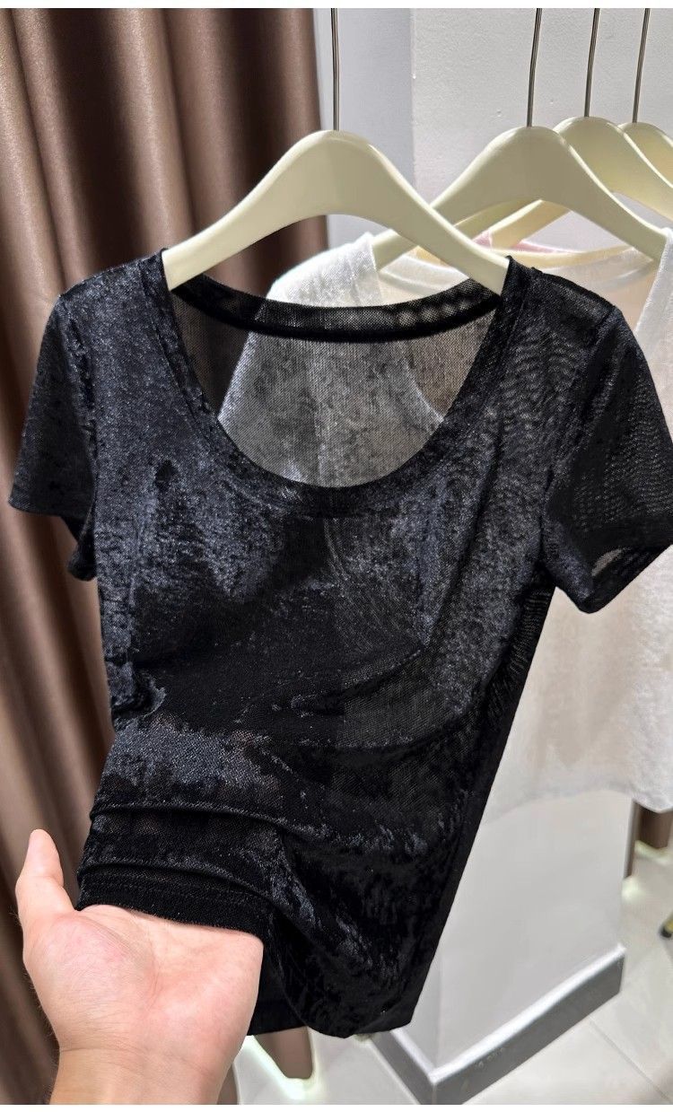 벨벳 메쉬 반팔 티셔츠 여성용 여름 한국식 슬리밍 탑, Collarbone Crewneck 대형 U 넥 라이트베이스 셔츠