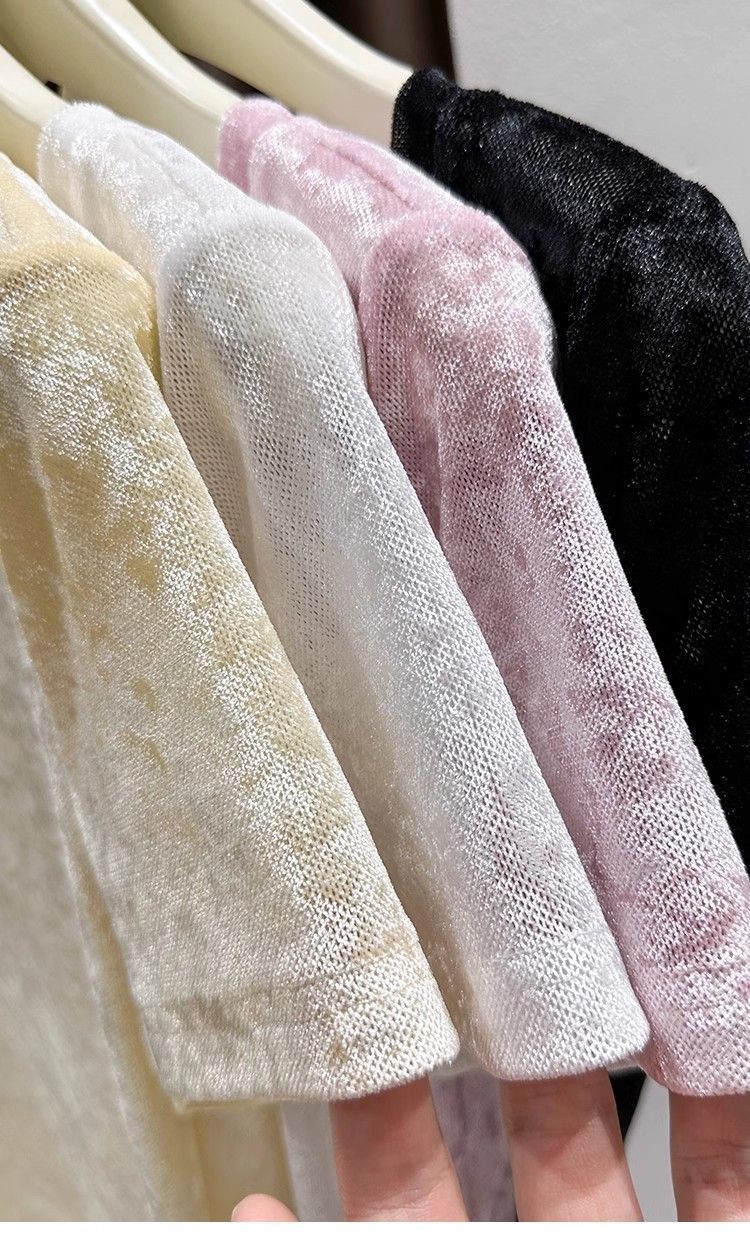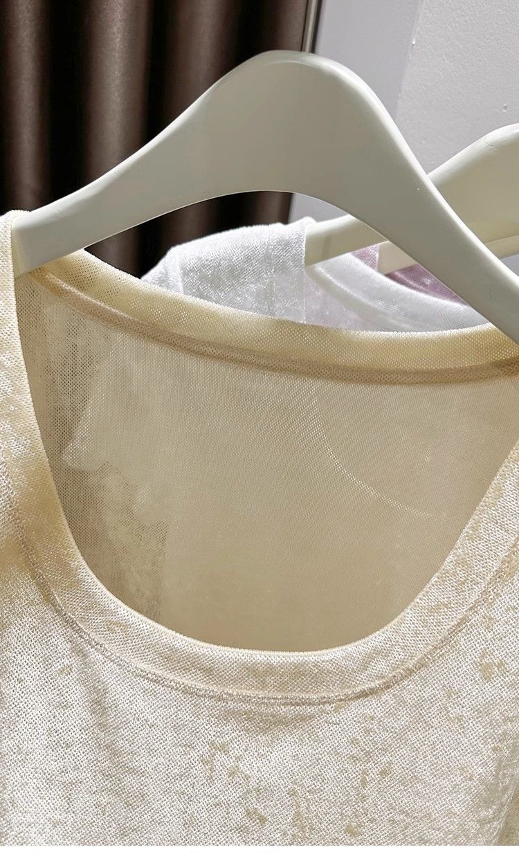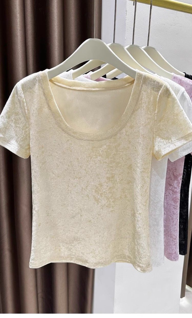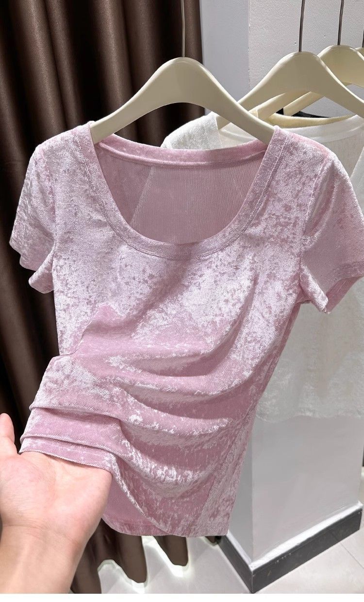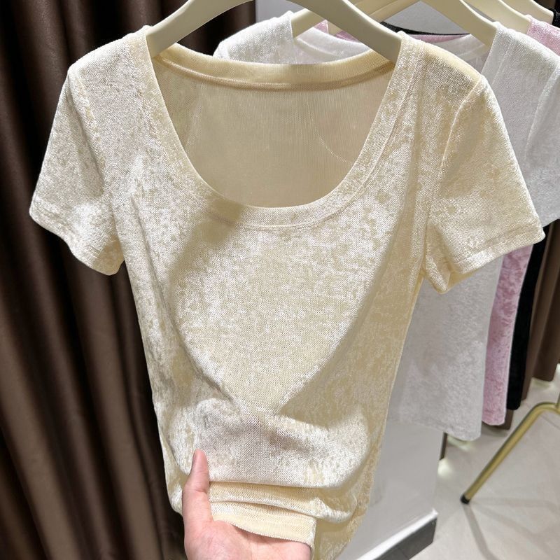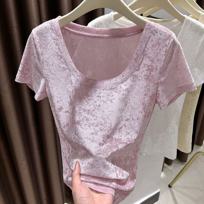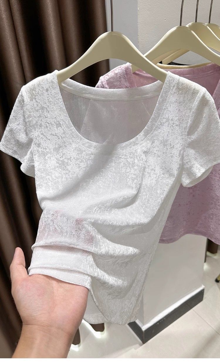 벨벳 메쉬 반팔 티셔츠 여성용 여름 한국식 슬리밍 탑, Collarbone Crewneck 대형 U 넥 라이트베이스 셔츠