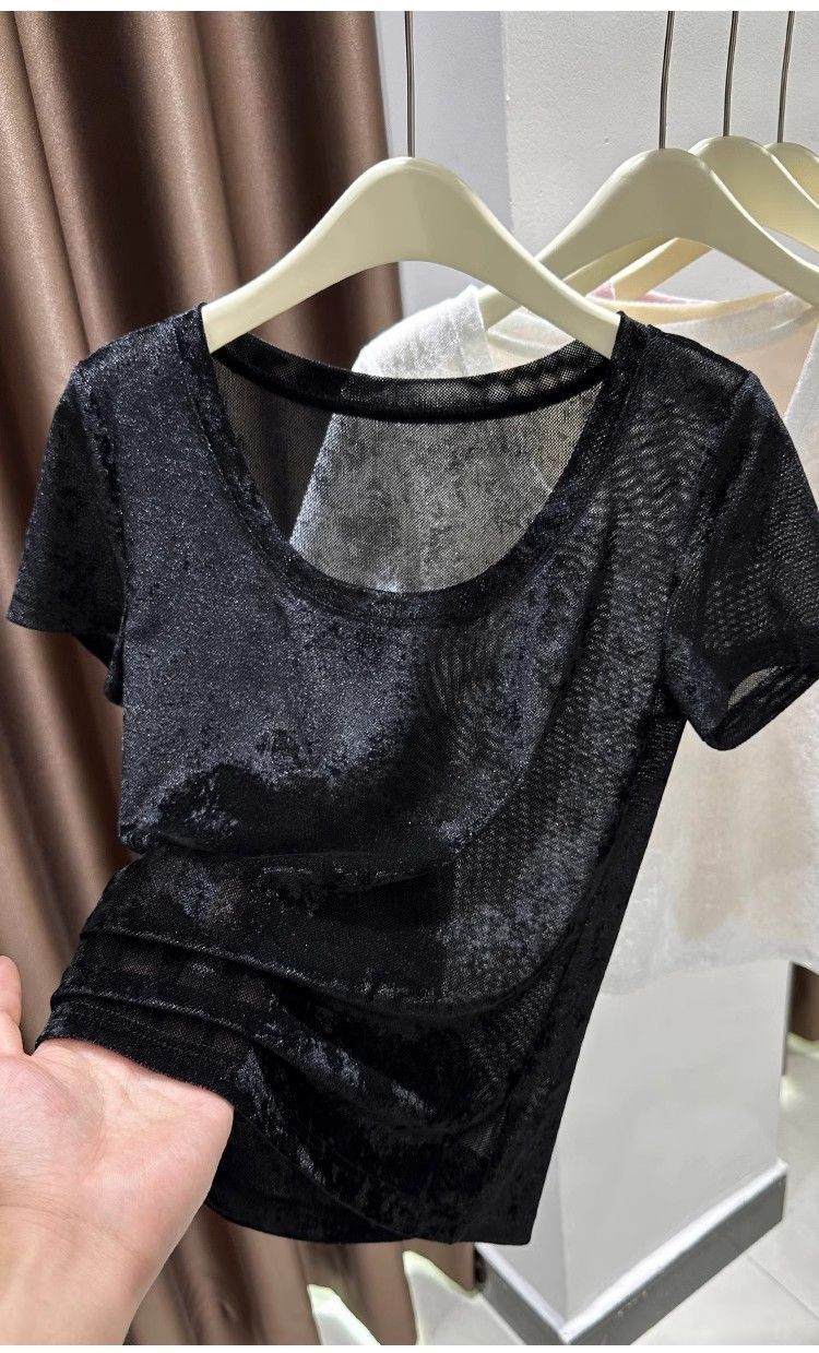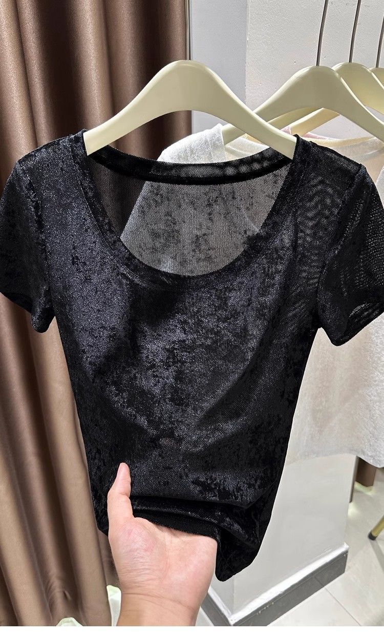벨벳 메쉬 반팔 티셔츠 여성용 여름 한국식 슬리밍 탑, Collarbone Crewneck 대형 U 넥 라이트베이스 셔츠스토어 가기