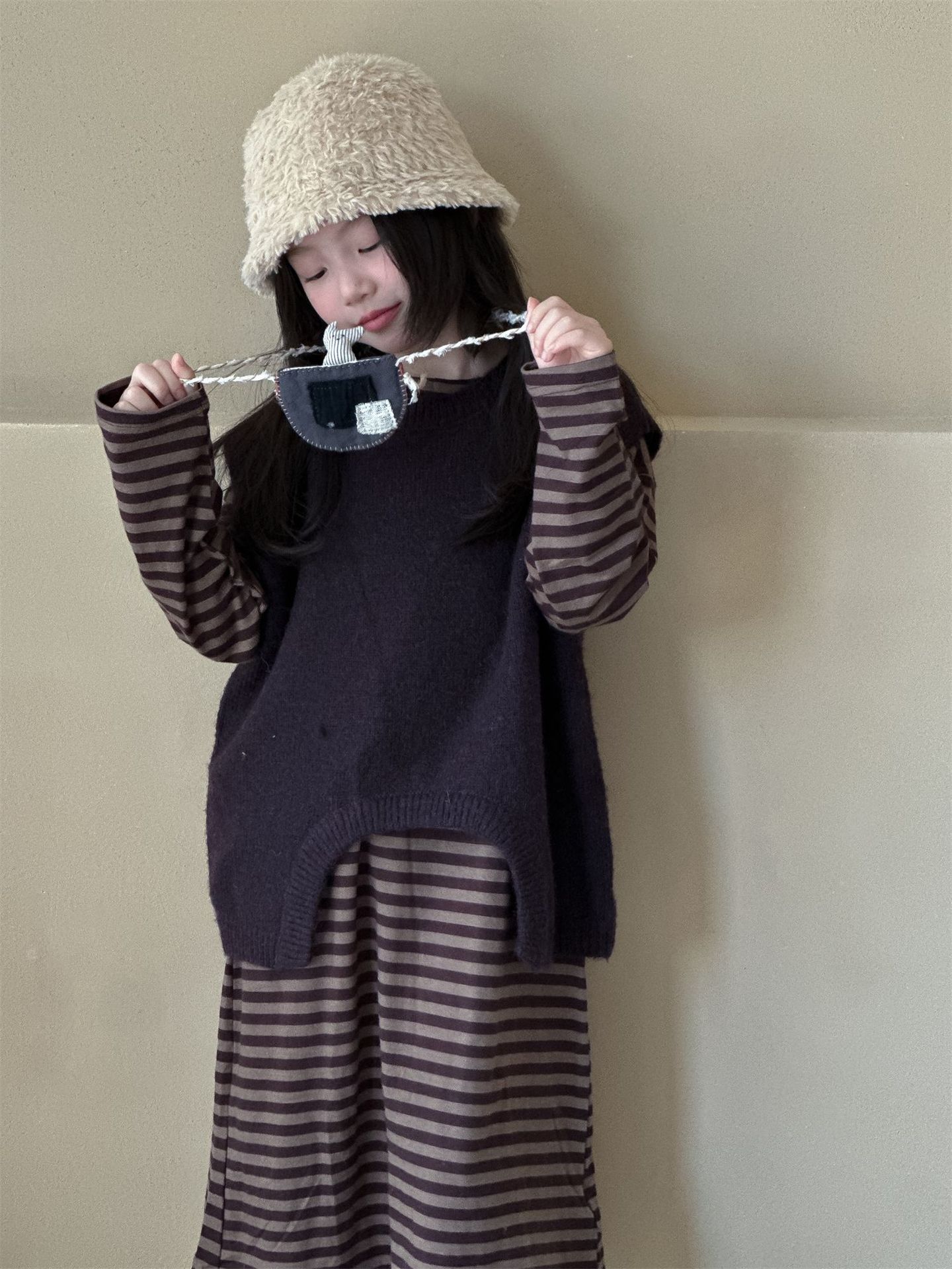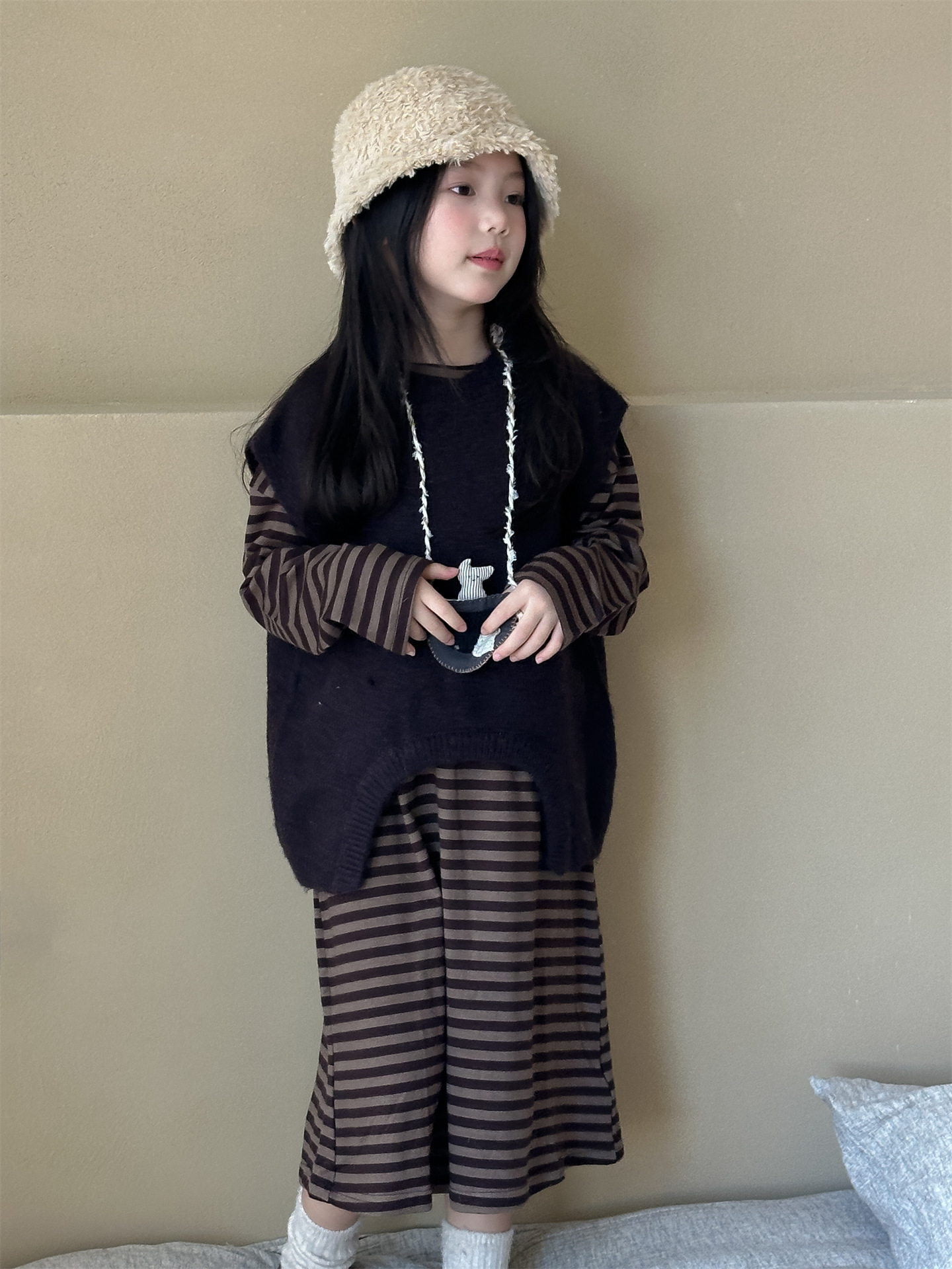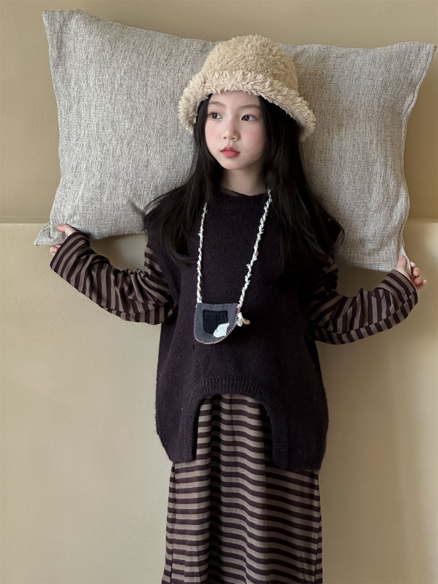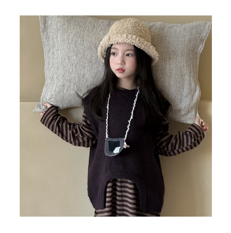 Hua and Xun 한국 아동복 소녀 스웨터 조끼 2024 가을 새 스타일 아기 소녀 다목적 솔리드 컬러 니트 탑
