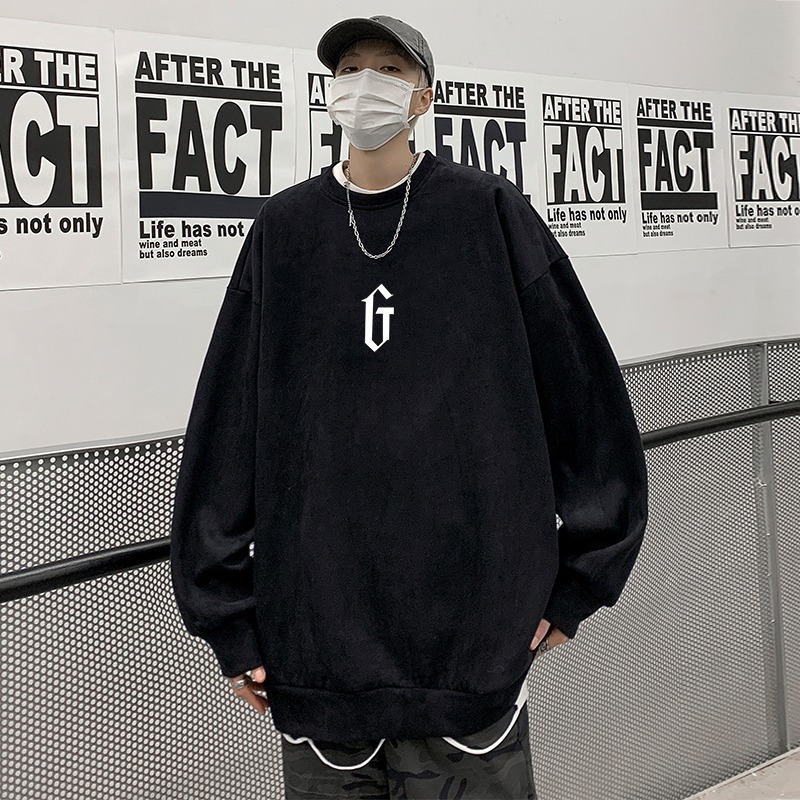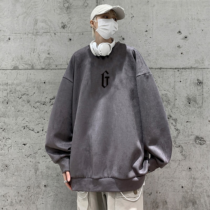 300g 헤비 크루 넥 스웨이드 스웨트 셔츠 남성 봄과 가을 패션 브랜드 미국 느슨한 긴 소매 티셔츠 캐주얼 재킷