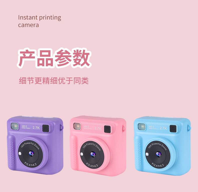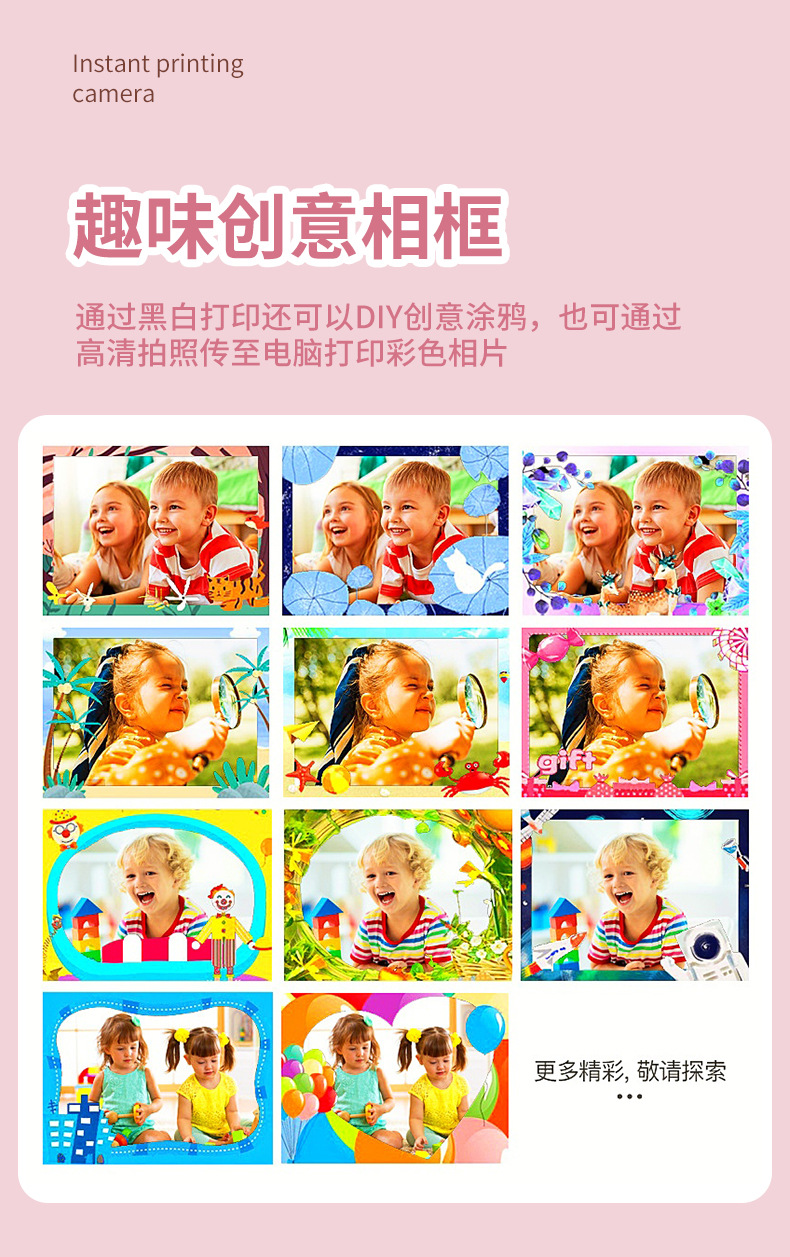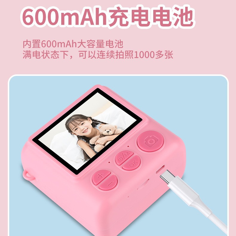 本产品儿童手机H12,主要特点是可以立拍立打印相片功能,大屏幕2.4寸,可以拍照,录像,大头贴变化,玩小游戏等功能,支持32G内存卡,配件有说明书,充电线,挂绳,天地盒子和打印纸。
