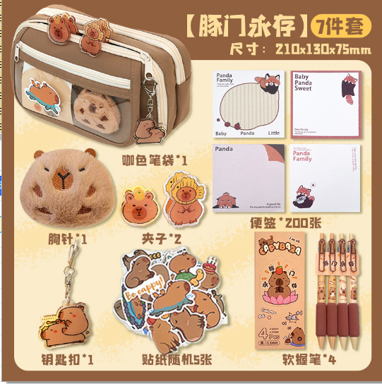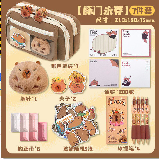 • 9겹 커피 필통 + 스티커 5개 + 브로치 1개 + 클립 2개 + 젤펜 4개 + 스티커 메모 4개 + 수정테이프 6개