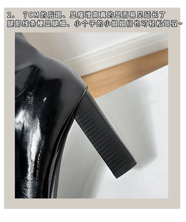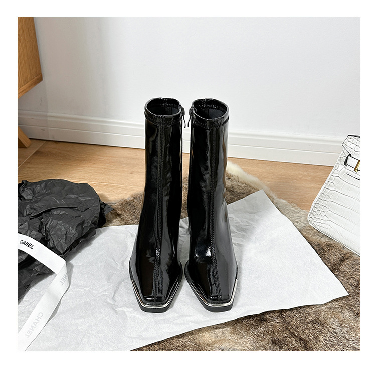 Ken Dou 동일 스타일 Martins 부츠 새로운 낮은 배럴 광택 얇은 부츠 두꺼운 힐 스퀘어 발가락 하이힐 부츠 여성 가을 및 겨울 특허 가죽 짧은 부츠스토어 가기