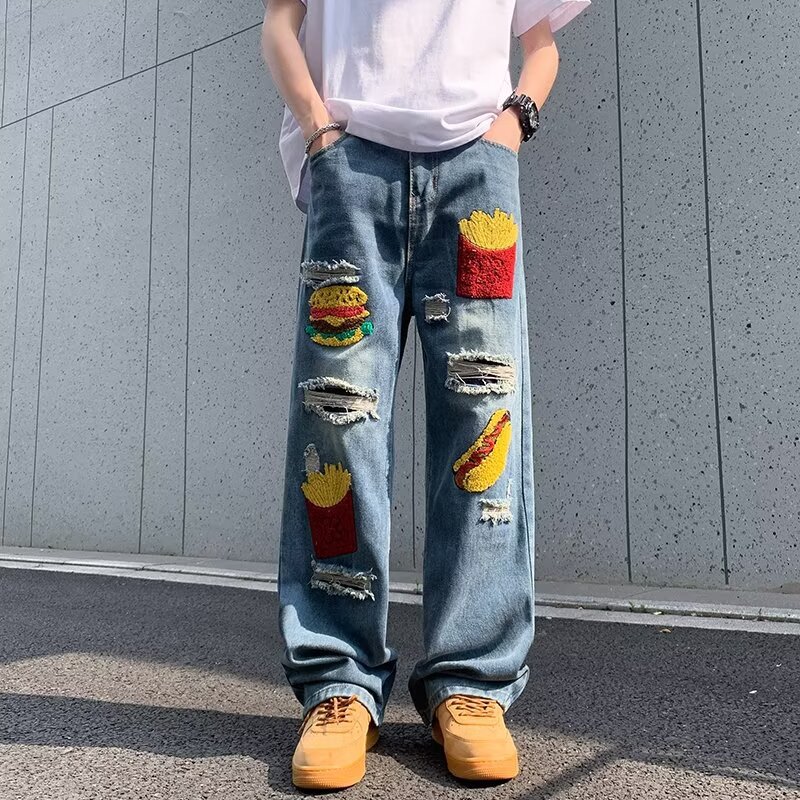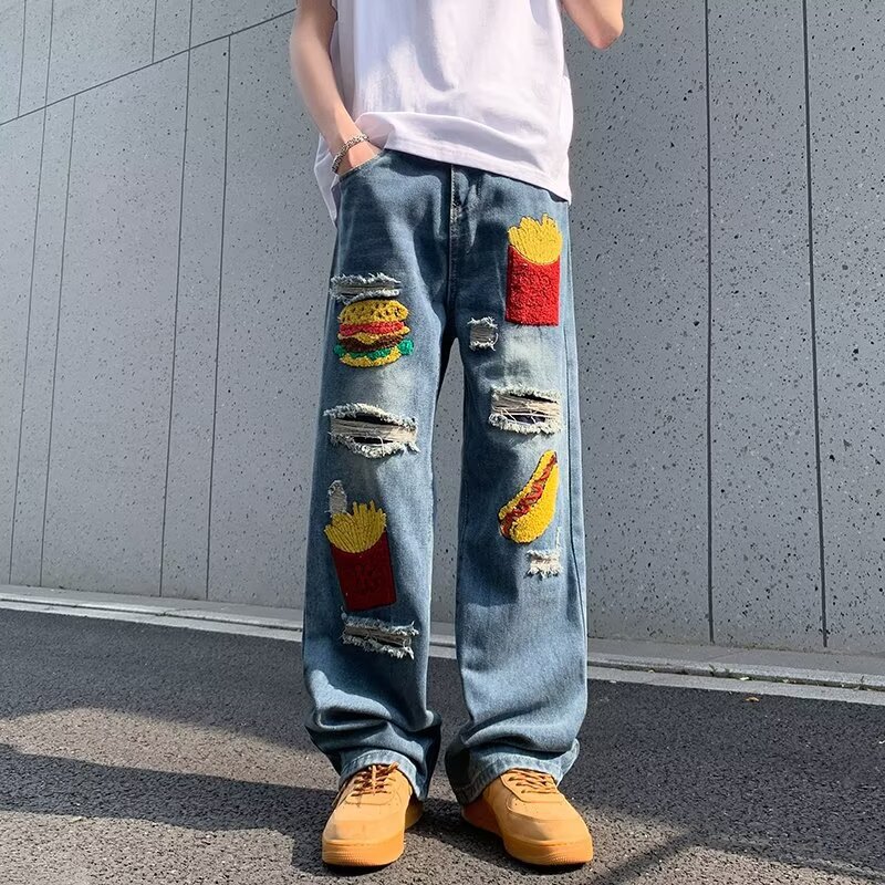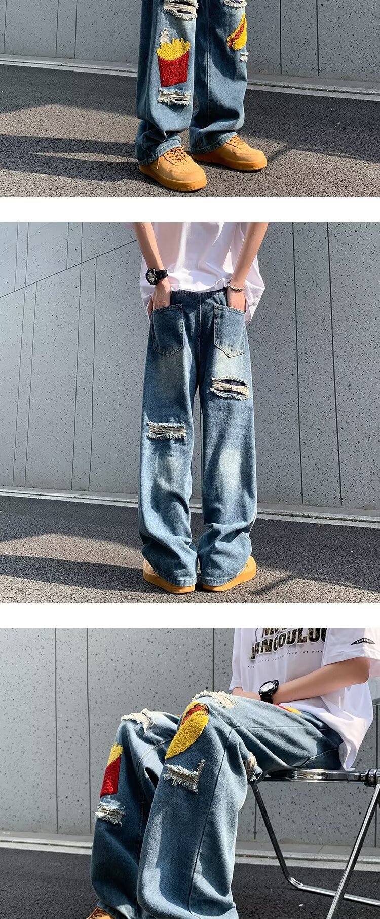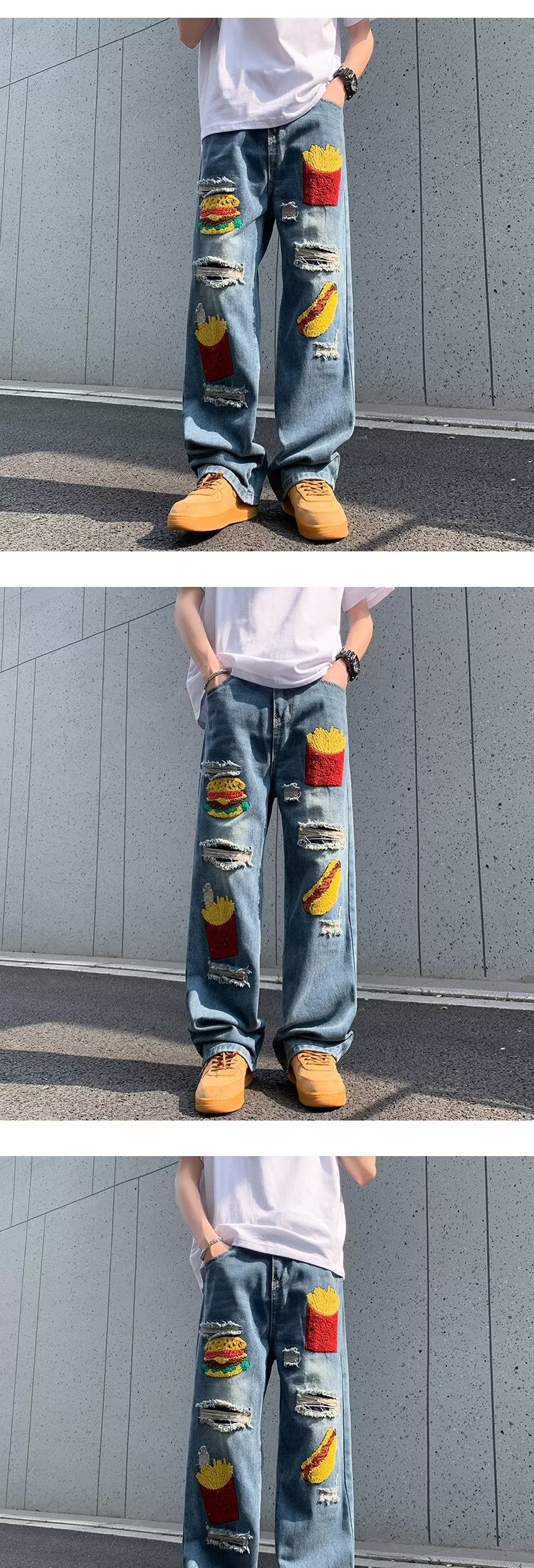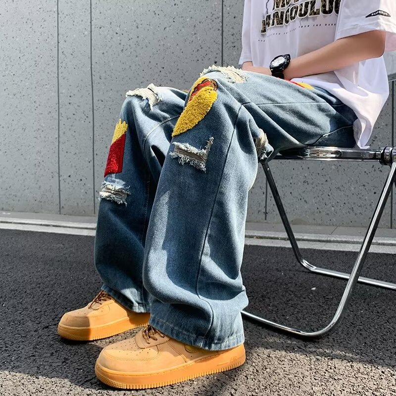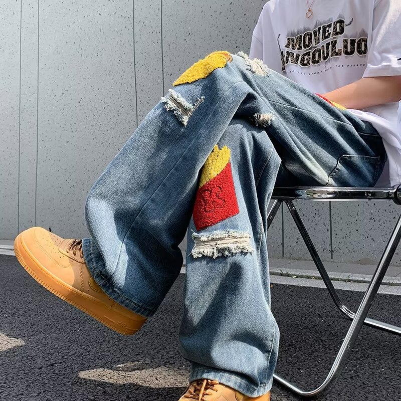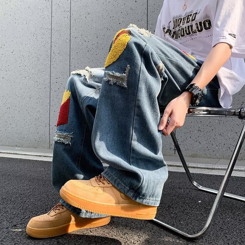 레트로 블루 청바지 남성용 봄과 여름 하이 스트리트 함부르크 수놓은 스트레이트 레그 팬츠 디자인 감각 뚱뚱한 잘 생긴 넓은 다리 캐주얼 바지스토어 가기