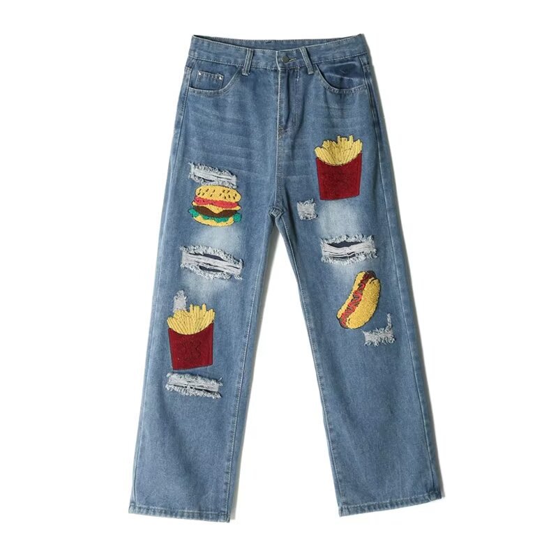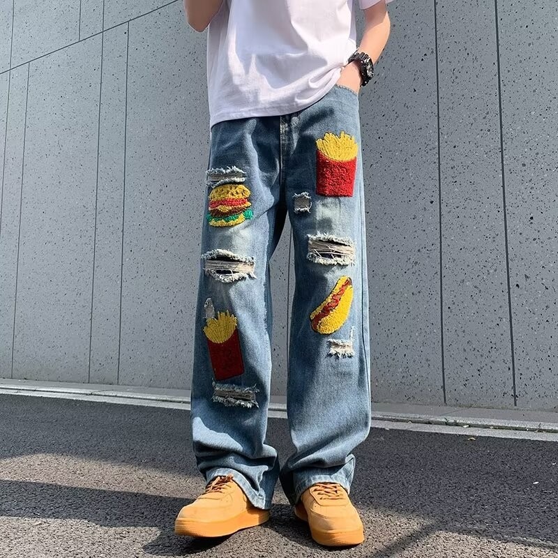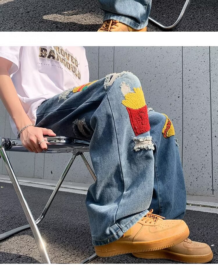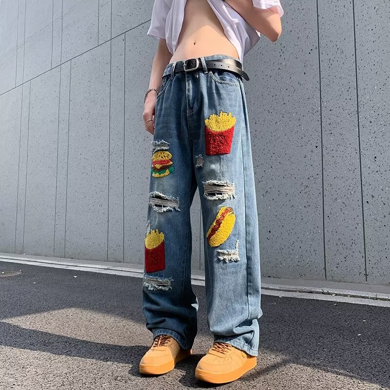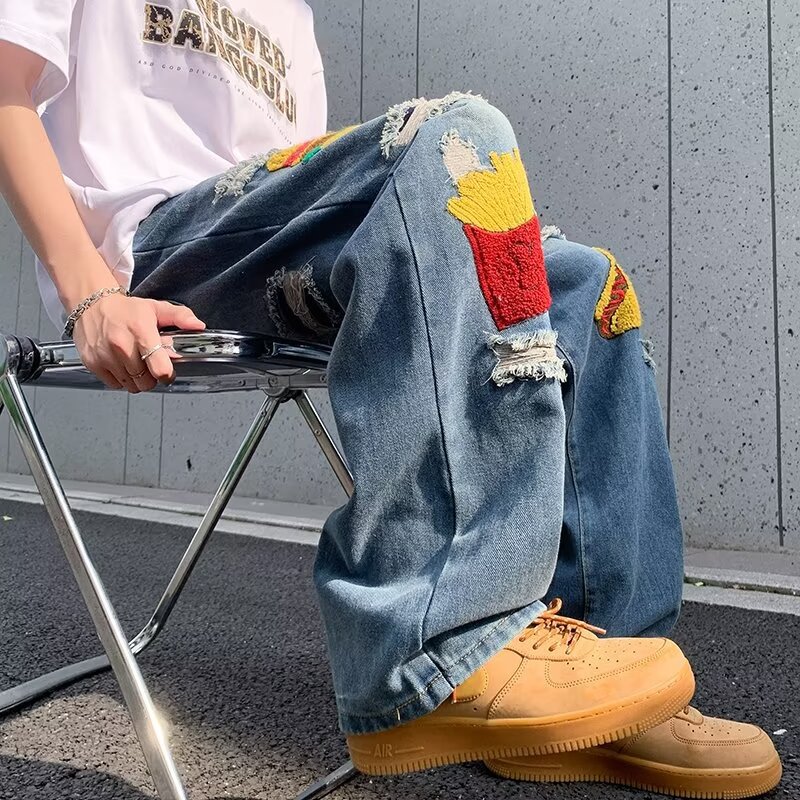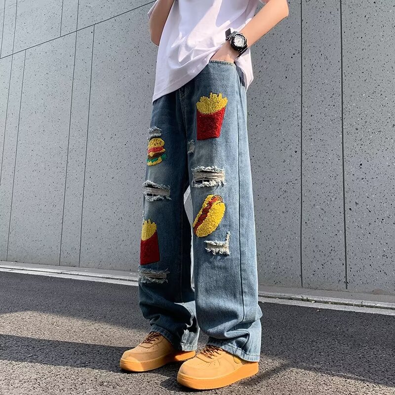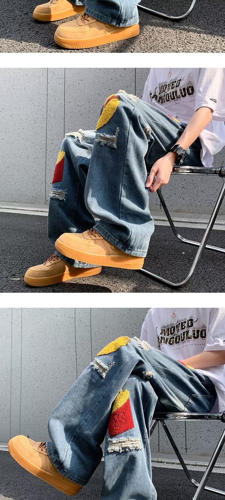 레트로 블루 청바지 남성용 봄과 여름 하이 스트리트 함부르크 수놓은 스트레이트 레그 팬츠 디자인 감각 뚱뚱한 잘 생긴 넓은 다리 캐주얼 바지스토어 가기