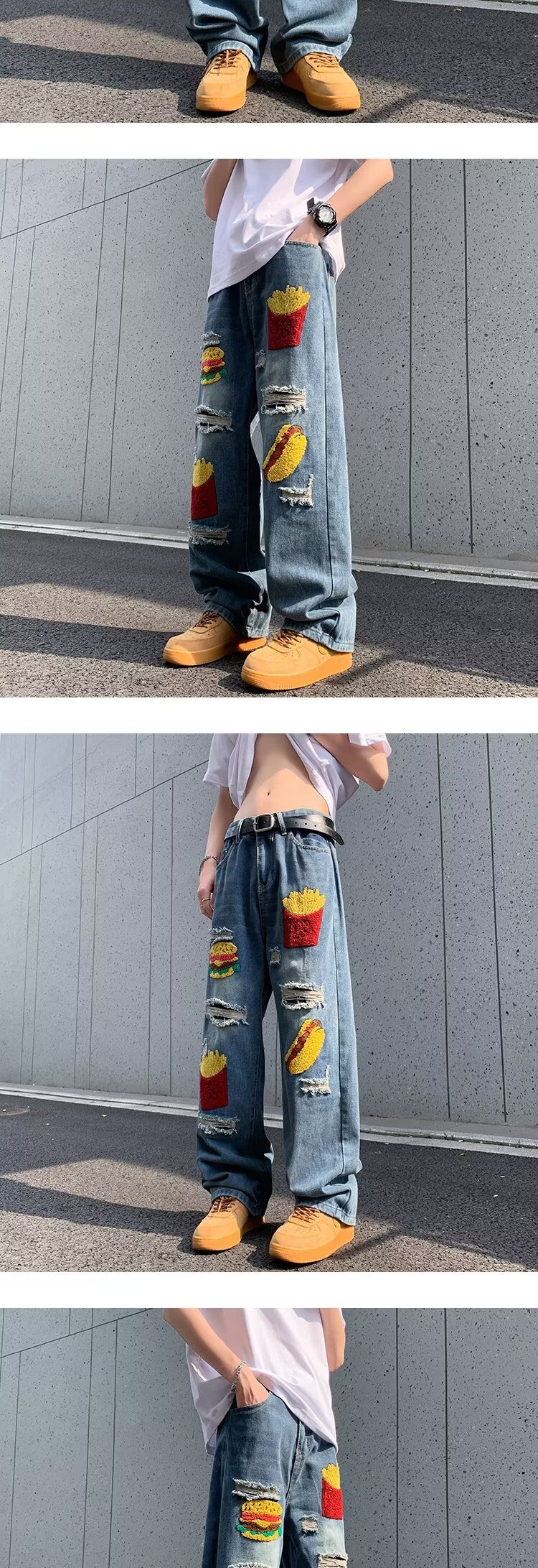 레트로 블루 청바지 남성용 봄과 여름 하이 스트리트 함부르크 수놓은 스트레이트 레그 팬츠 디자인 감각 뚱뚱한 잘 생긴 넓은 다리 캐주얼 바지