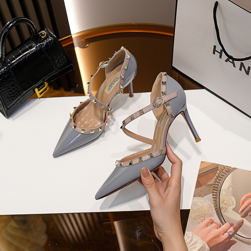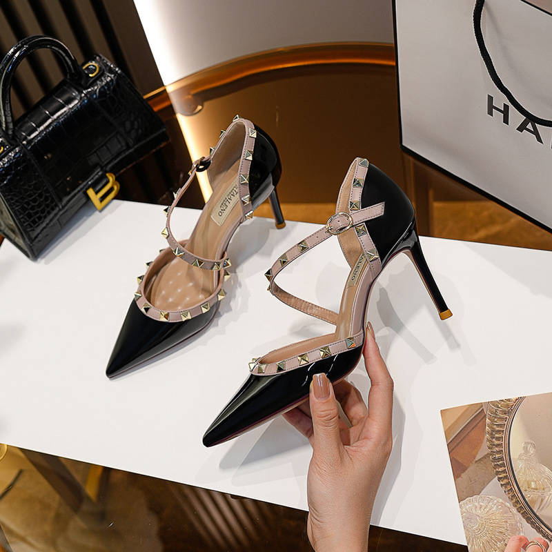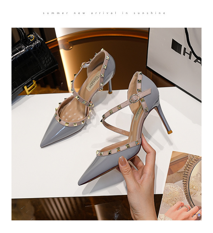 V 패밀리 스타일 리벳 하이힐 슈즈 샌들 포인팅 미드 하이힐 특허 가죽 패셔너블 얇은 힐 여성용 싱글 슈즈스토어 가기