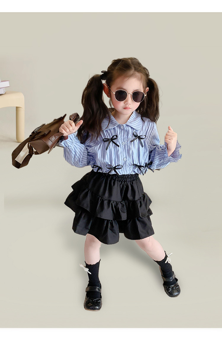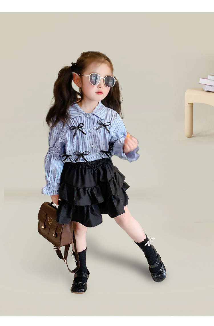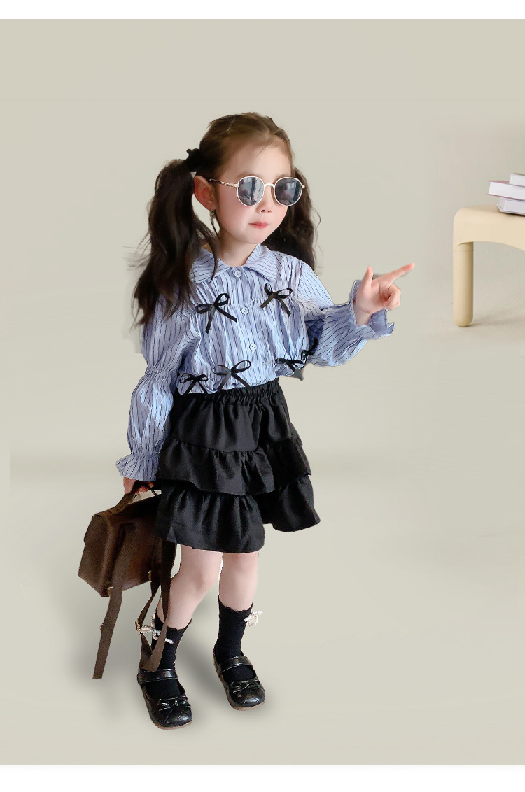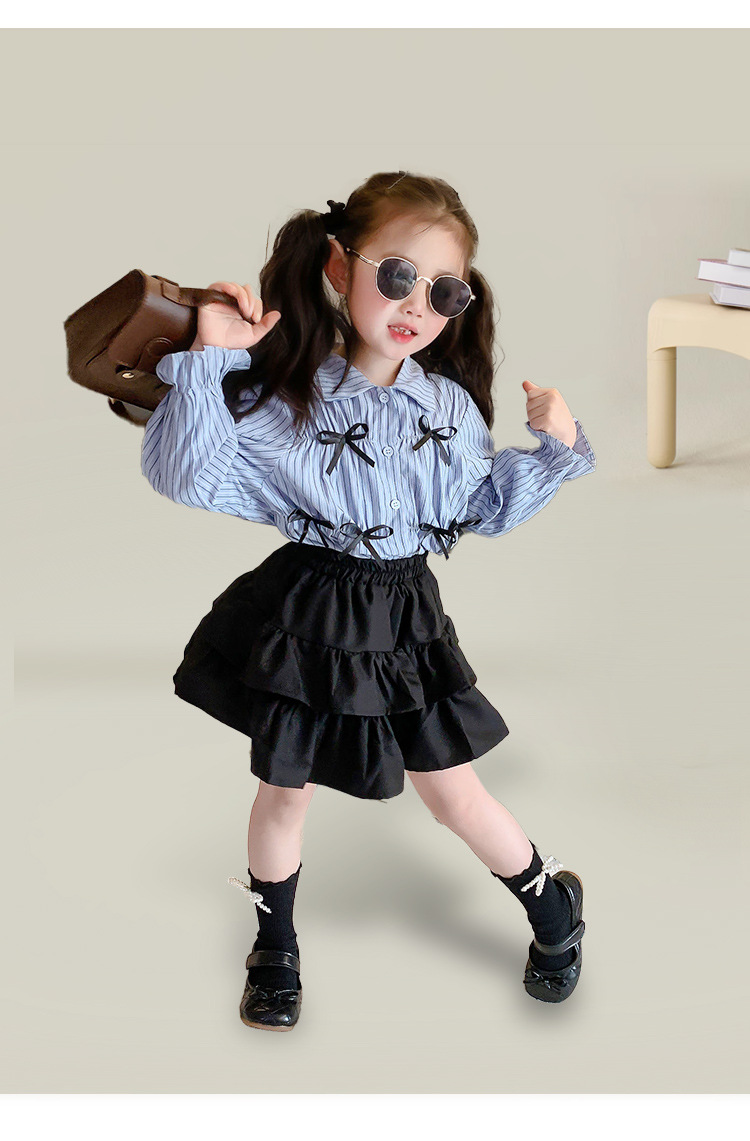 • 블랙 2겹 스커트 + 블루 스트라이프 나비 셔츠