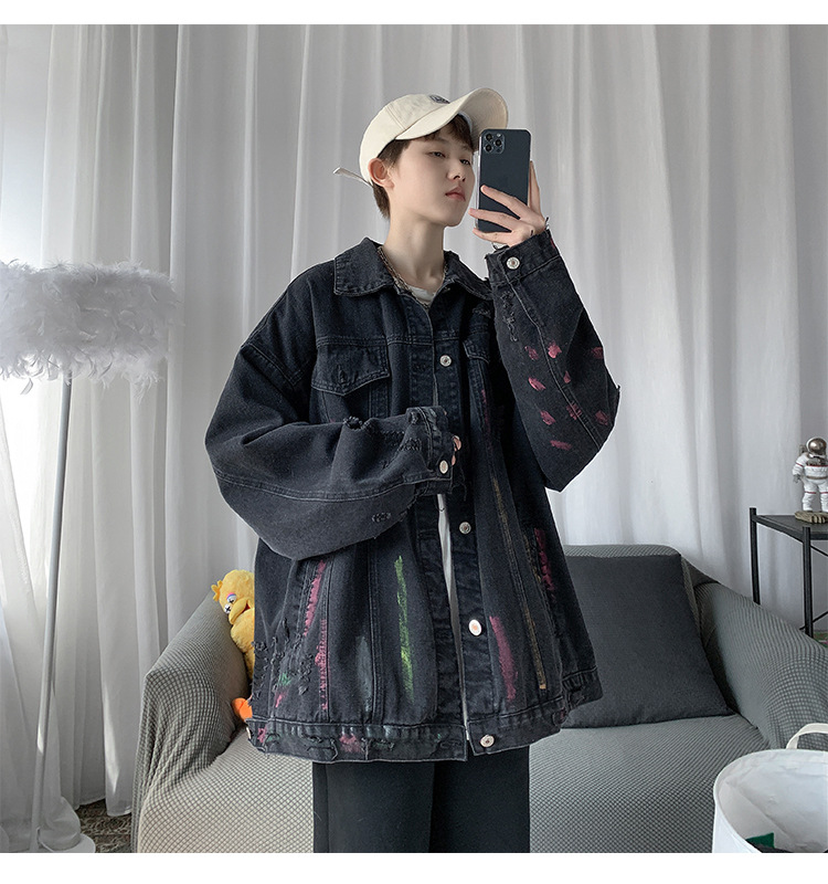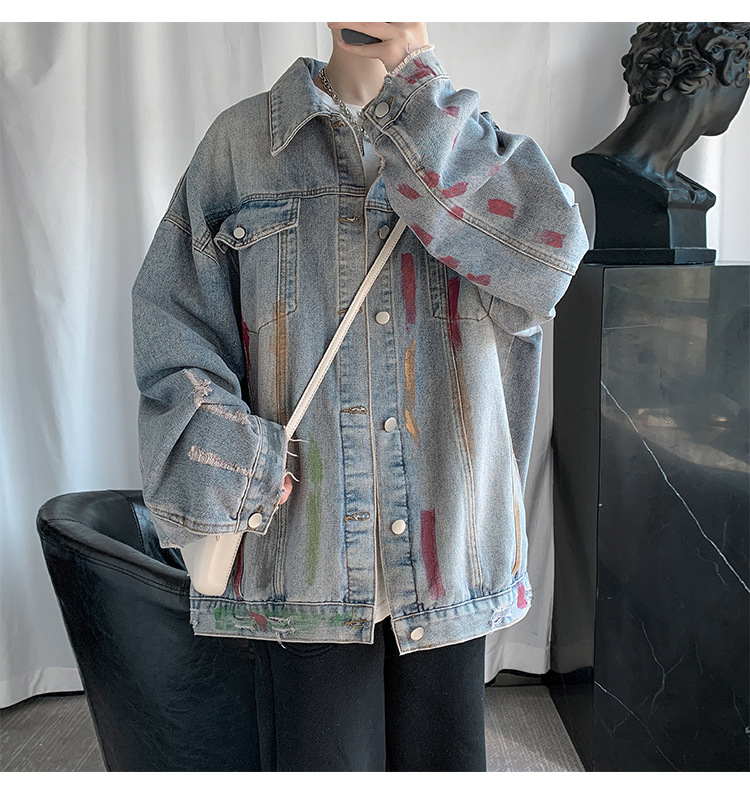 찢어진 데님 자켓 남성 가을 트렌디 브랜드 Ins 홍콩 스타일 하이 엔드 의류 봄과 가을 트렌디 루즈 캐주얼 자켓스토어 가기