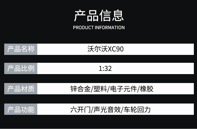 5、.功能:使用纽扣电池,打开底部开关,按压车身启动灯光和音效灯光和声音功能的加入,使汽车模型更具观赏性和收藏价值。