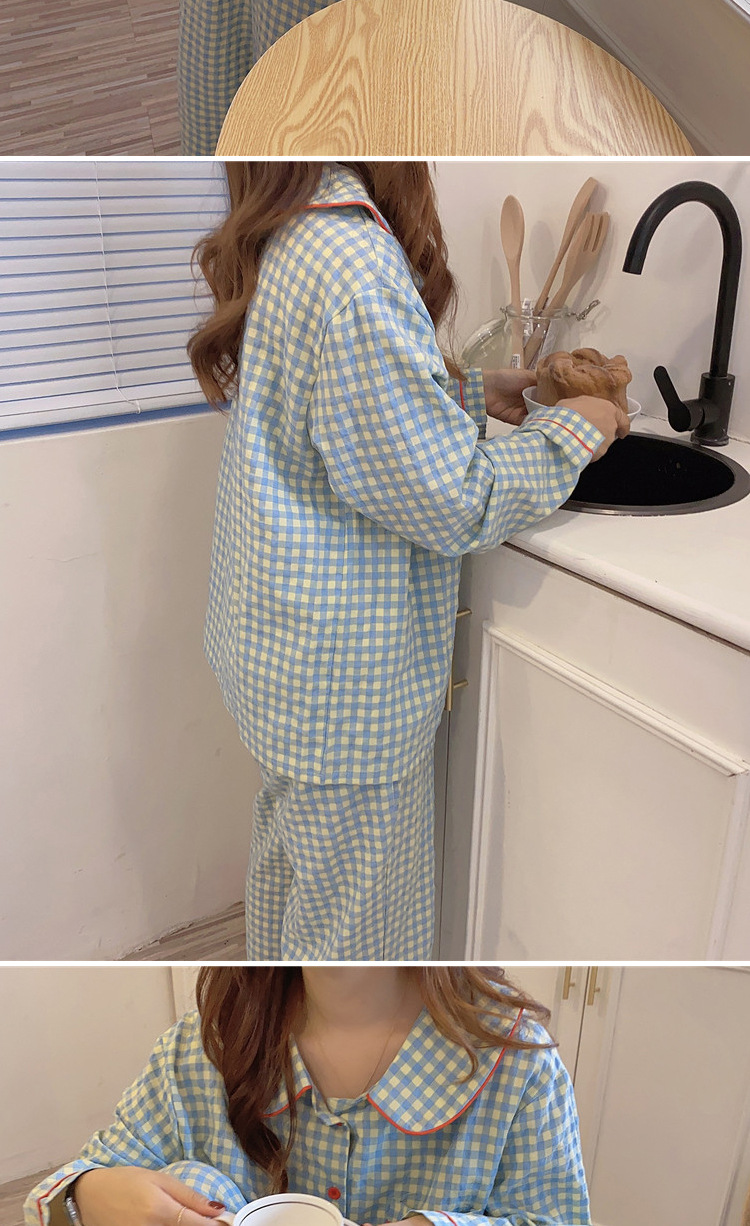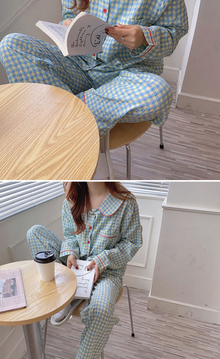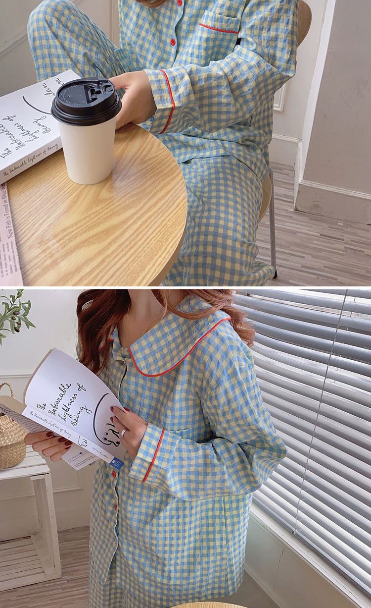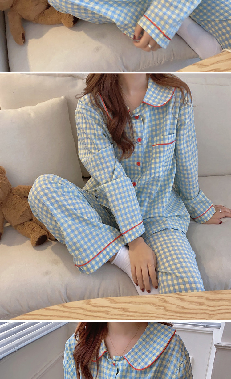 Ins Pajamas 여성 한국 스타일 봄과 가을 인형 칼라 플레이드 컬렉션 신선한 긴 소매 느슨한 우유 실크 홈 옷