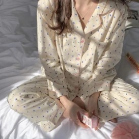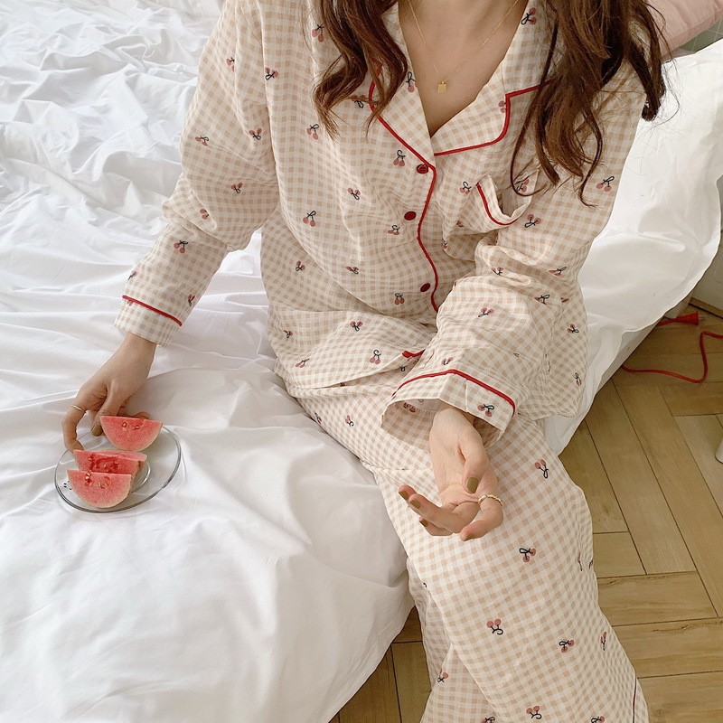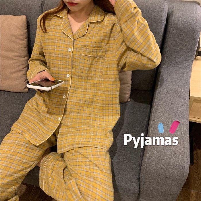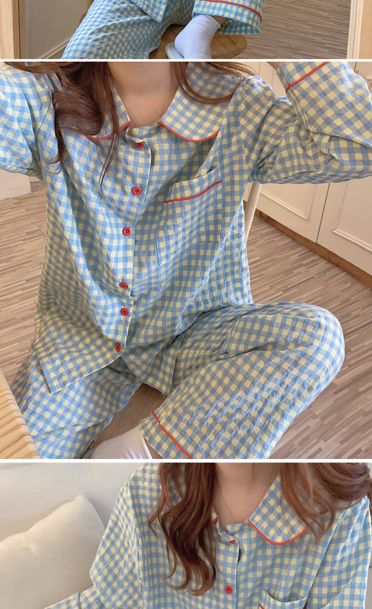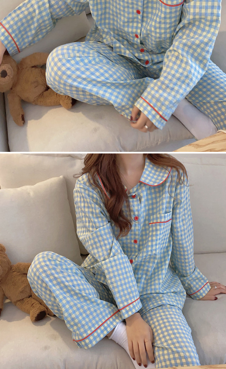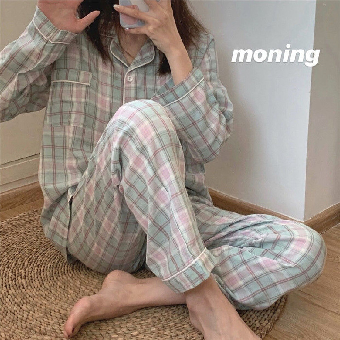 Ins Pajamas 여성 한국 스타일 봄과 가을 인형 칼라 플레이드 컬렉션 신선한 긴 소매 느슨한 우유 실크 홈 옷