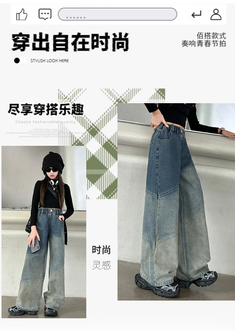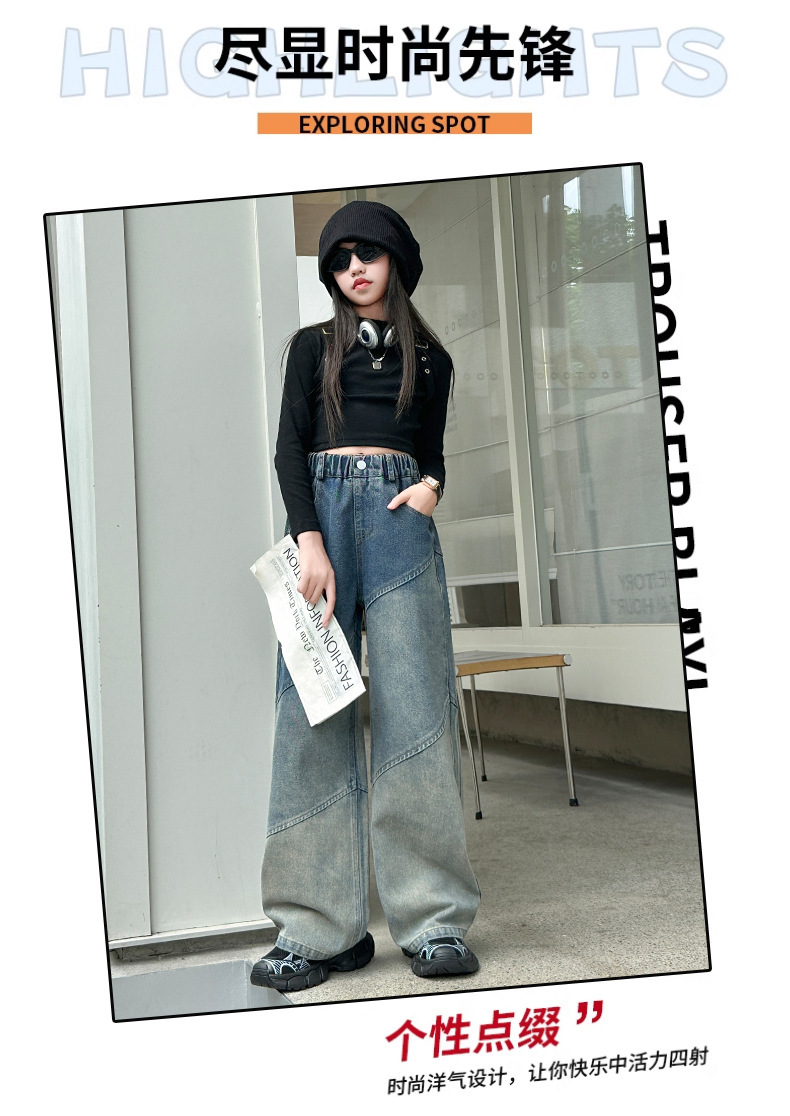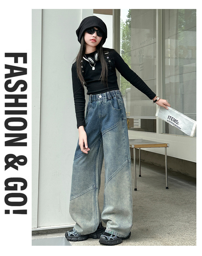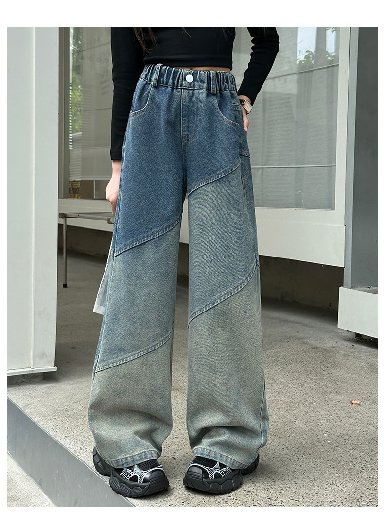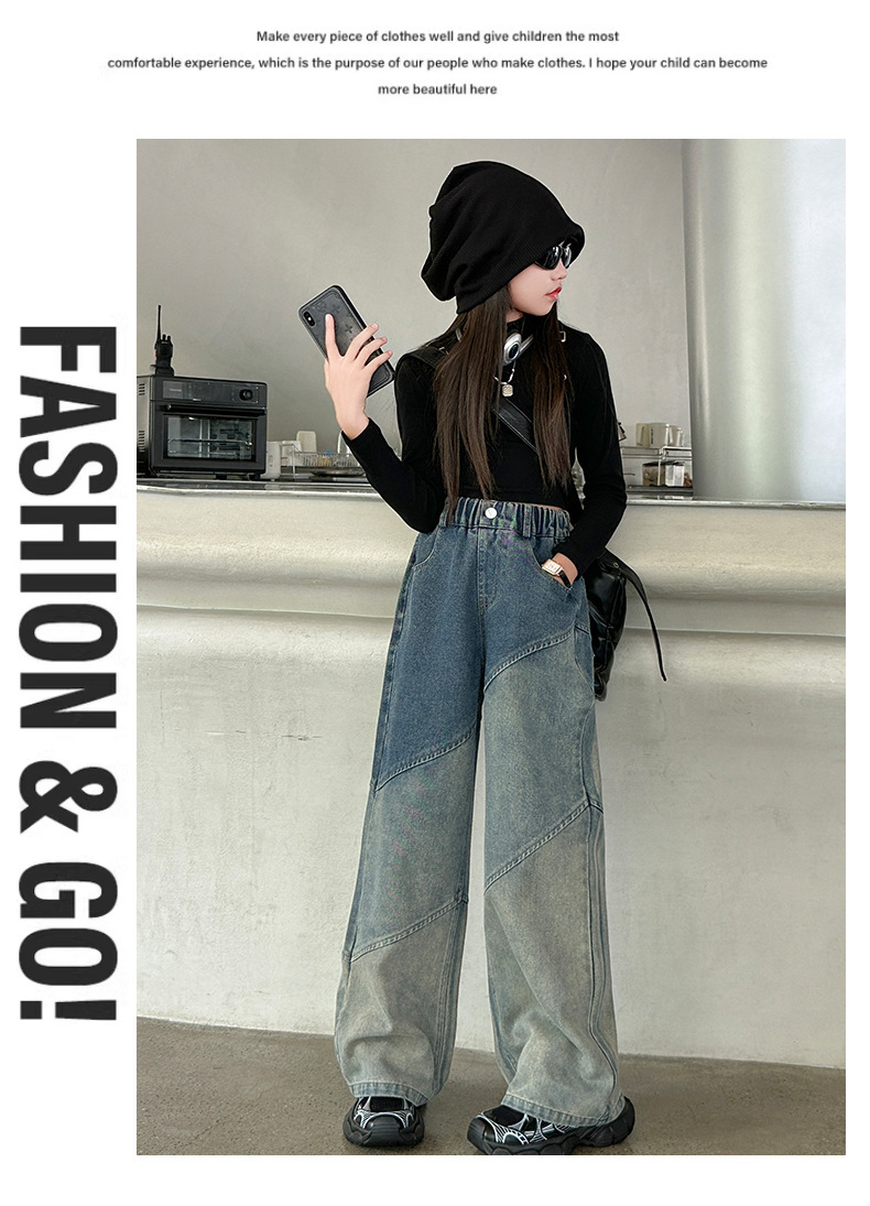 소녀의 봄과 가을 새로운 청바지 2024 모든 경기 서양 스타일 폐기물 지구 스타일 느슨한 슬리밍 스트레이트 바지 어린이 캐주얼 바지스토어 가기