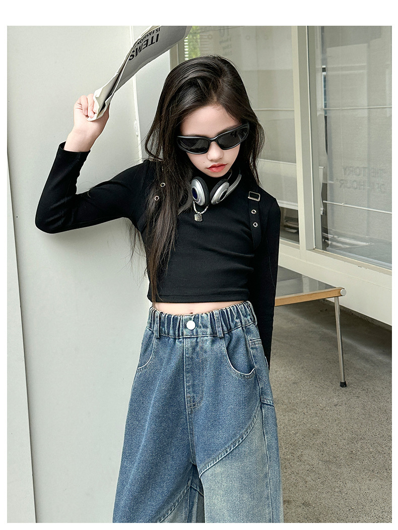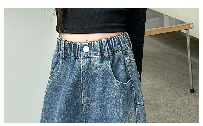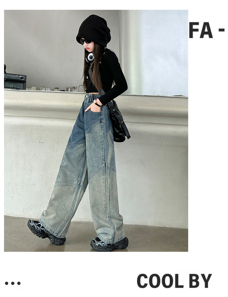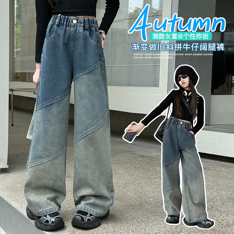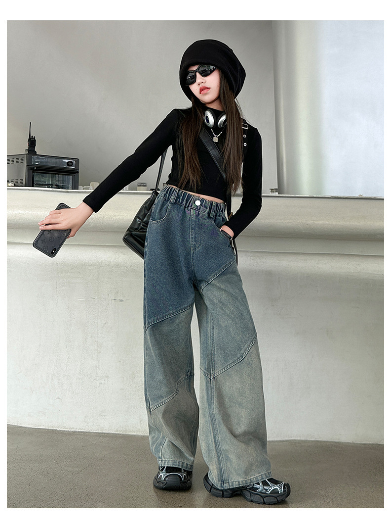 소녀의 봄과 가을 새로운 청바지 2024 모든 경기 서양 스타일 폐기물 지구 스타일 느슨한 슬리밍 스트레이트 바지 어린이 캐주얼 바지