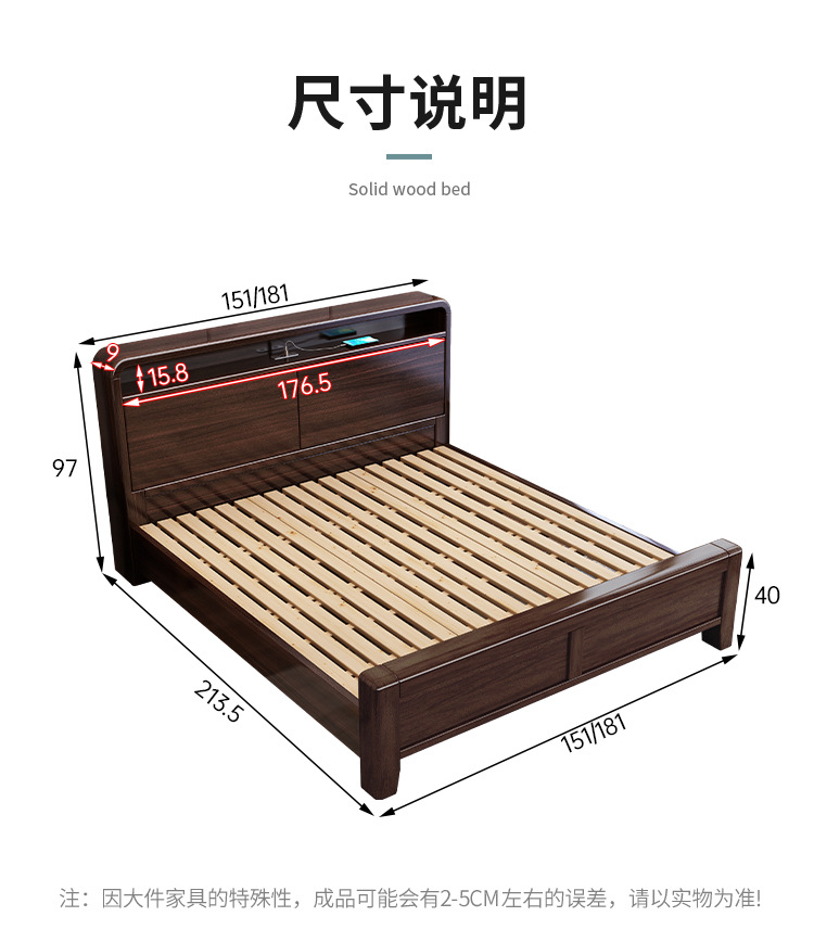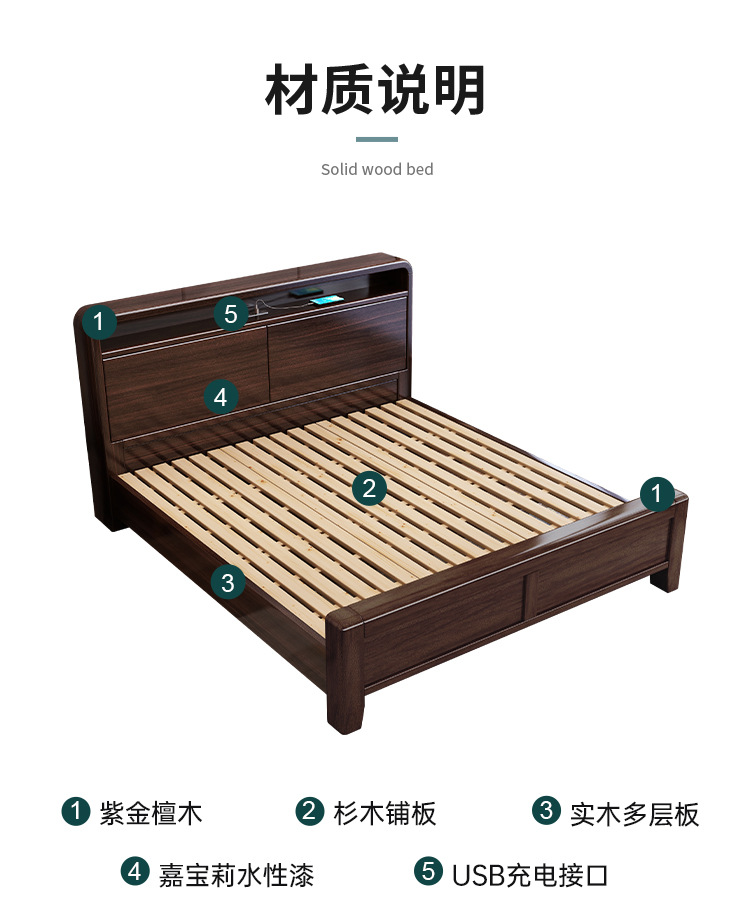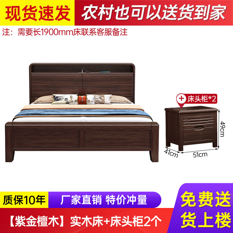 새로운 중국 스타일의 퍼플 골드 샌달 우드 솔리드 우드 침대 현대 간단한 1.8 m 더블 침대 두꺼운 충전식 1.5 m 저장 침대