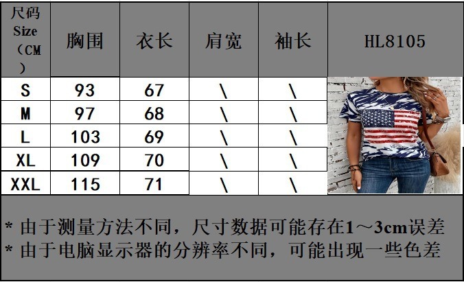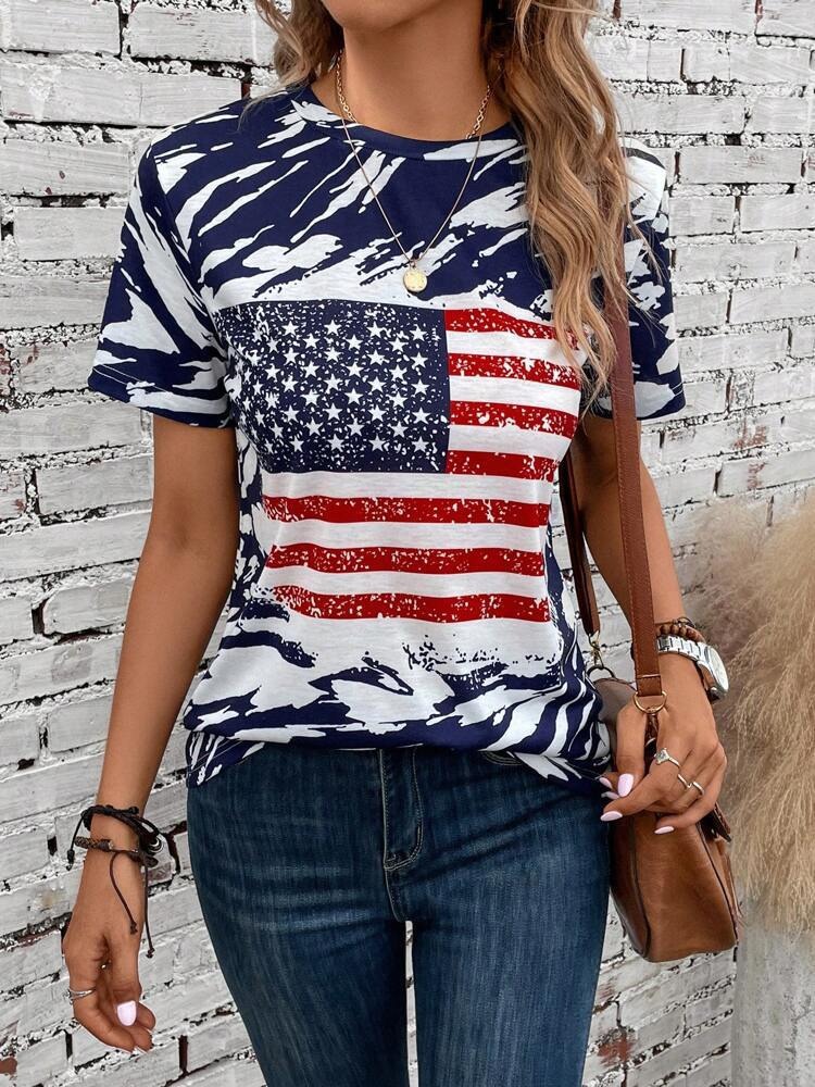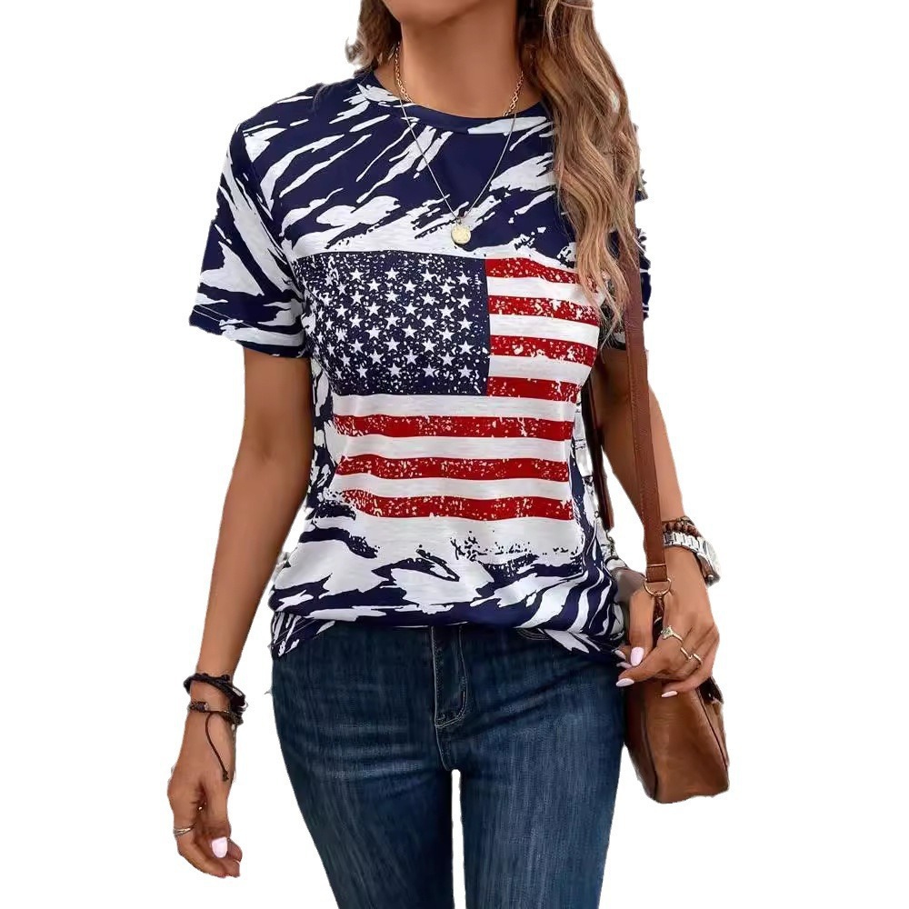 2024 봄과 여름 아마존 국경 유럽 및 미국의 새로운 TEMU 깃발 인쇄 티셔츠 라운드 넥 캐주얼 여성 반팔 티셔츠스토어 가기