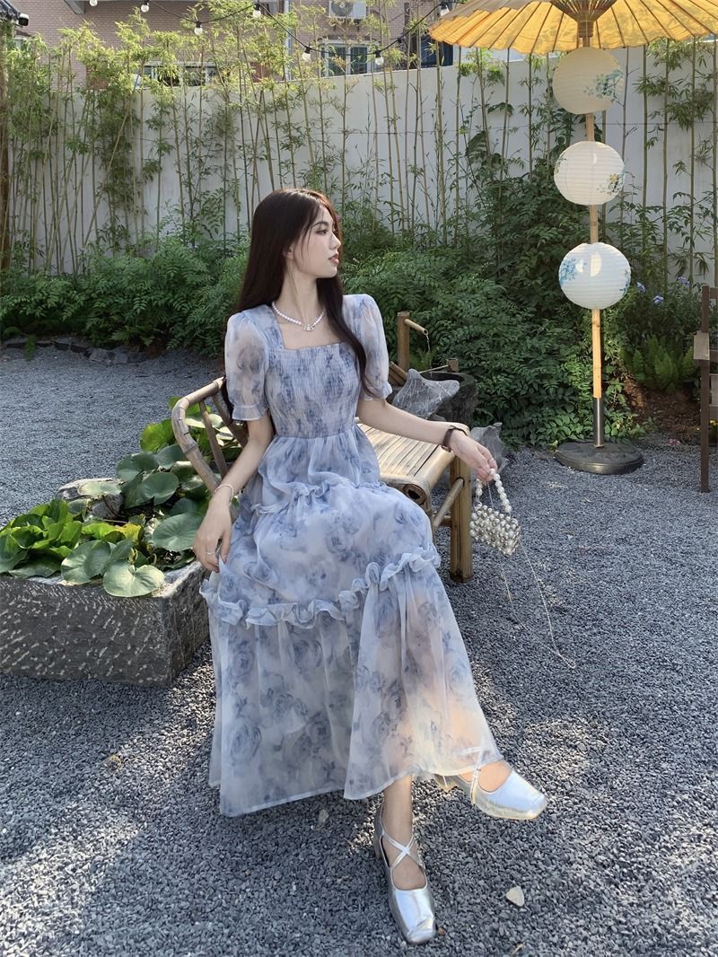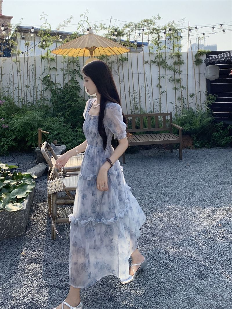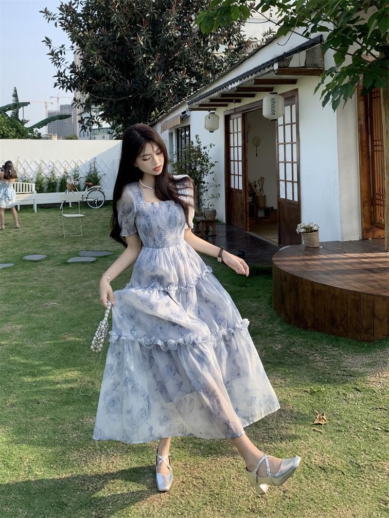 빈티지 스퀘어 칼라 플로랄 원피스 여성 여름 2024 새로운 슈퍼 페어리 스타일 슬림 핏 허리 긴 스커트스토어 가기