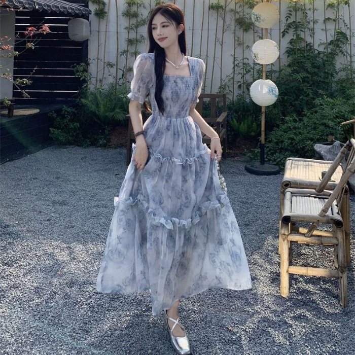 빈티지 스퀘어 칼라 플로랄 원피스 여성 여름 2024 새로운 슈퍼 페어리 스타일 슬림 핏 허리 긴 스커트