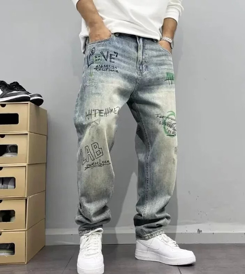 고급 낙서 손으로 그린 Duffy Shuai Chao 브랜드 Ins 미국 청바지 남자의 느슨한 작은 직선 봄과 가을 긴 바지스토어 가기