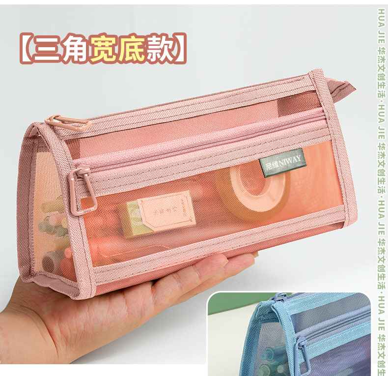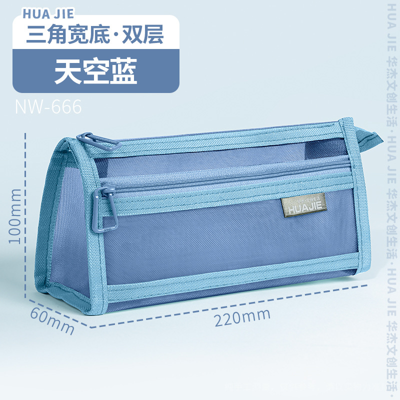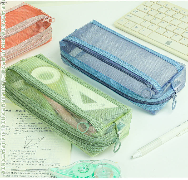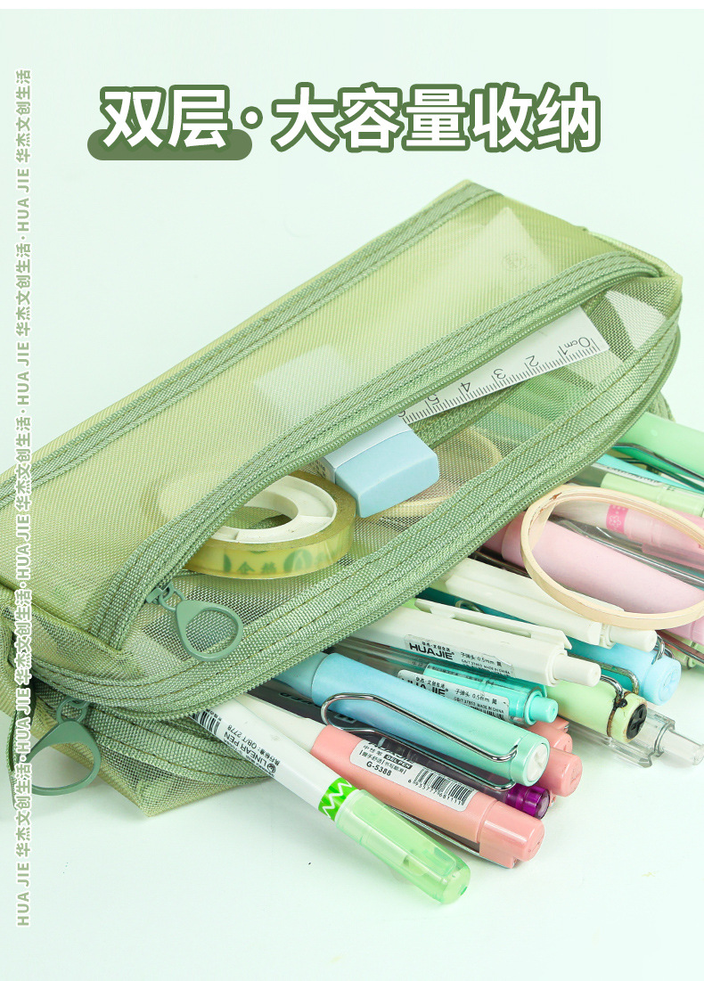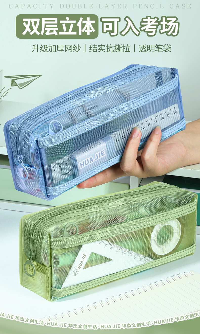 Huajie 메쉬 연필 가방 더블 레이어 대용량 투명 문구 가방 학생 시험 연필 가방 높은 색상 값 간단한