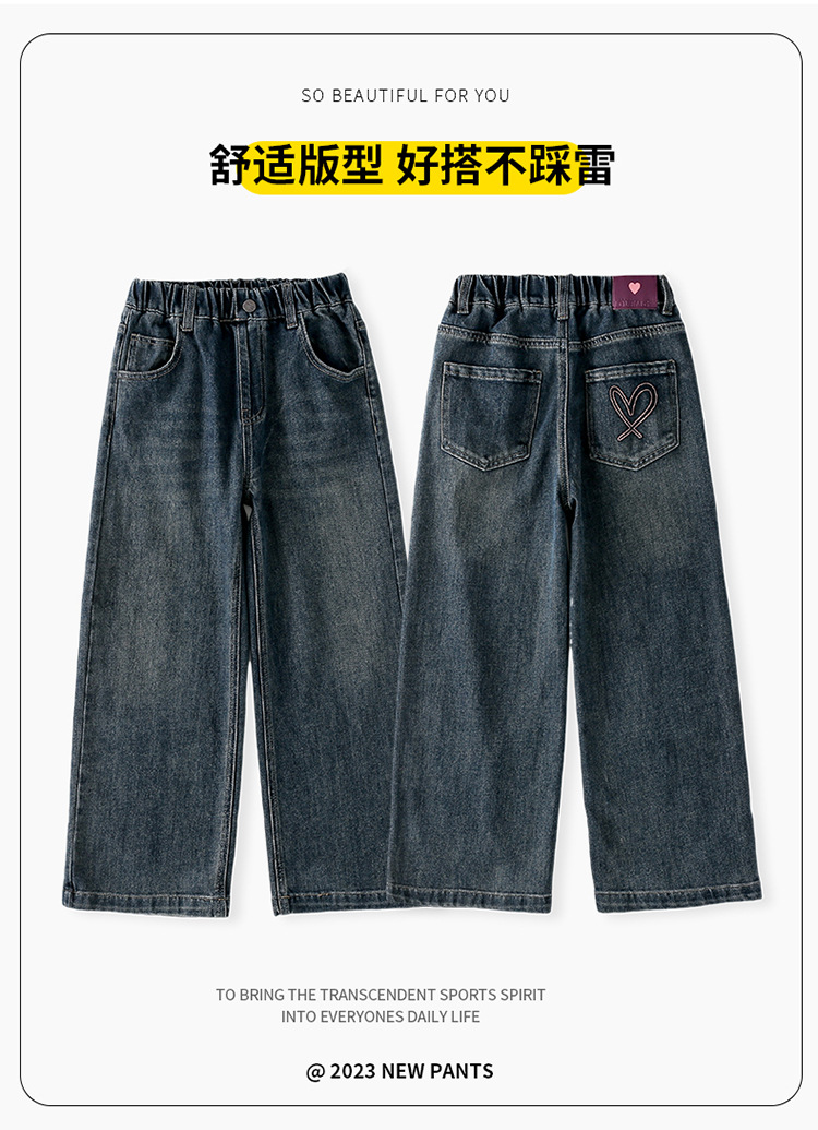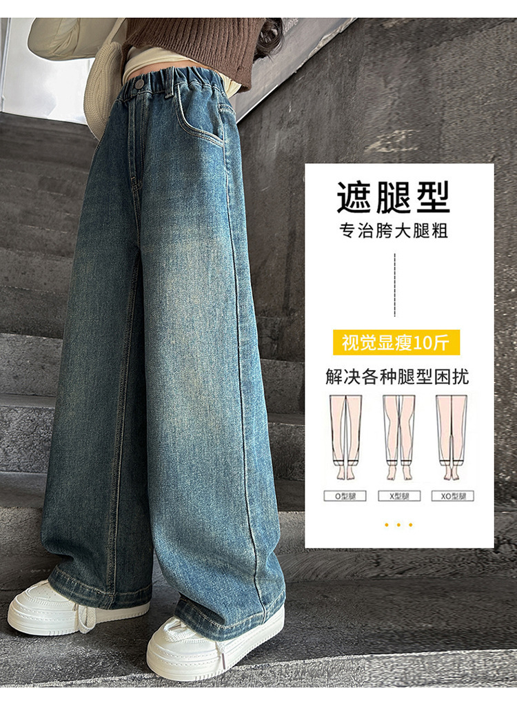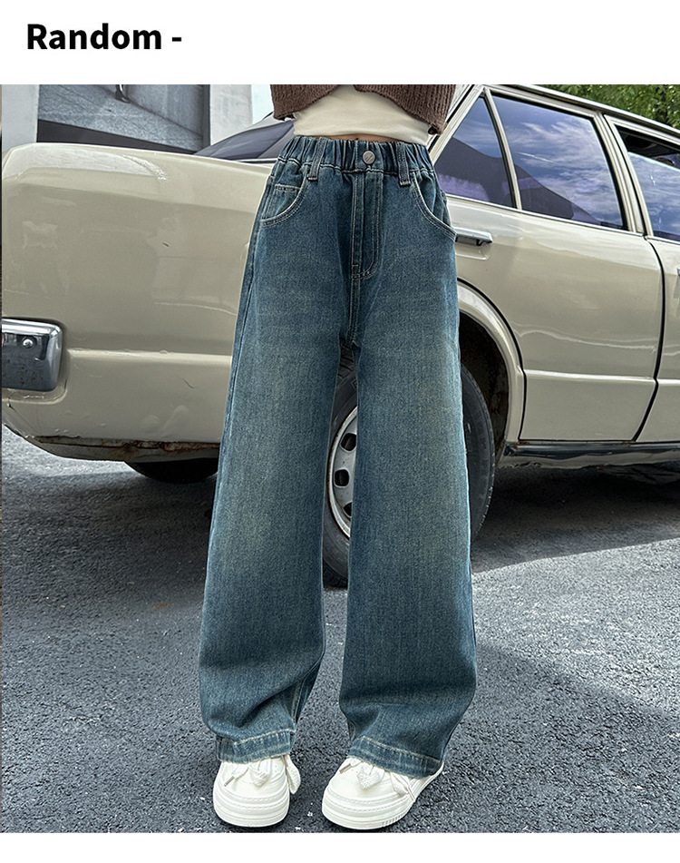 가을 2024 새로운 소녀 청바지 대형 어린이 데님 넓은 다리 바지 패션 올매치 다크 블루 캐주얼 바지스토어 가기