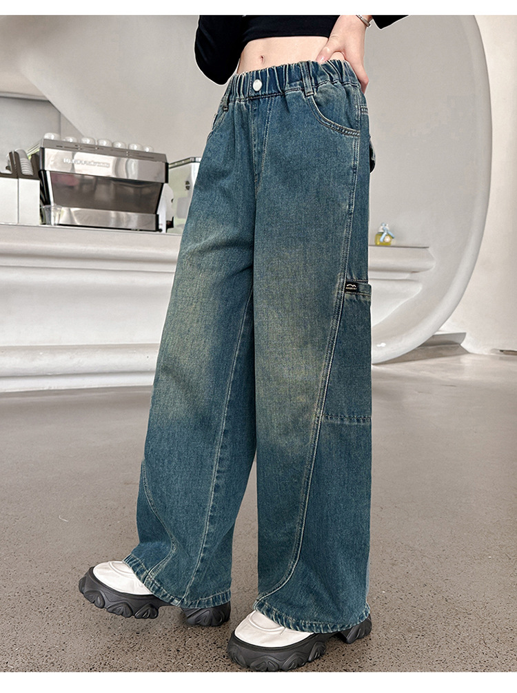 2024 아동복 소녀 가을 새 청바지 대형 포켓 와이드 다리 바지 힙합 서양식 캐주얼 바지