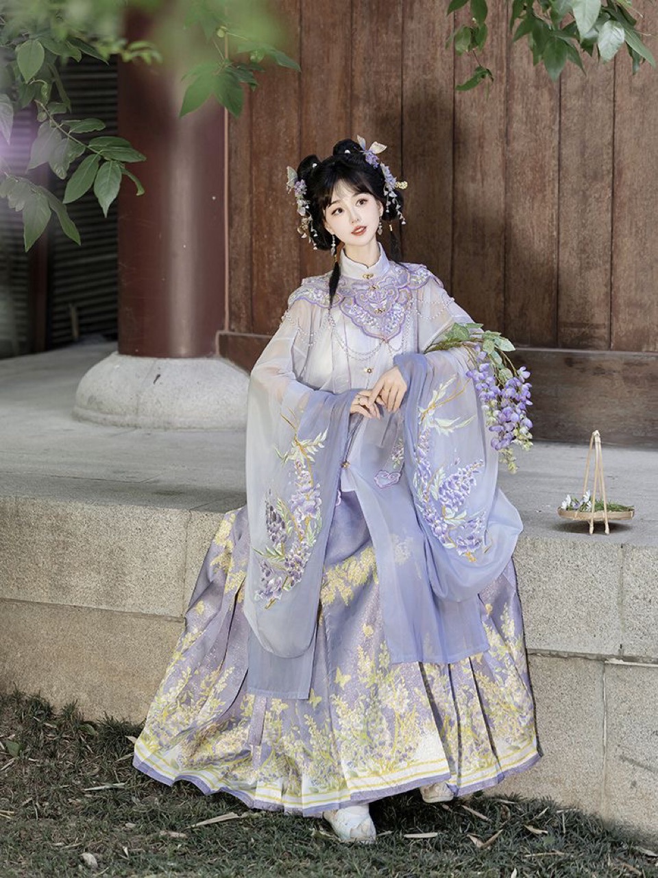 성인 한푸 여성 명나라 만든 보라색 녹색 등나무 중공업 자수 골동품 구름 어깨 가슴 큰 소매 셔츠 봄과 가을 세트 사진