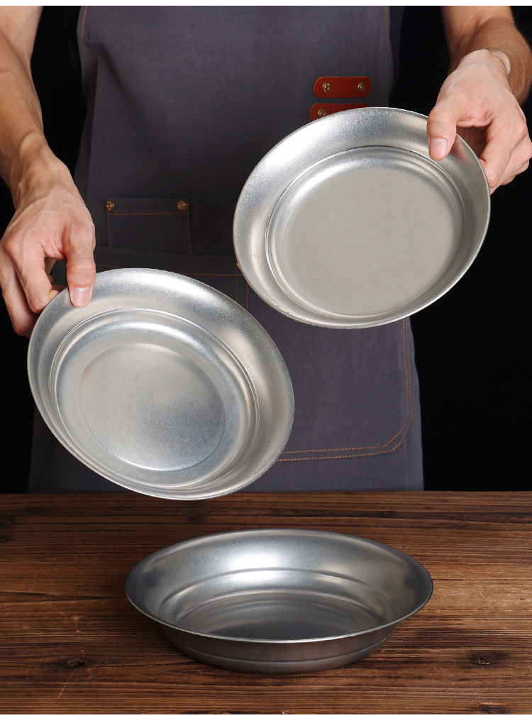 빈티지 오래된 스테인레스 스틸 플레이트 라운드 파스타 플레이트 바베큐 샐러드 스테이크 플레이트 크리에이티브 디저트 스낵 플레이트 디너 플레이트