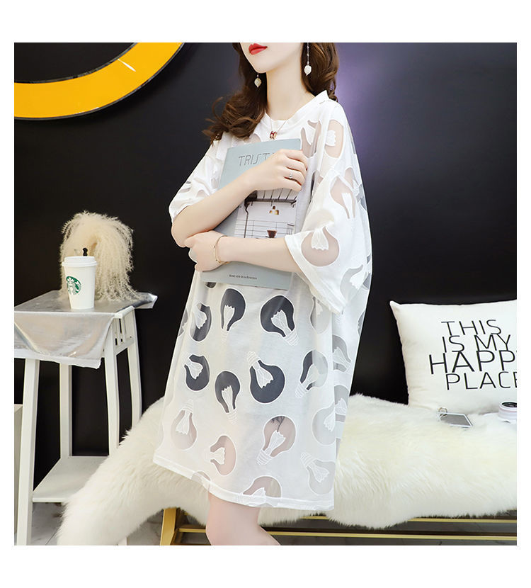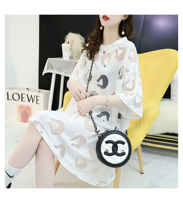 느슨한 디자인 센스 탑 의류 반팔 티셔츠 유행 2024 여름 여성을위한 새로운 중간 길이 중공 반팔 티셔츠스토어 가기