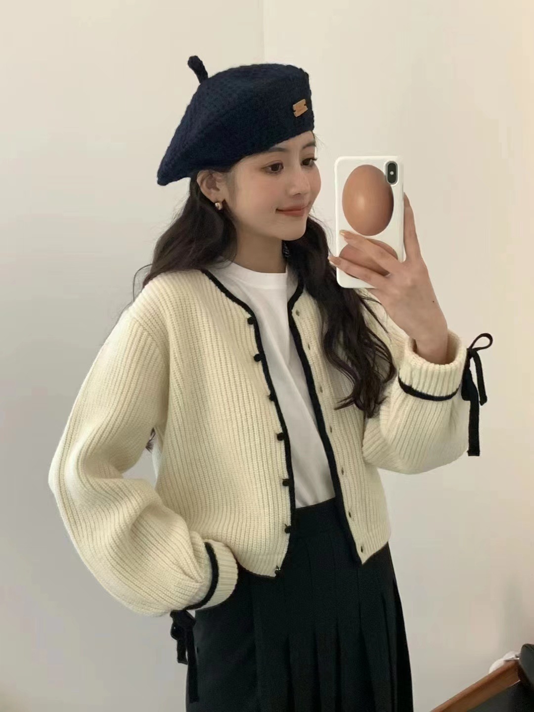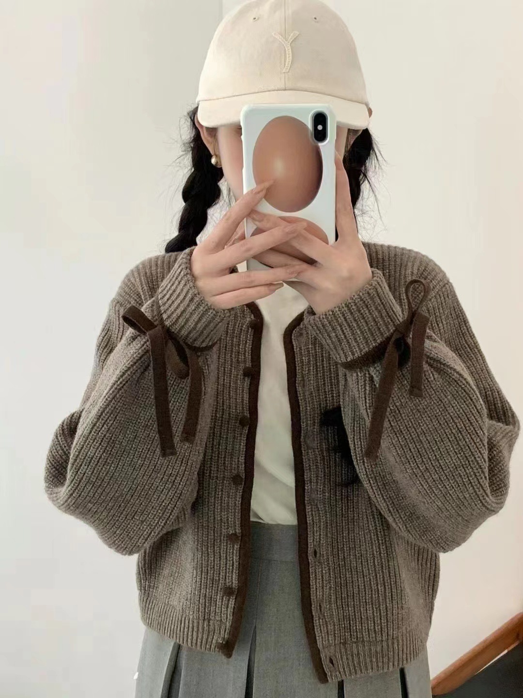 샤넬 스타일 활 레이스 업 그레이 니트 카디건 여성 봄과 가을 모헤어 소프트 왁스 스웨터 코트 쇼트 탑