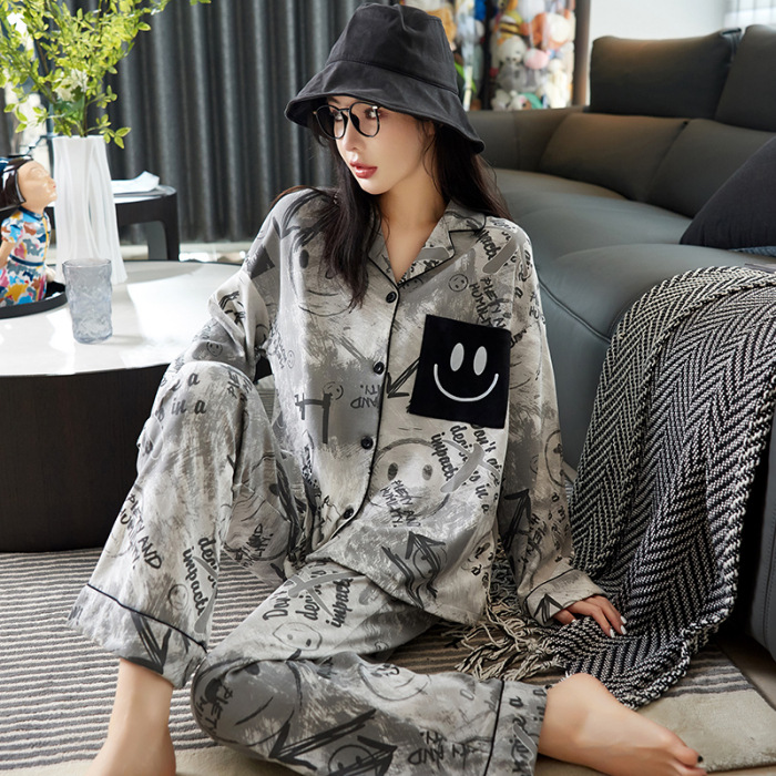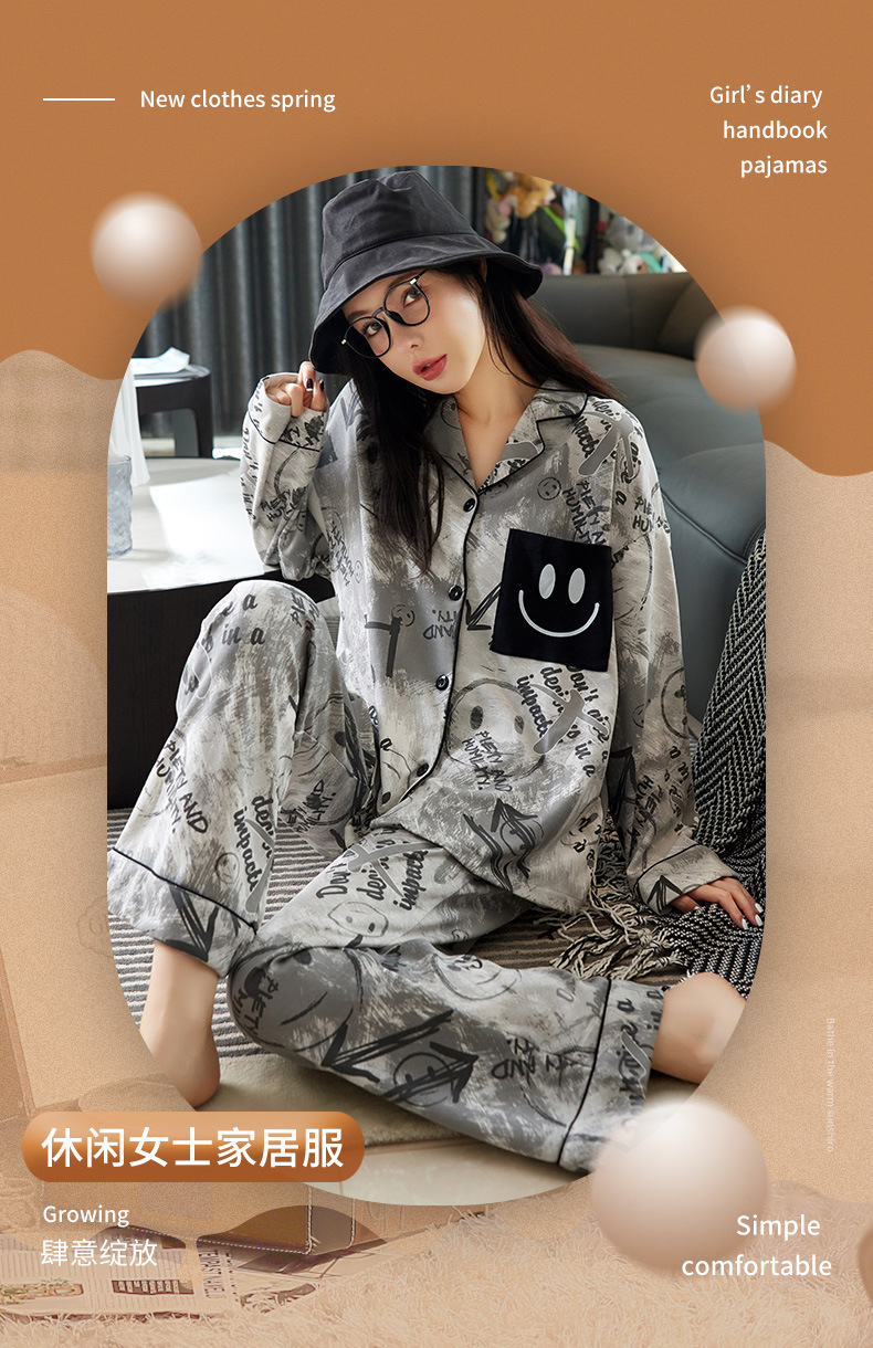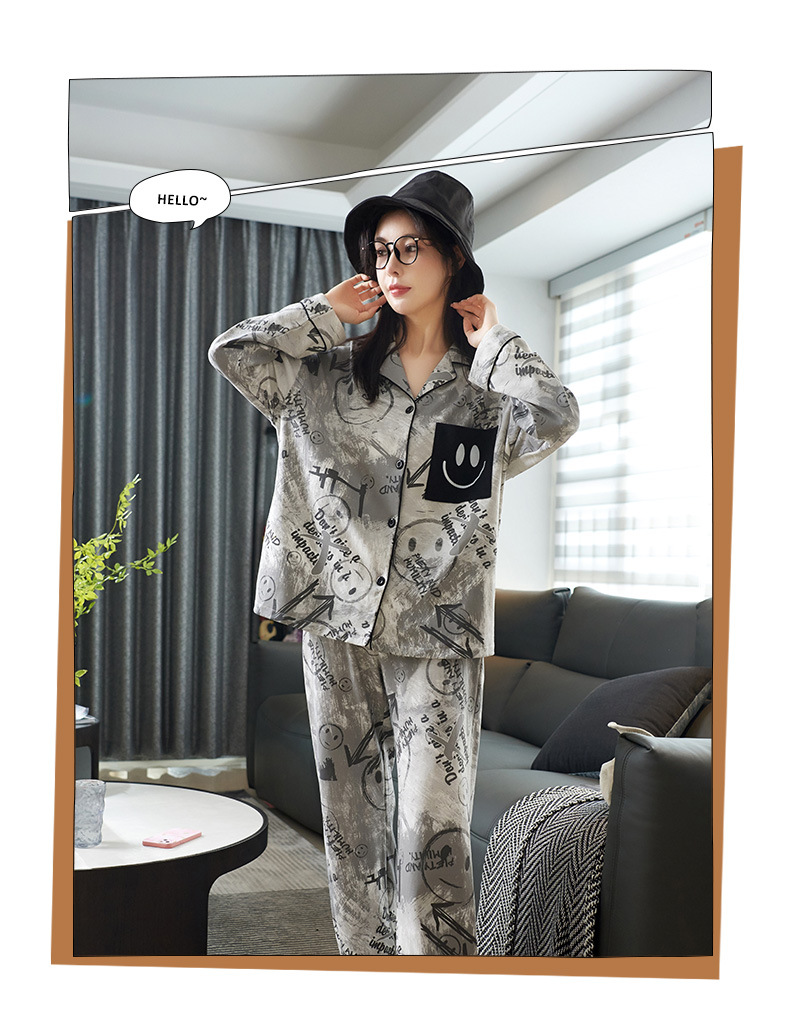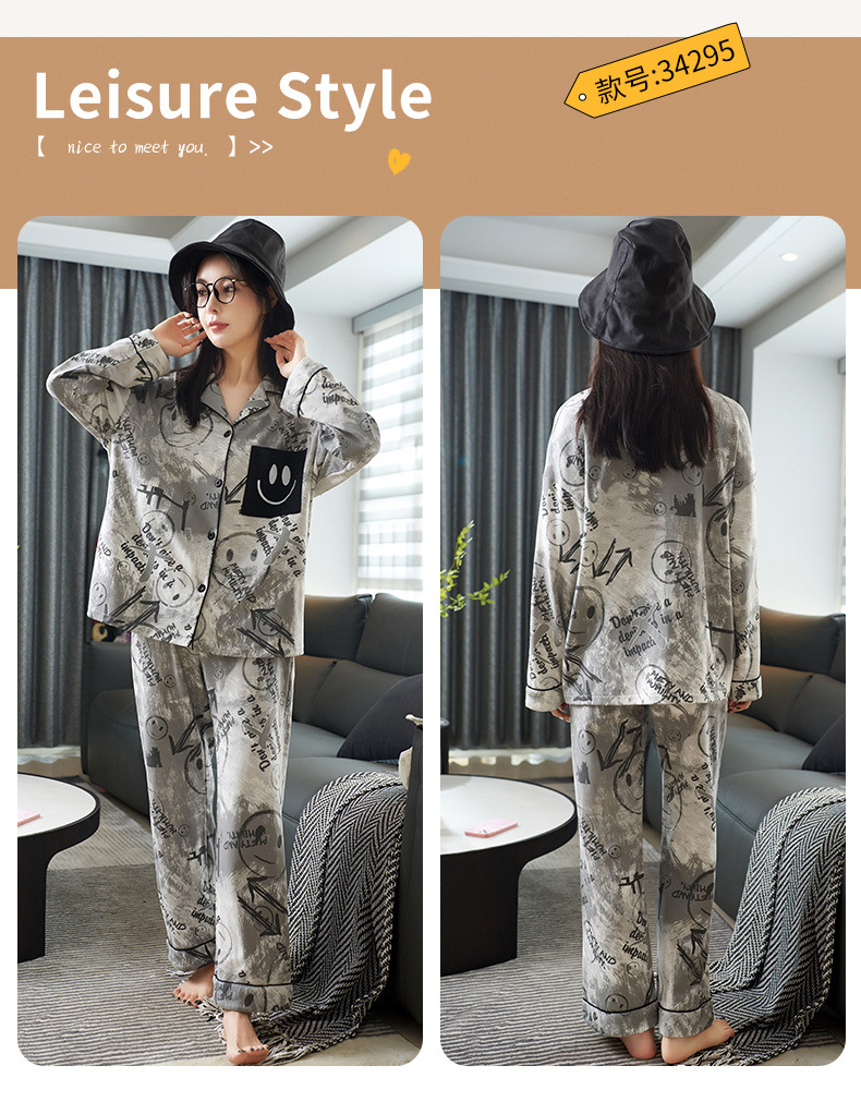 봄과 가을 새로운 도착 파자마 여성용 카디건 옷깃 긴 소매 모조 면 바지 세트 만화 달콤한 집 옷스토어 가기