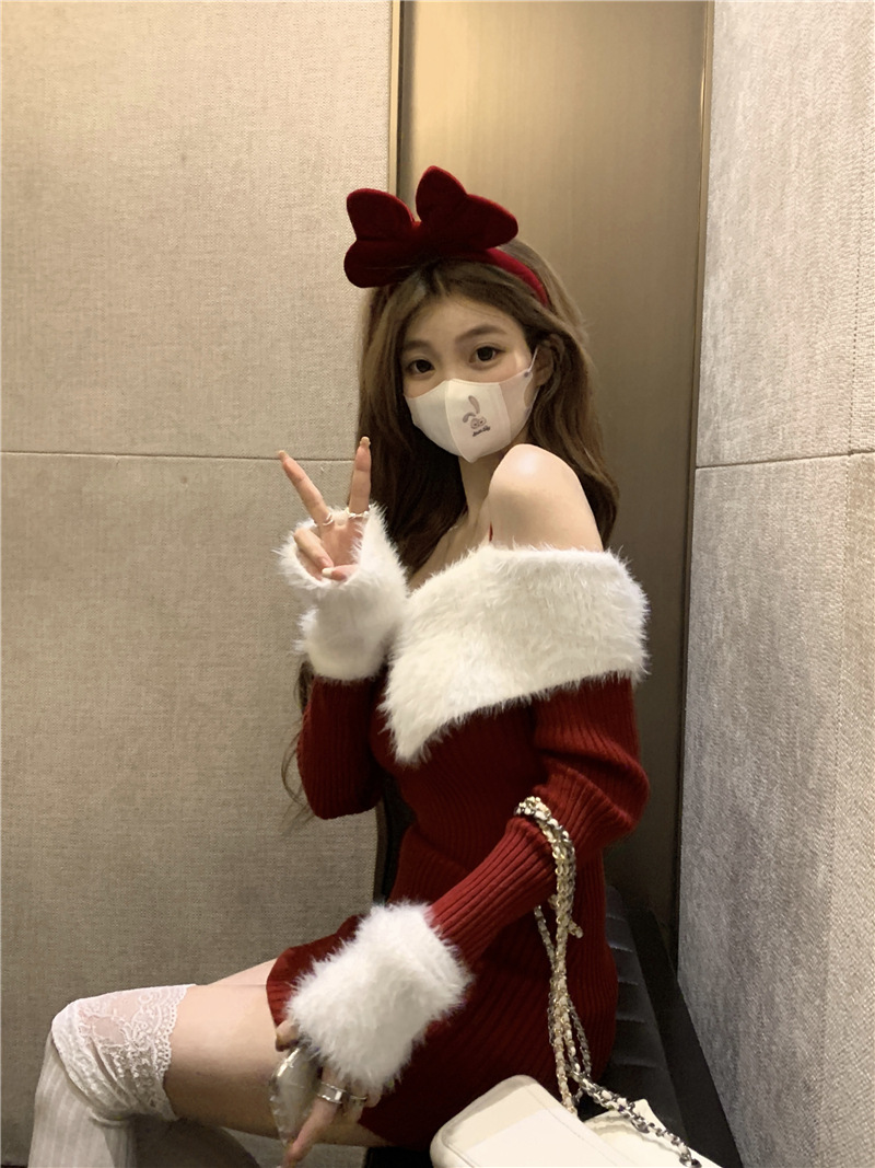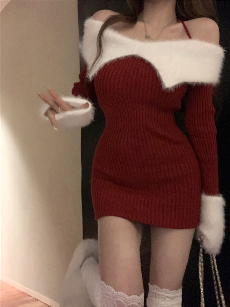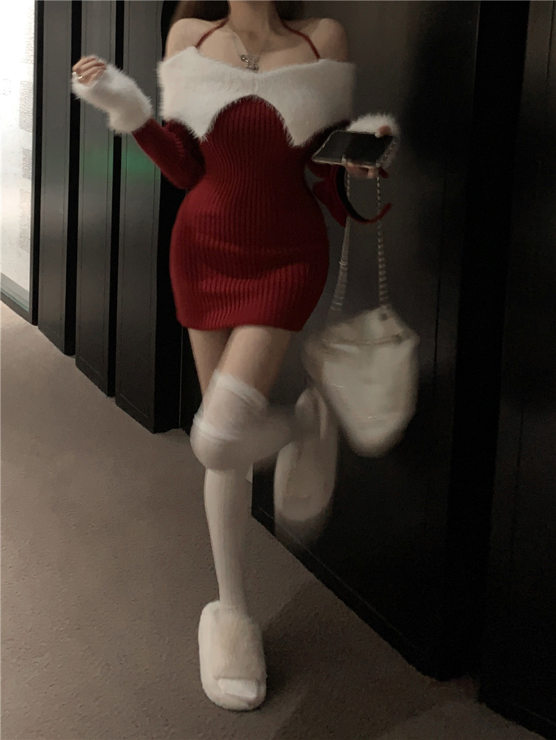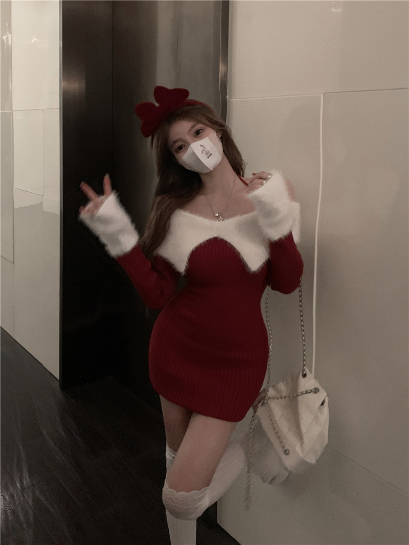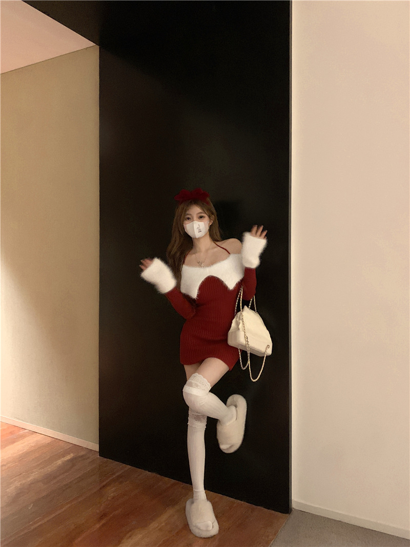 가을과 겨울 새로운 빨간 크리스마스 분위기 섹시한 엉덩이 스커트 여성 어깨 니트 스웨터 원피스 여성 의류스토어 가기