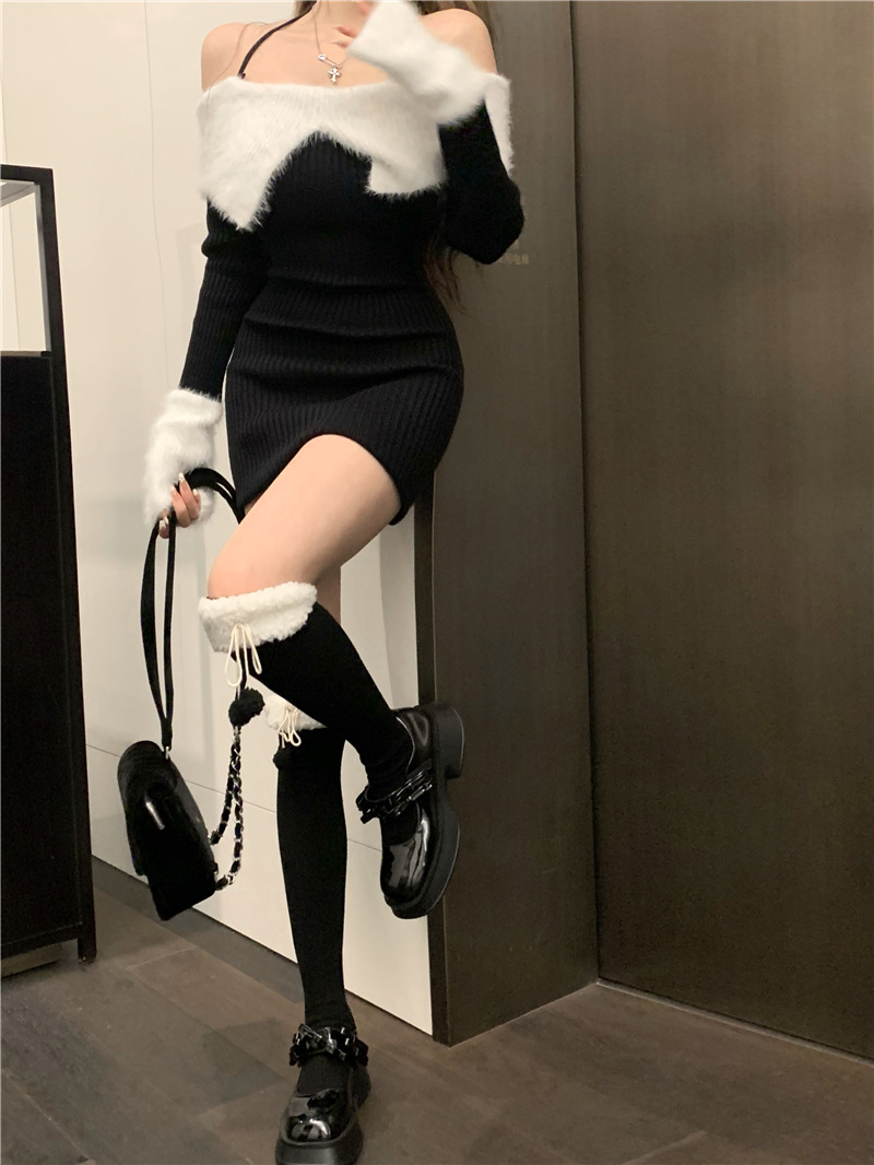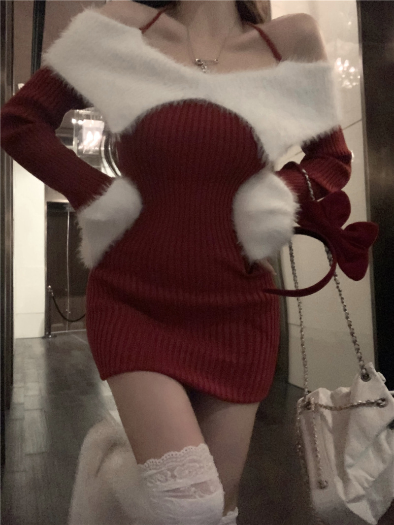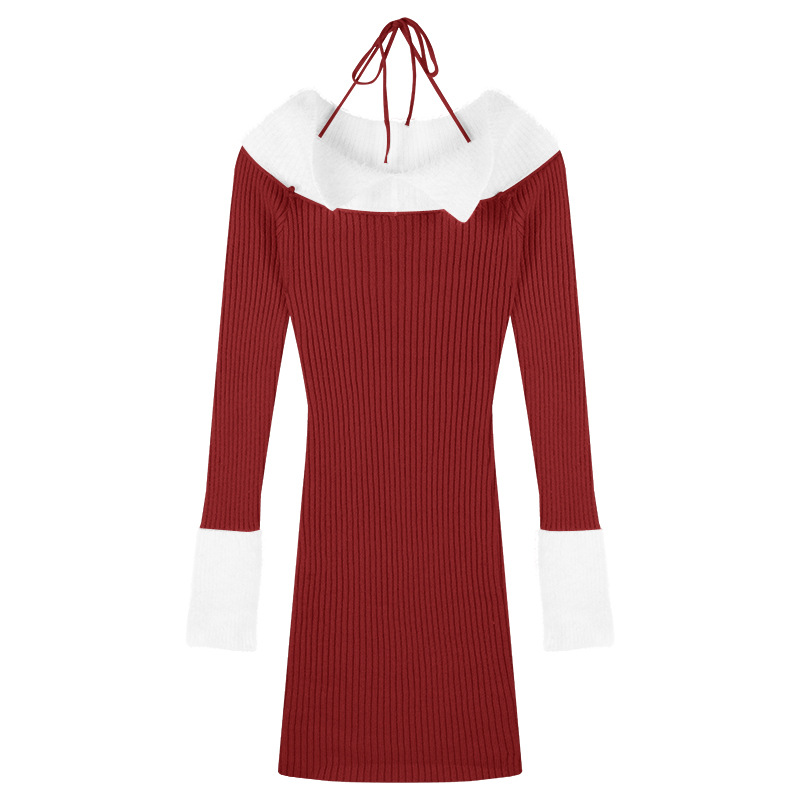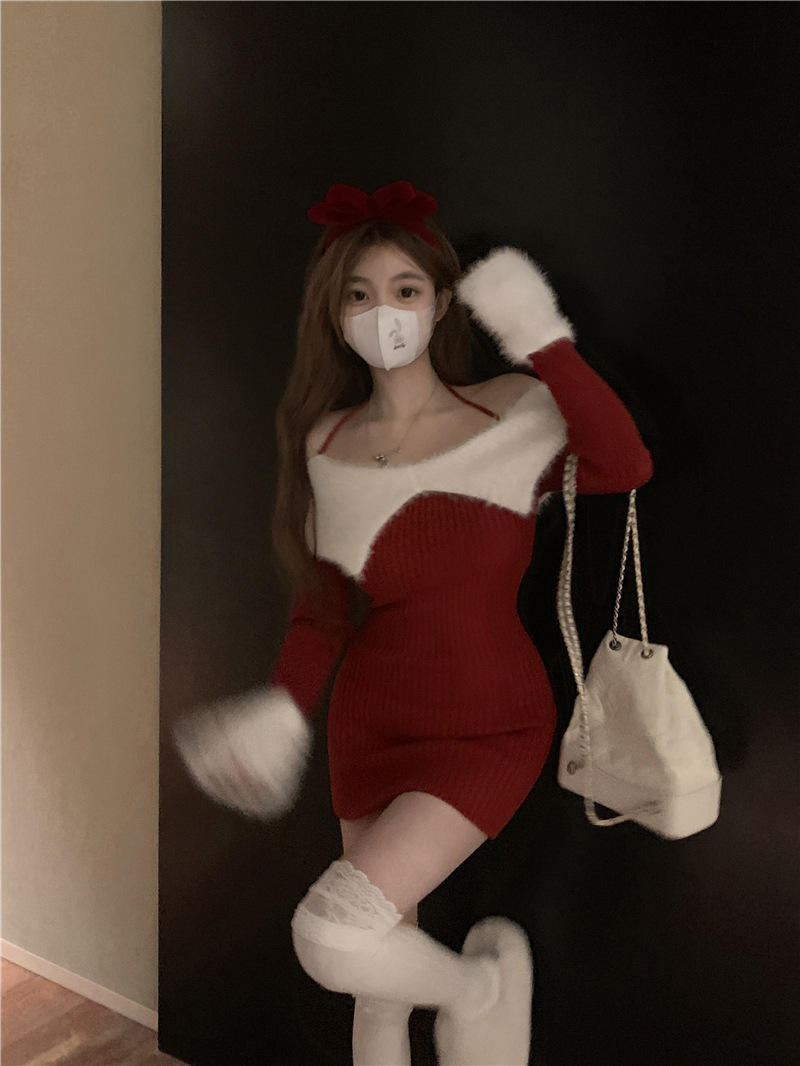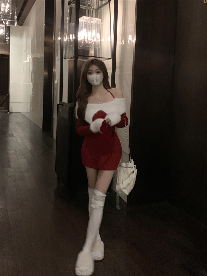 가을과 겨울 새로운 빨간 크리스마스 분위기 섹시한 엉덩이 스커트 여성 어깨 니트 스웨터 원피스 여성 의류스토어 가기